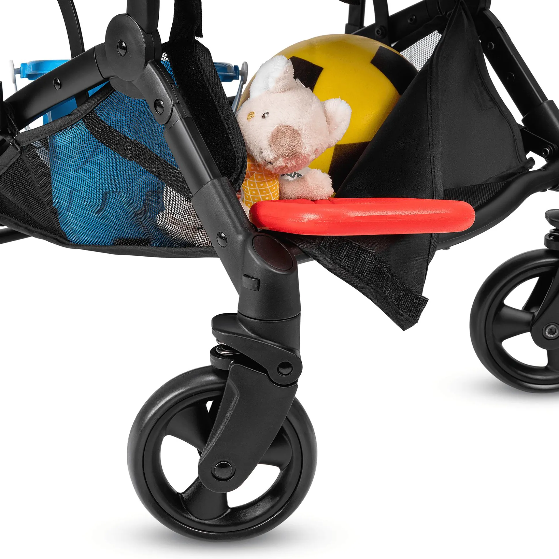 Für einen schnellen Transport oder zum Verstauen kannst du den Key II, der bis zu einem Gewicht von 22 kg geeignet ist, einfach zusammenklappen und an dem Gurtband aufhängen. Ein weiteres Highlight ist der große Korb, der genug Platz für eure Habseligkeiten bietet.