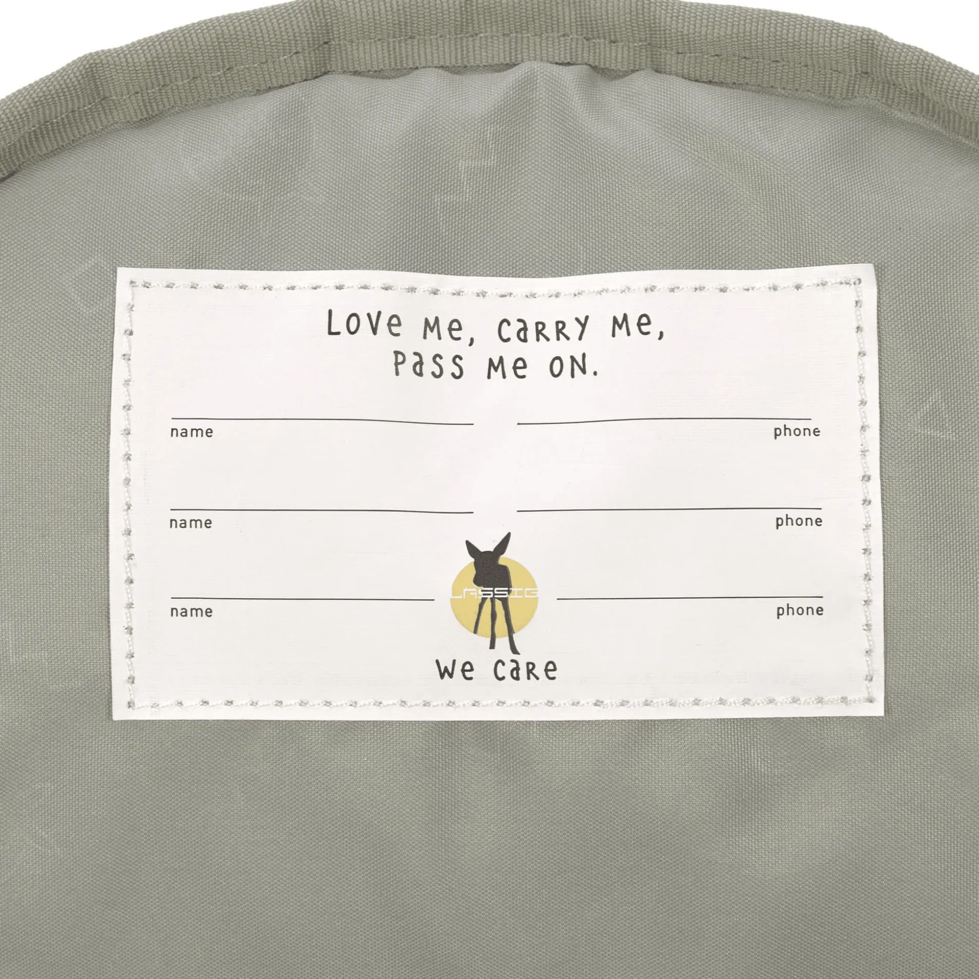 Das Namensschild auf der Innenseite des Rucksacks schließt Verwechslungen aus.