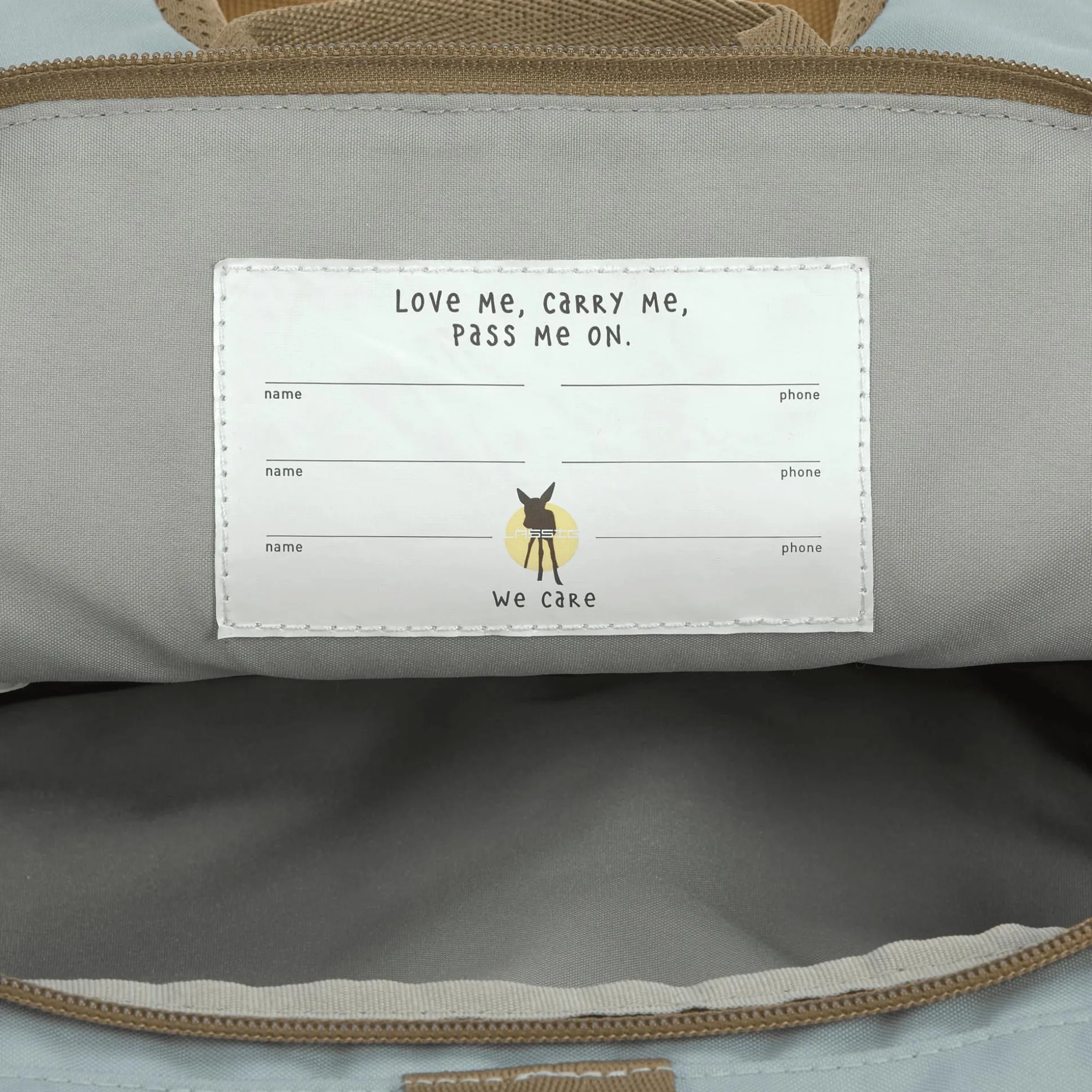 Der Kinderrucksack in schlichten, natürlichen Farben ist mit praktischem Features wie Karabinern, Reflektoren und einem Namensschild ausgestattet.