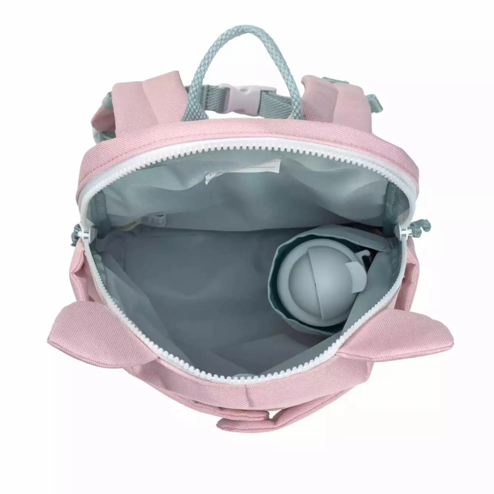 Der wasserabweisende Kinderrucksack hat ein geräumiges Hauptfach, höhenverstellbare Schulter- und Brustgurte, einen Trinkflaschenhalter im Inneren sowie ein Namensschild, um Verwechselungen auszuschließen. Im zusätzlichen Reißverschlussfach außen, das sich seitlich am Rückenteil befindet, lassen sich wichtige Sachen aufbewahren.