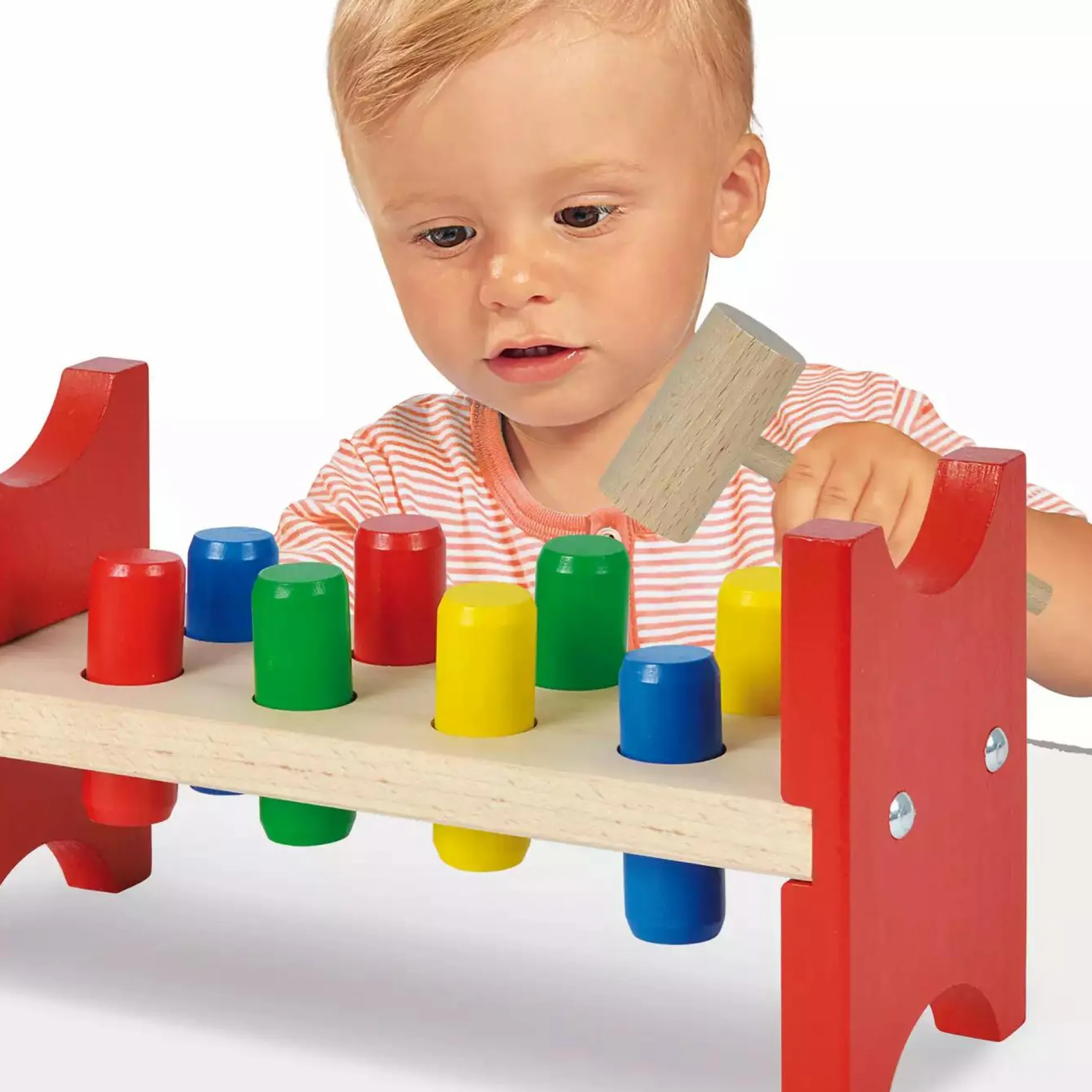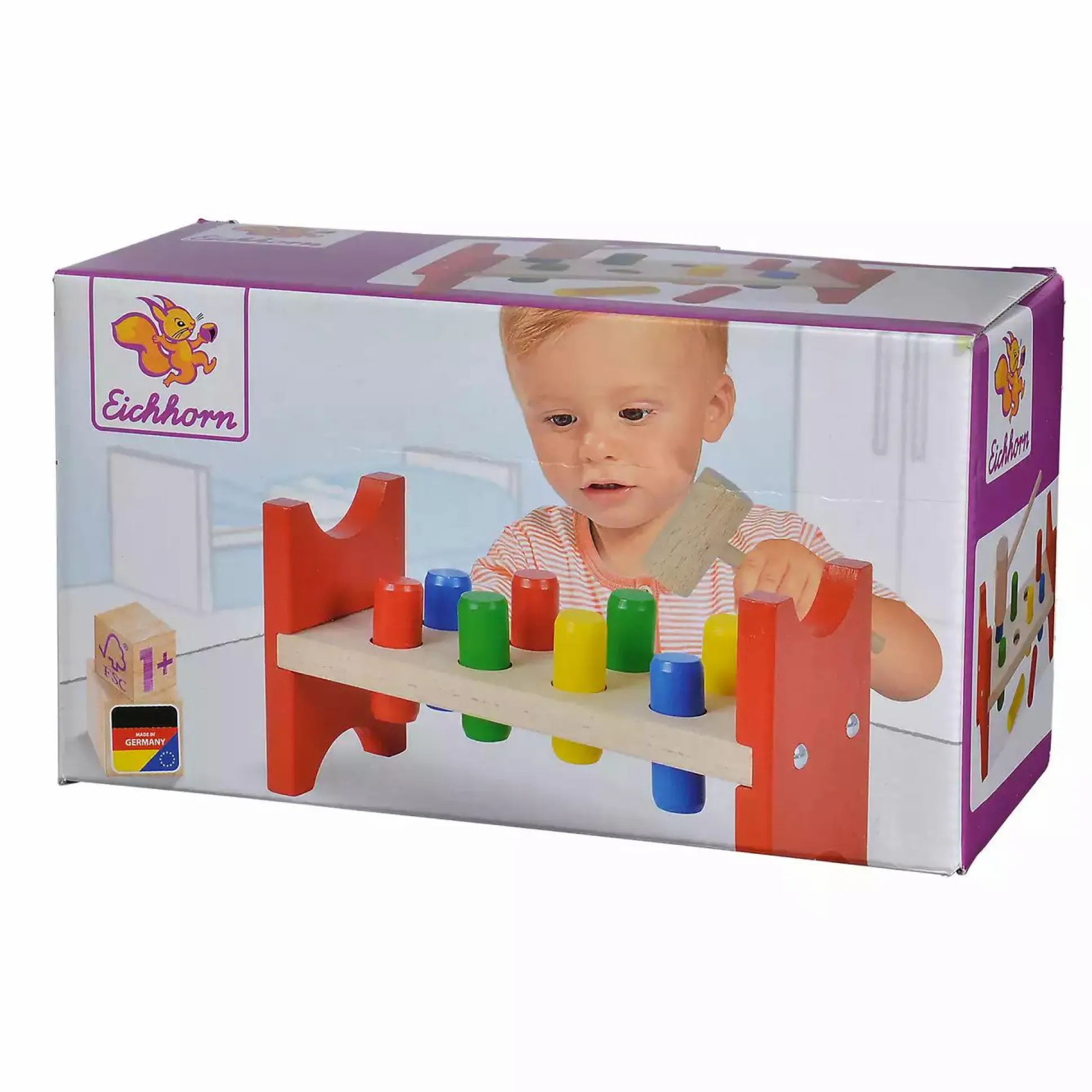 Die Eichhorn Klopfbank ist für Kinder ab einem Jahr geeignet und fördert die Motorik auf spielerische Art und Weise. Die acht bunten Stifte müssen mit dem Hammer durch die Löcher der Klopfbank geschlagen werden.