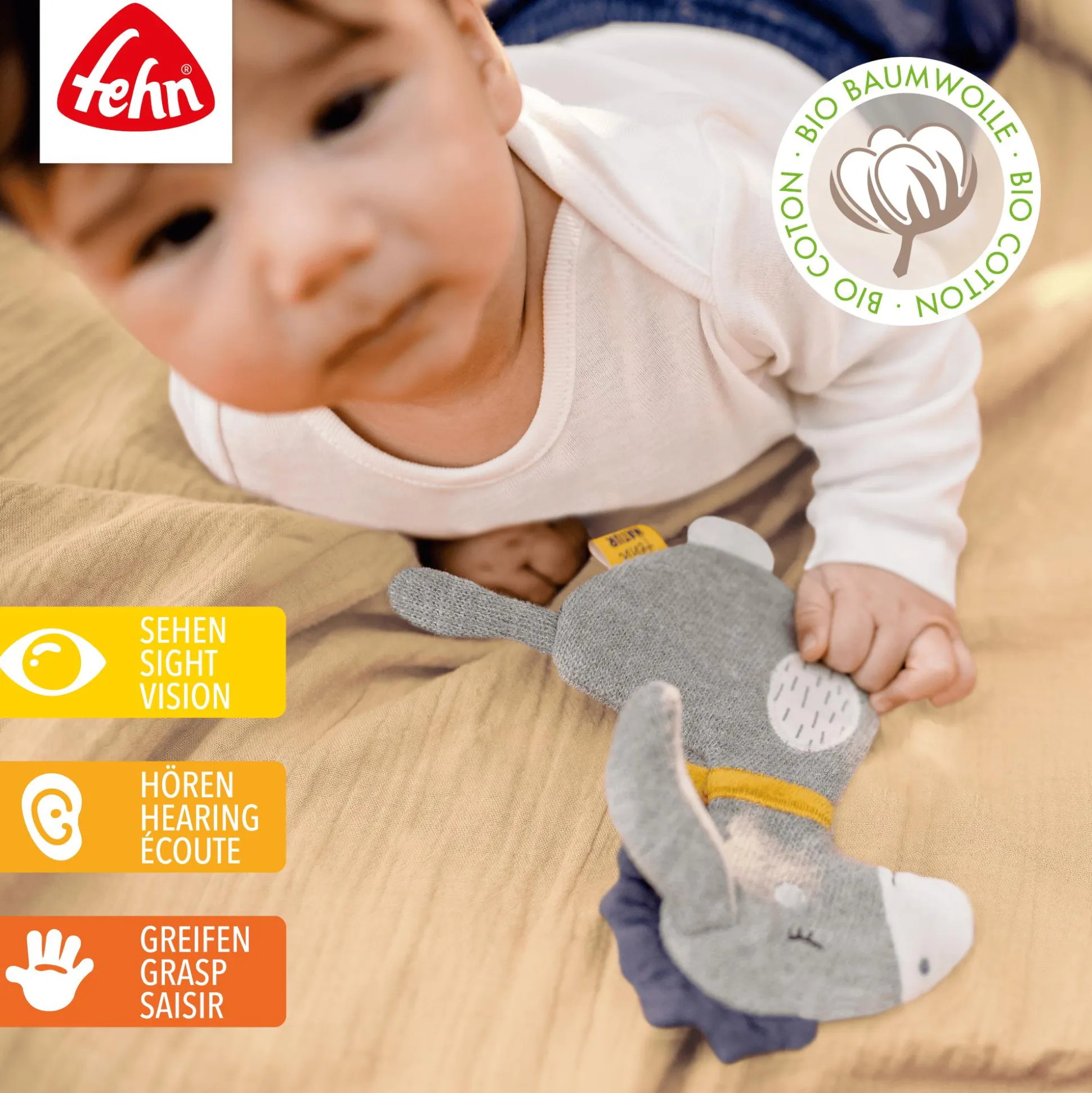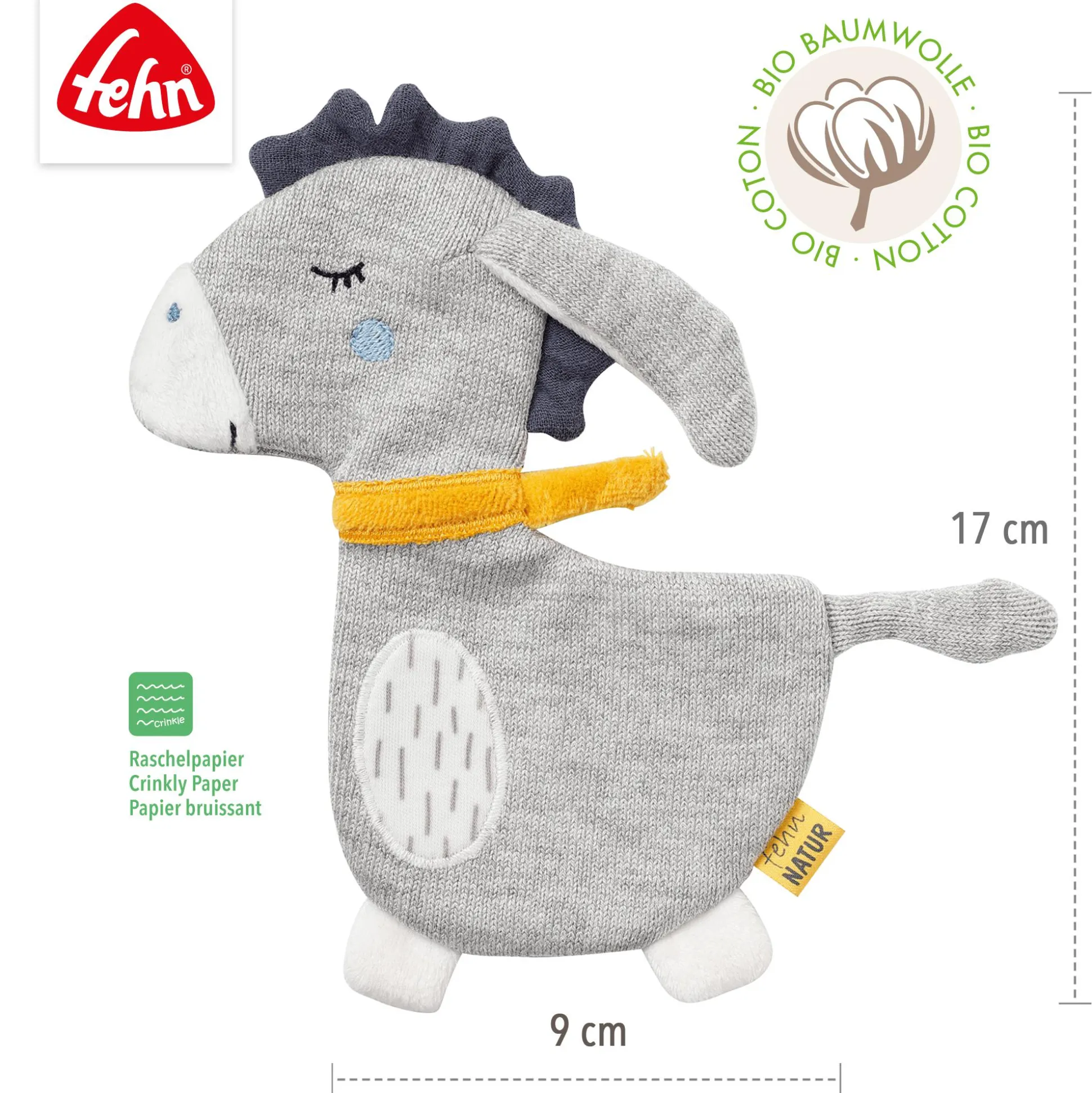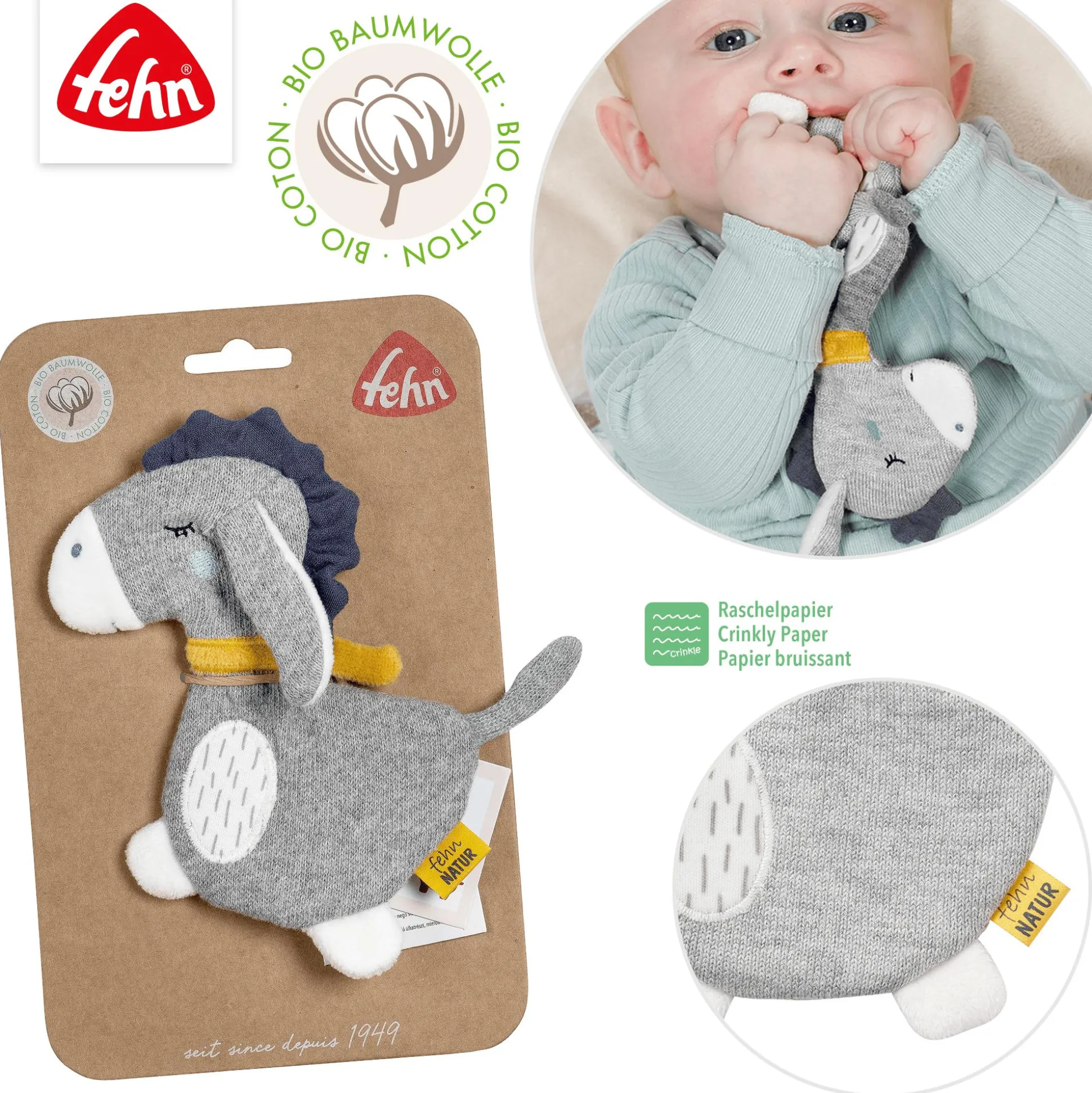 Der niedliche Knister-Esel von fehn ist ein tolles erstes Spielzeug für deinen kleinen Liebling. Dieser kuschelige Begleiter ist perfekt auf die Bedürfnisse deines Kindes abgestimmt, denn er besteht aus einem cleveren Materialmix und Raschelpapier, das neugierige Hände und winzige Finger spielerisch erkunden können. Der Esel wurde aus hochwertigem Strick, Jersey, Nicki und Musselin gefertigt, um die zarte Babyhaut zu verwöhnen – alles aus 100% Bio-Baumwolle.Dein kleiner Schatz kann sich von Geburt an in die Welt des Knisterspaßes stürzen und dabei seine Sinne entfalten.