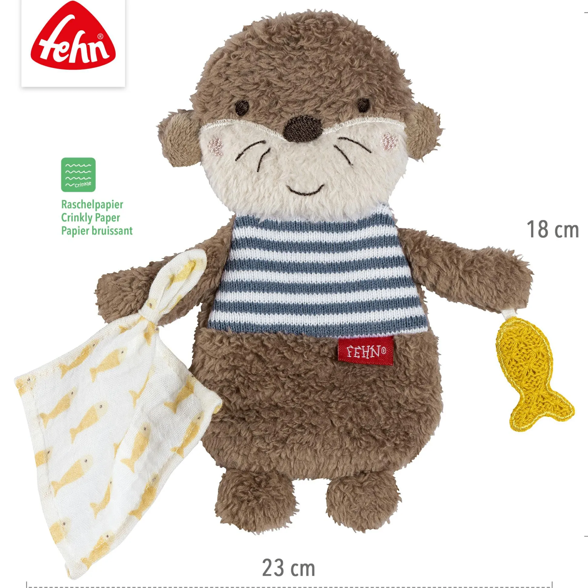 Zwischen deinem Baby und dem Knister-Otter Theo von fehn knistert es. Dein Liebling wird von dem kuscheligen Otter ganz begeistert sein. Das Raschelpapier im Innern des Kuscheltieres animiert zum Greifen und Ertasten des Ottes und fördert so neben der Motorik auch den Hörsinn. Dank seiner handlichen Größe kann er auch überall mit hingenommen werden.
