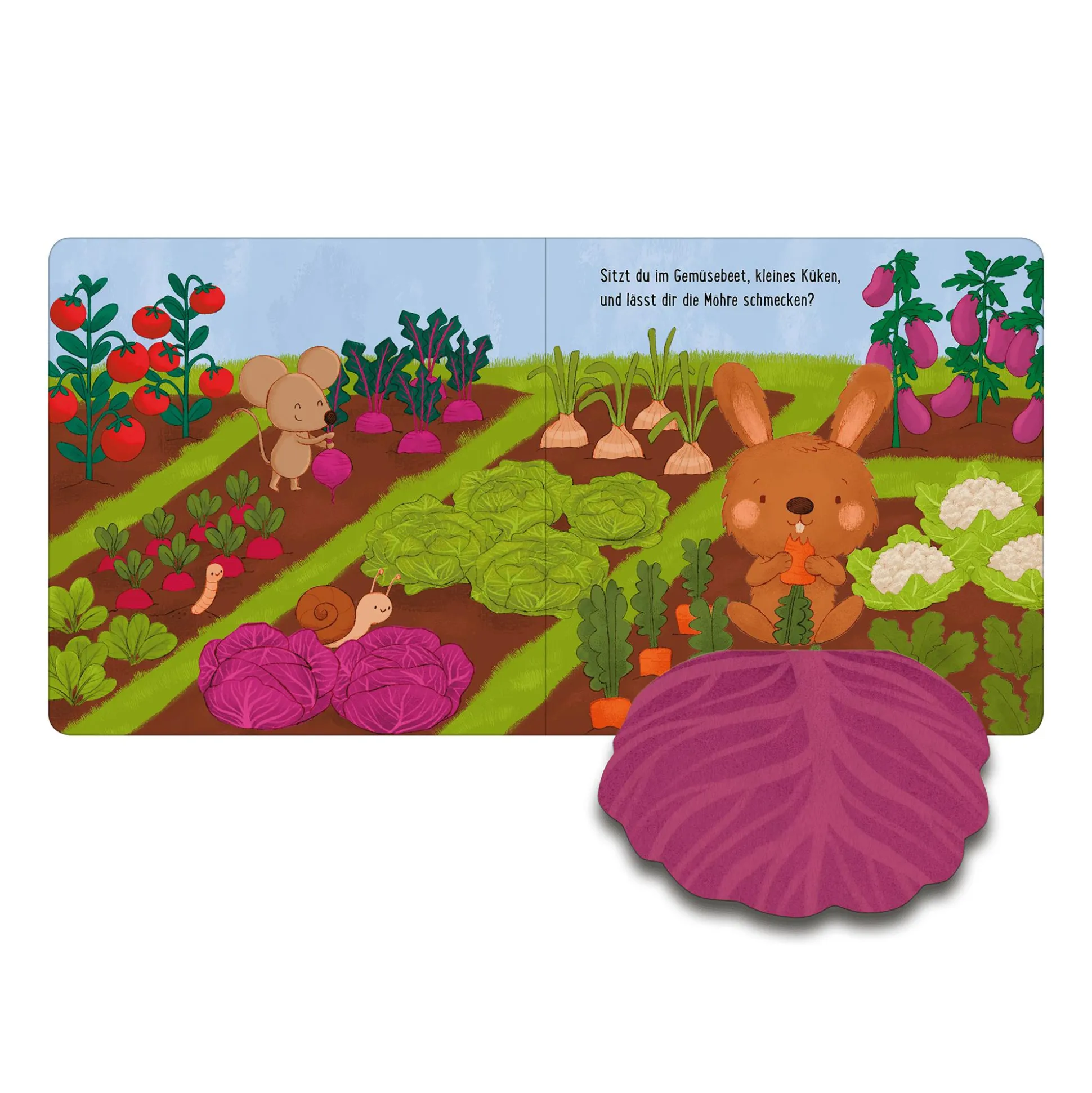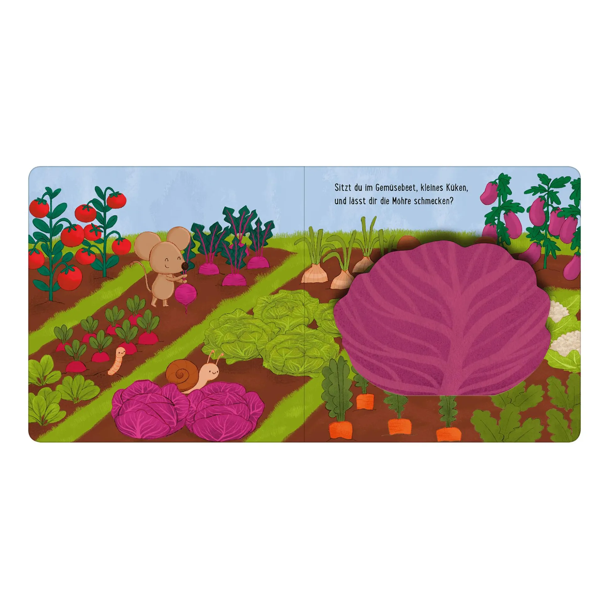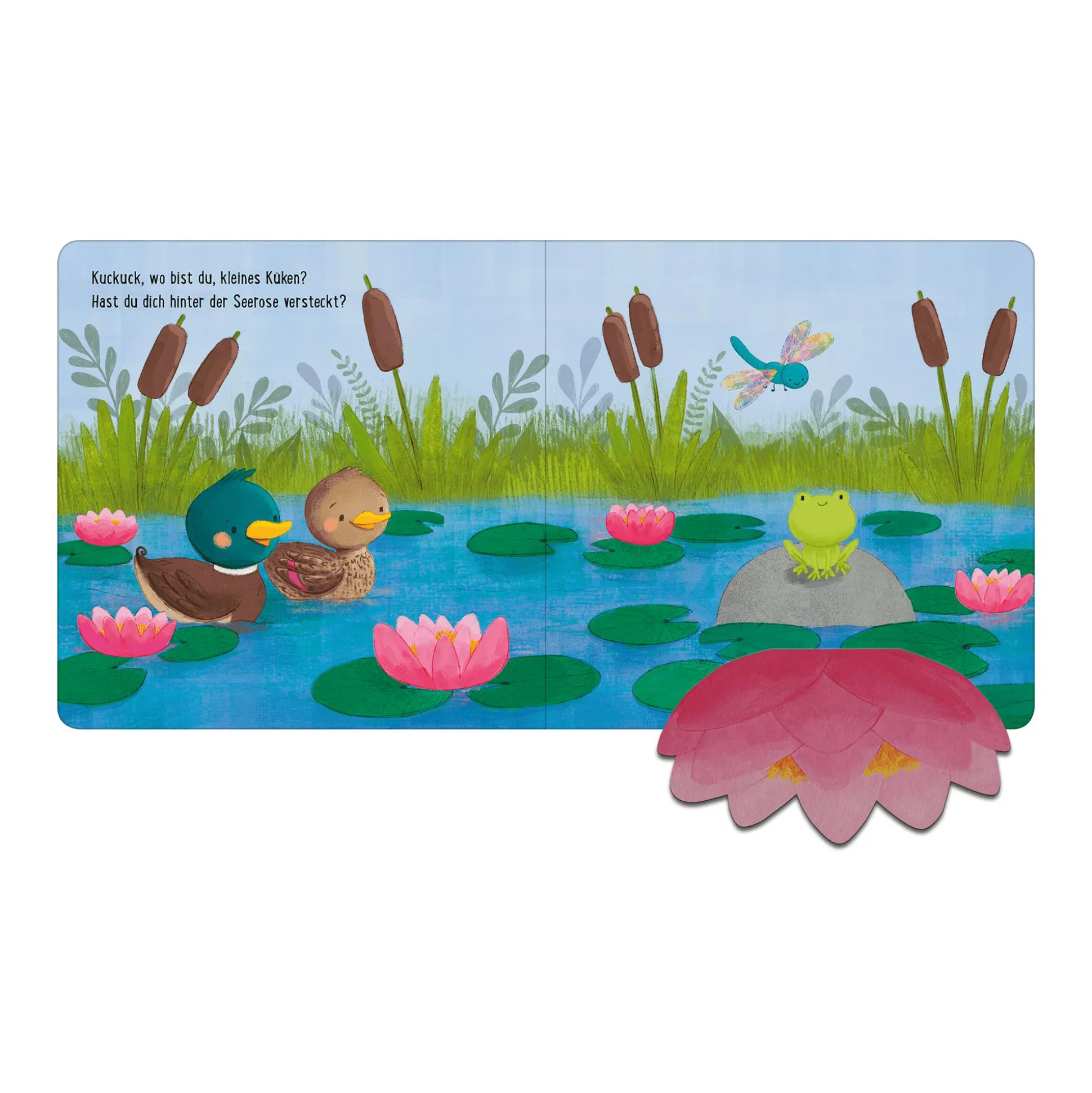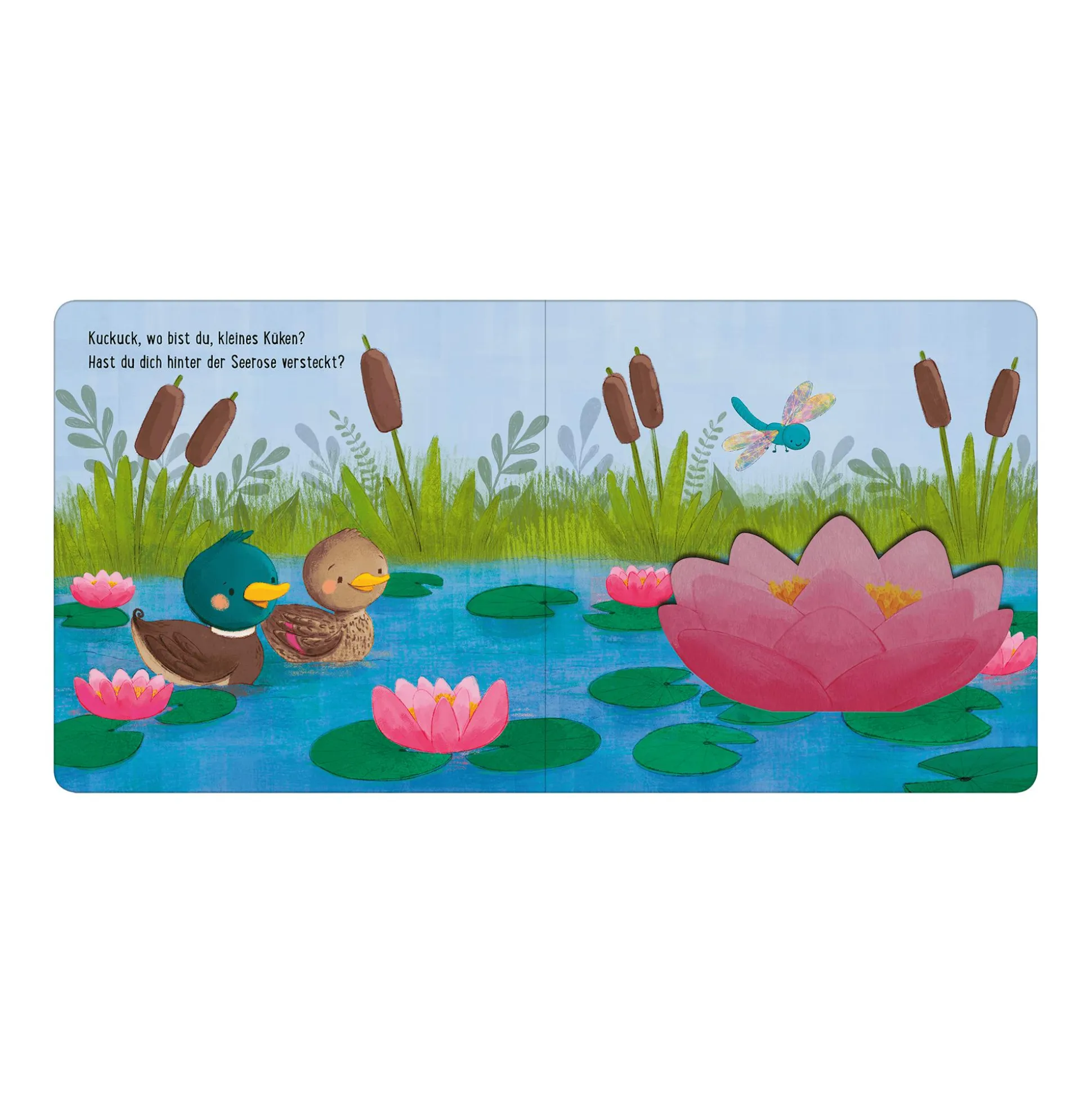 Kleines Küken, wo hast du dich versteckt?Auf der Wiese und im Garten gibt es viel zu entdecken. Wo bist du, kleines Küken? Lässt du dir den grünen Salat im Gemüsegarten schmecken?Sitzt du im Teich auf der Seerose? Schau hinter die Klappen und finde es heraus.