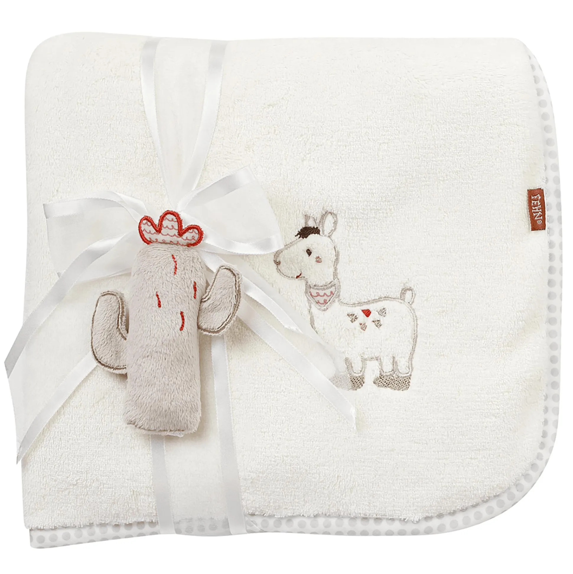 Das weiche Material mit niedlicher Applikation macht die Babydecke von fehn zum hübschen Accessoire und kuscheligen Wärmespender für zuhause oder unterwegs. Als besonderes Extra: Babys Kuscheltuch wird von einem kleinen, niedlichen Kaktus begleitet, der sich auf einen bunten und vor allem gemeinsamen Spielspaß freut – für unvergessliche Kuschelmomente.
