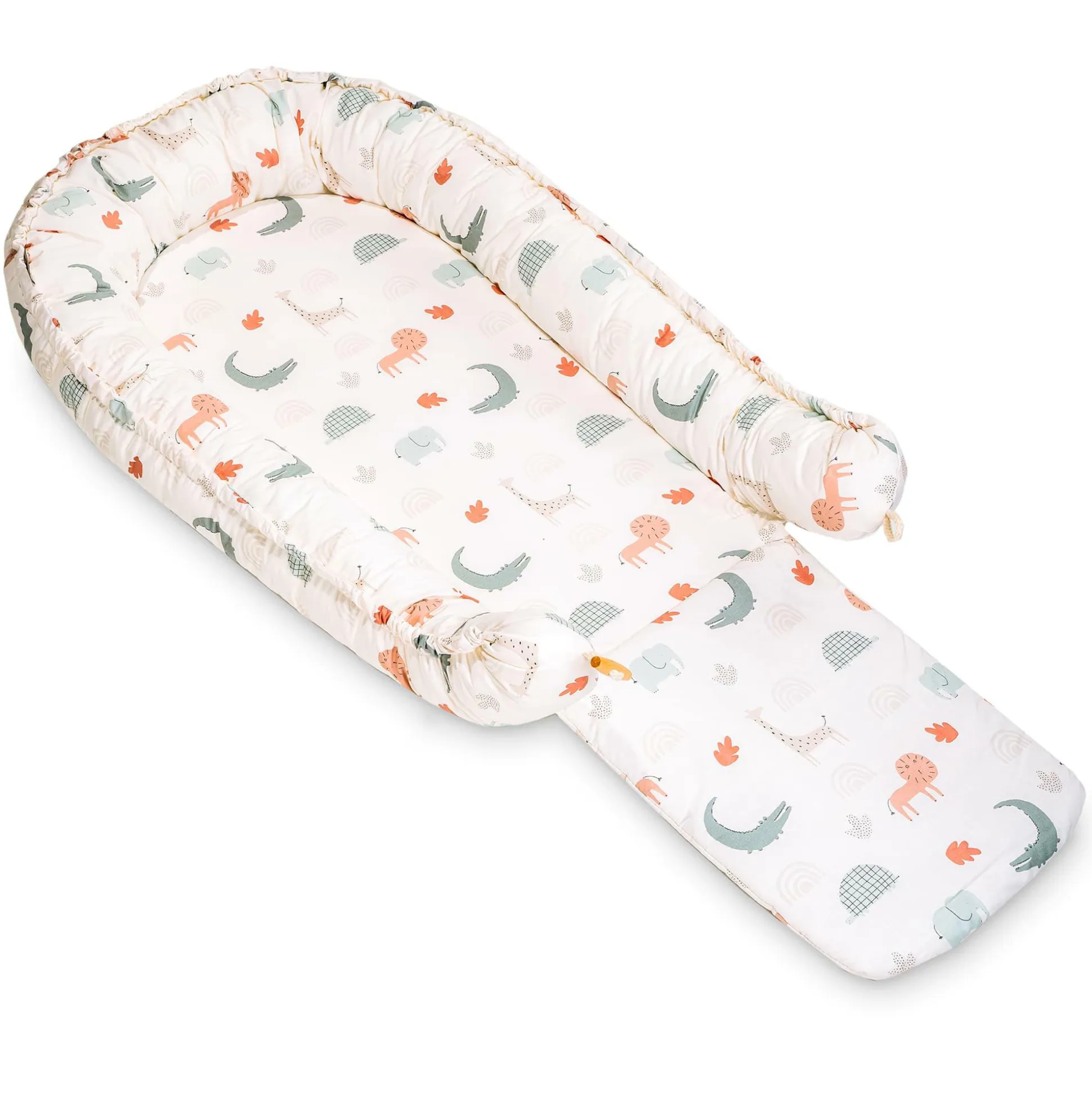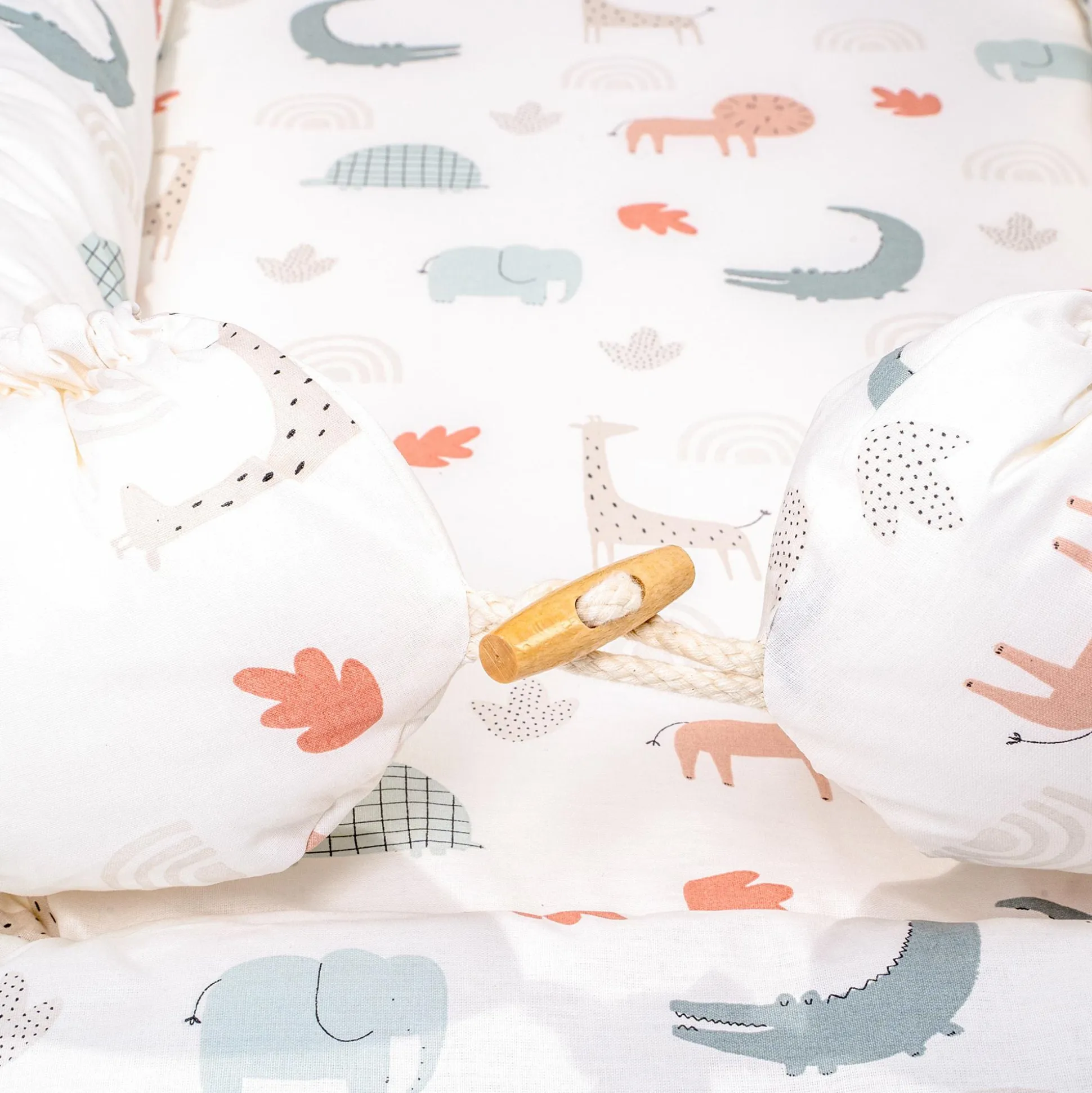 Das Kuschelnest NIDO MAX Wild Friends verleiht deinem kleinen Nachwuchs Sicherheit und Geborgenheit. Durch die unten angebrachte Verlängerung, die durch das Öffnen eines Knopfes ausgefaltet werden kann, lässt sich das Nestchen besonders lange nutzen.Das weiche Außenmaterial aus 100% Bio-Baumwolle sowie die Polyestervlies-Füllung sorgen für kuschelige Momente. Dabei sind alle Materialien nach Oeko-Tex Standard 100 schadstoffgeprüft und besonders unbedenklich.