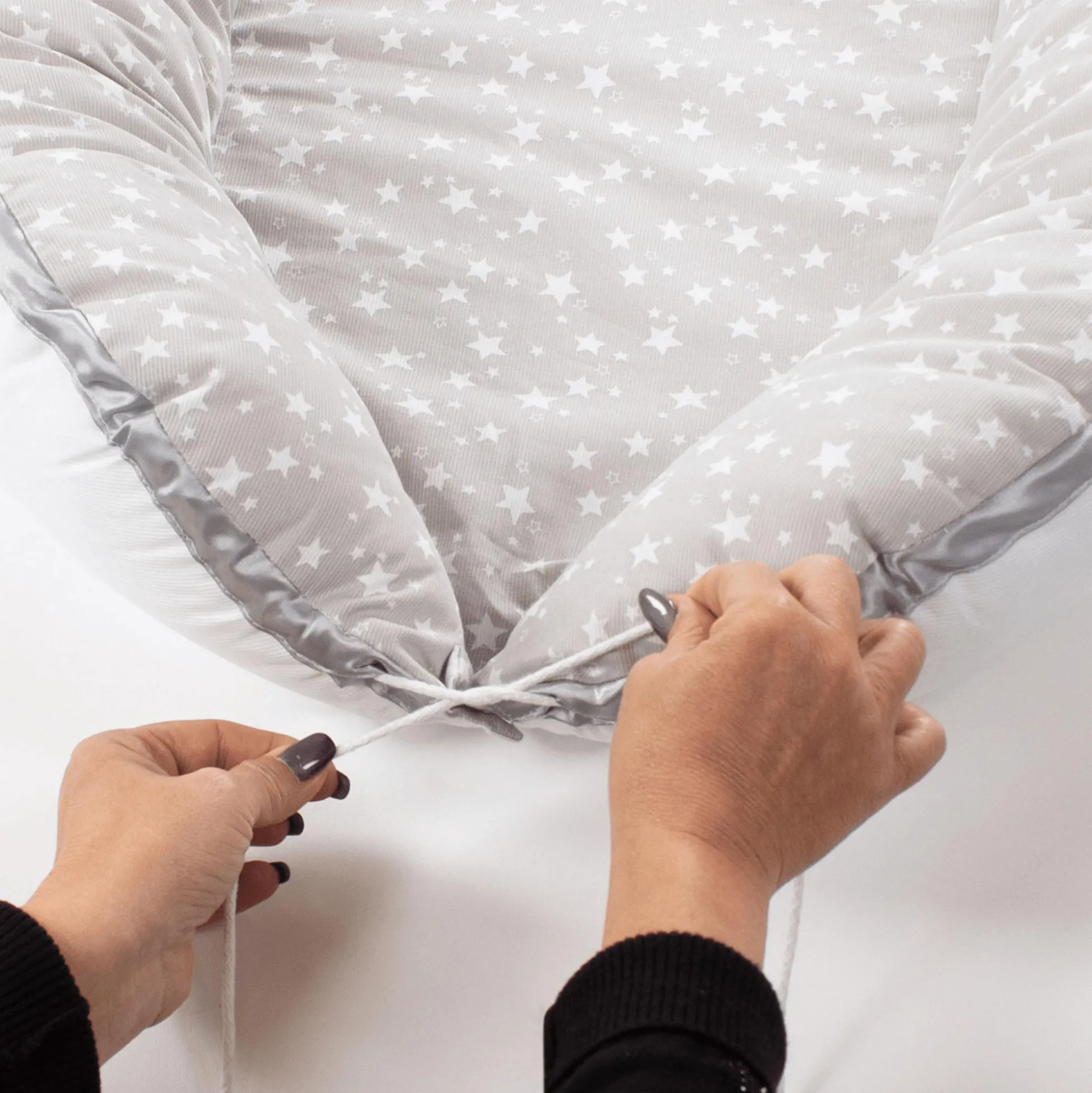 Besonders praktisch sind die eingearbeiteten Schnüre, mit denen das Nest gebogen eingestellt werden kann: Einfach den Druckknopf schließen, das Band zusammenziehen und zum Schluss die Schleife binden.