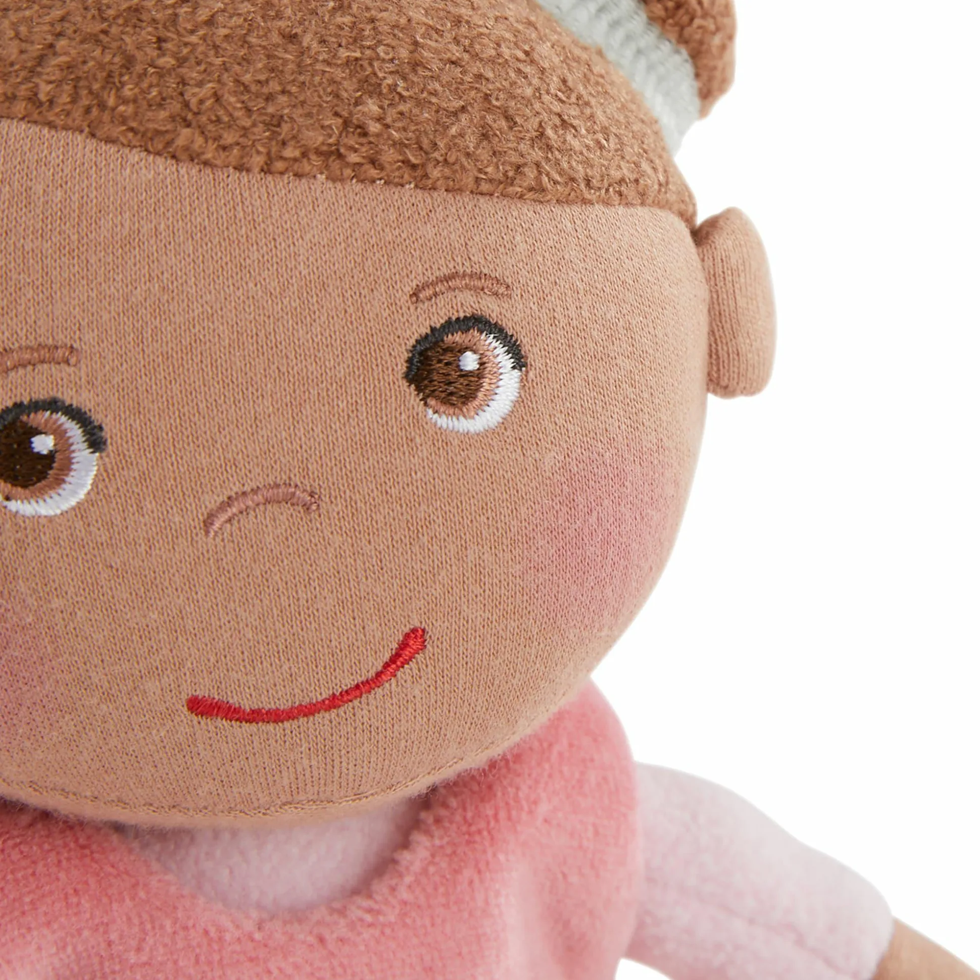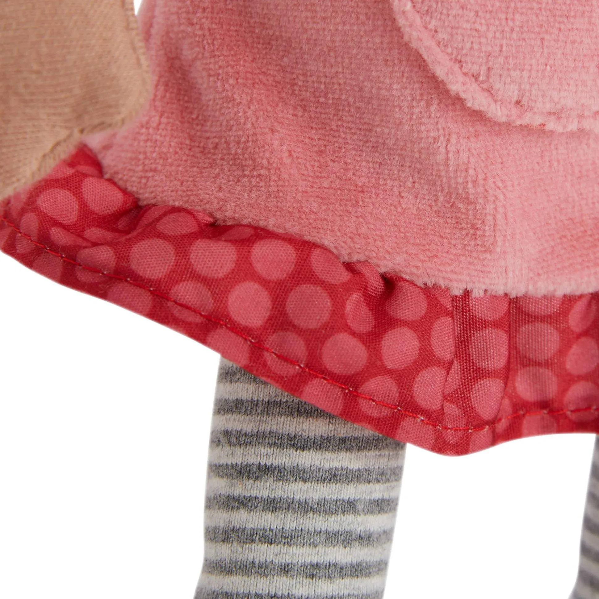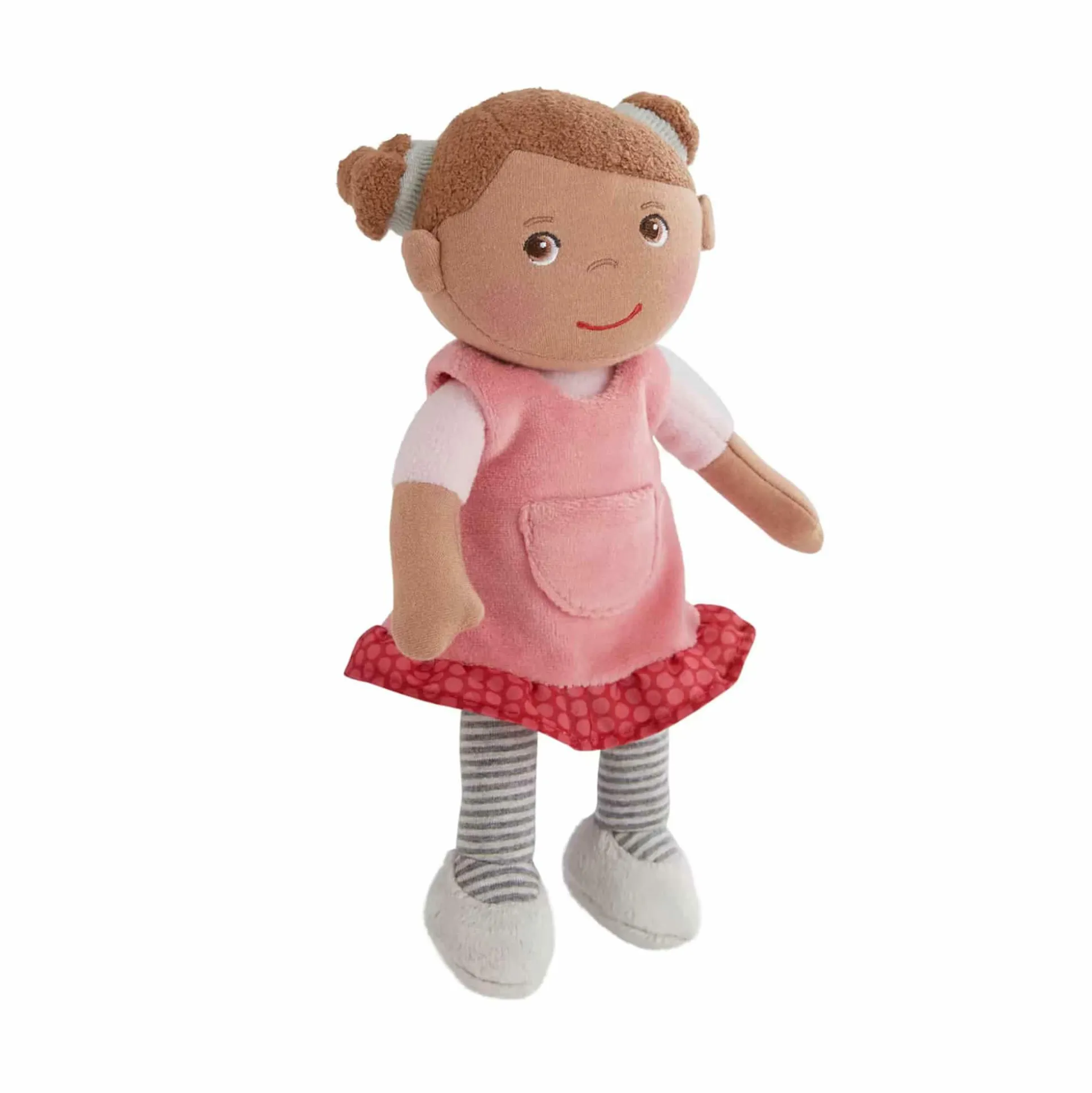 Die Stoffpuppe mit braunen Haaren trägt ein süßes rosa Kleid sowie niedliche Strümpfe und ist mit einer Größe von 25 cm genau richtig zum Liebhaben und Mitnehmen.