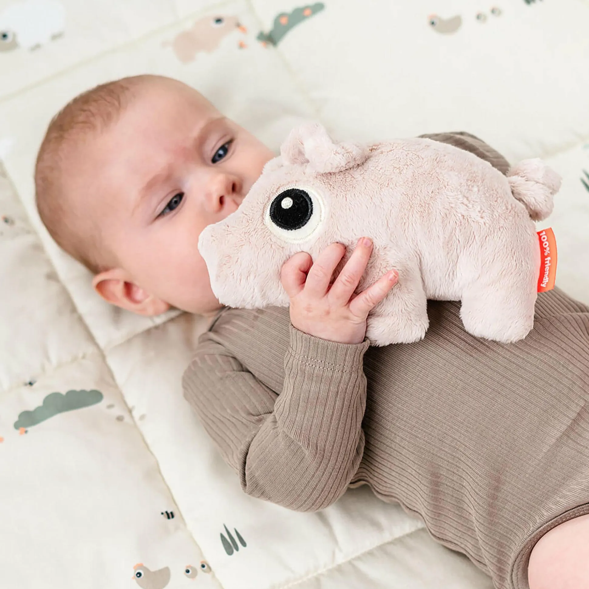 Kleinkinder ab ca. 3 Monaten können mit Pigee spielen, wobei das Schwein dein Kind beim Greifen und Kuscheln lernen unterstützt.