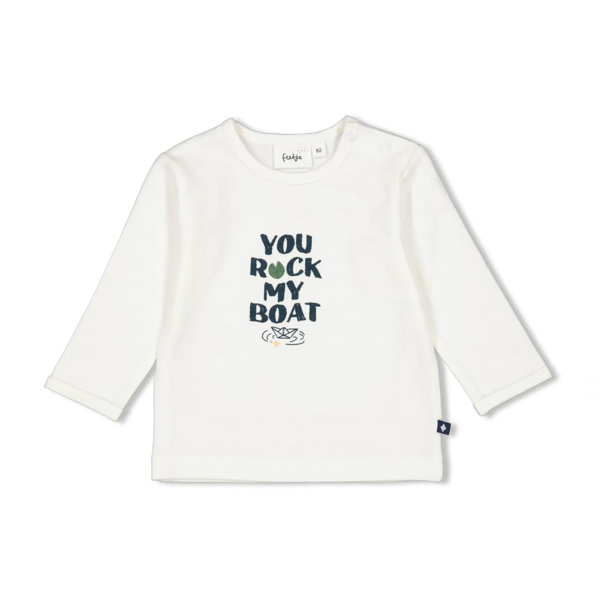 Das Langarmshirt You Rock My Boat von Feetje ist ein tolles Oberteil für kühlere Tage. Der gestickte Schriftzug mit niedlichem Boot-Motiv macht das Shirt zu einem echten Hingucker. Durch die praktischen Druckknöpfe an der Schulter lässt es sich leicht an- und ausziehen. Der weiche Baumwoll-Elasthan-Mix sorgt für hohen Tragekomfort und angenehme Bewegungsfreiheit.