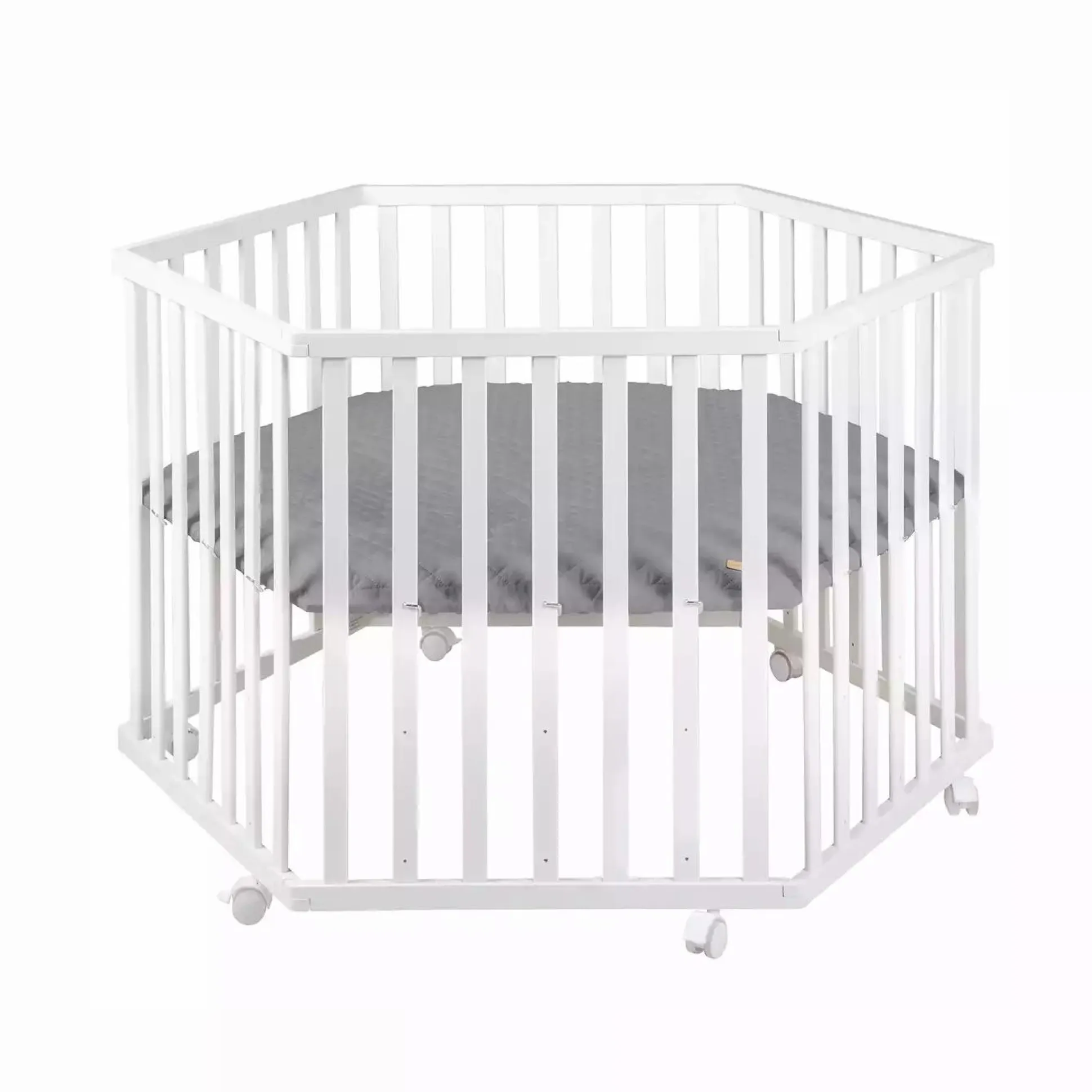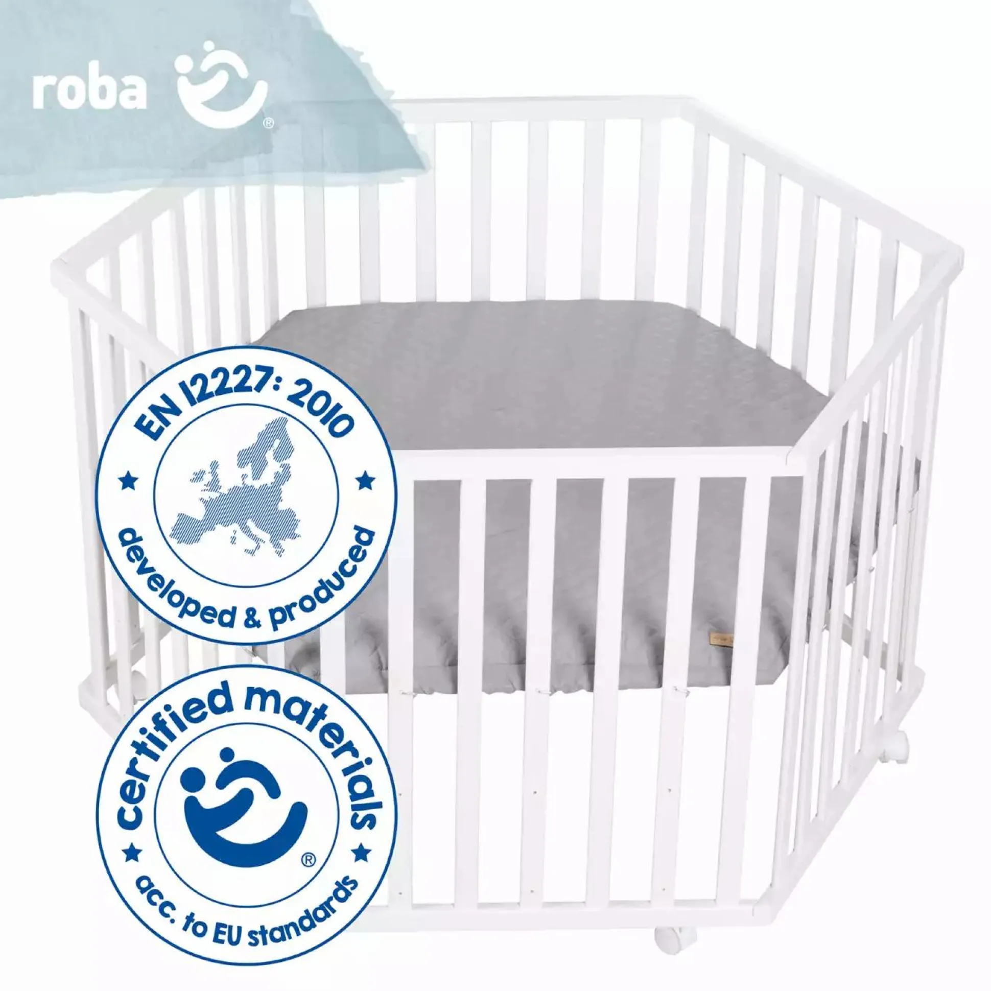 Das schöne 6-eckige Laufgitter „roba Style“ von Roba in der Farbe Weiß bietet deinem Kind eine kindgerechte und stabile Spiel- und Kuschelfläche mit einer weich gepolsterten, gesteppten anthrazitfarbenen Stoffeinlage. Dank der schmutzabweisenden Oberfläche ist die Stoffeinlage besonders pflegeleicht. Die obere Position des 3-fach höhenverstellbaren Bodens ist für dich besonders rückenschonend. Für die nötige Mobilität sowie Standfestigkeit bei dem Laufstall sorgen die sechs Bremsrollen. Alle verwendeten Materialien des Krabbelgitters sind schadstoffgeprüft und zertifiziert. Zusätzlich werden sie regelmäßig während der Herstellung überprüft. Das wurde nach Norm EN 12227:2010 entwickelt. Der Laufstall ist bis zu einem Gewicht von ca. 15 kg belastbar.