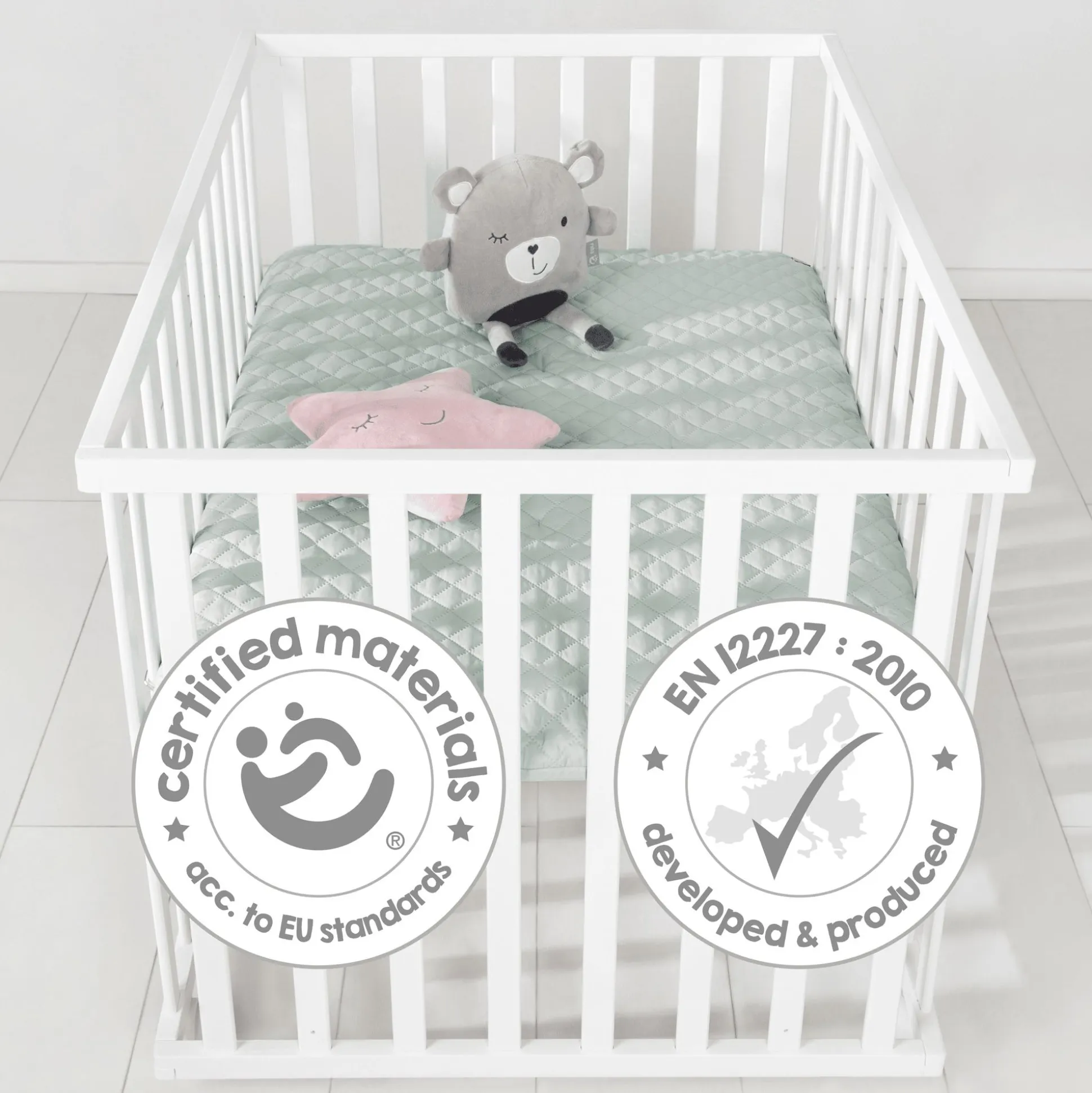 Das roba Laufgitter ‚roba Style‘ in der Farbe Weiß bietet eine kindgerechte und stabile Spiel- und Kuschelfläche von 75 x 100 cm und ist mit einer weich gepolsterten, gesteppten grünen Stoffeinlage ausgestattet.