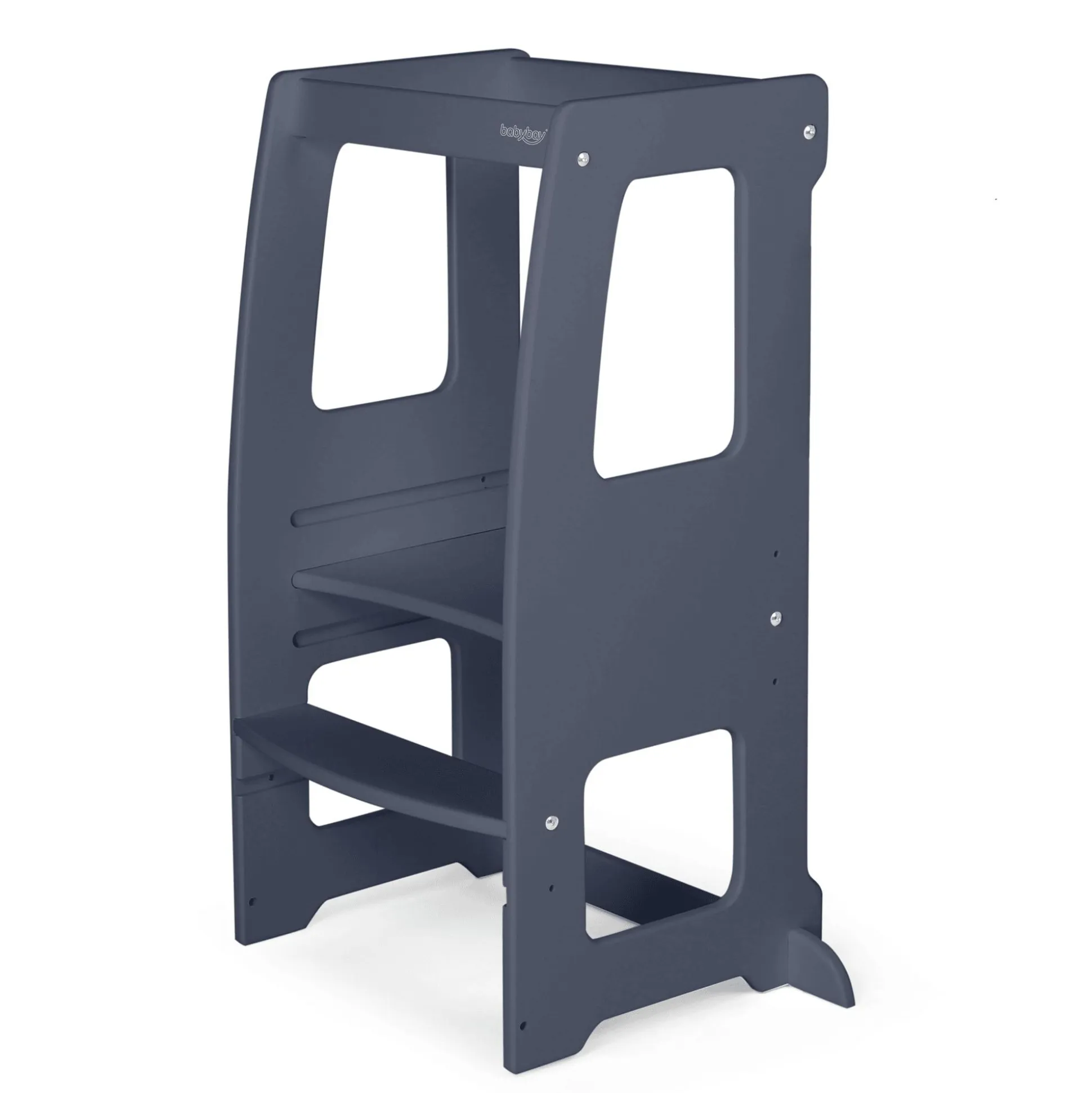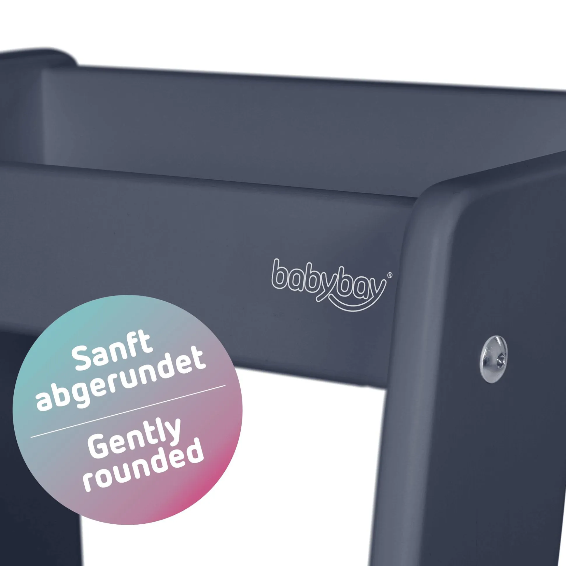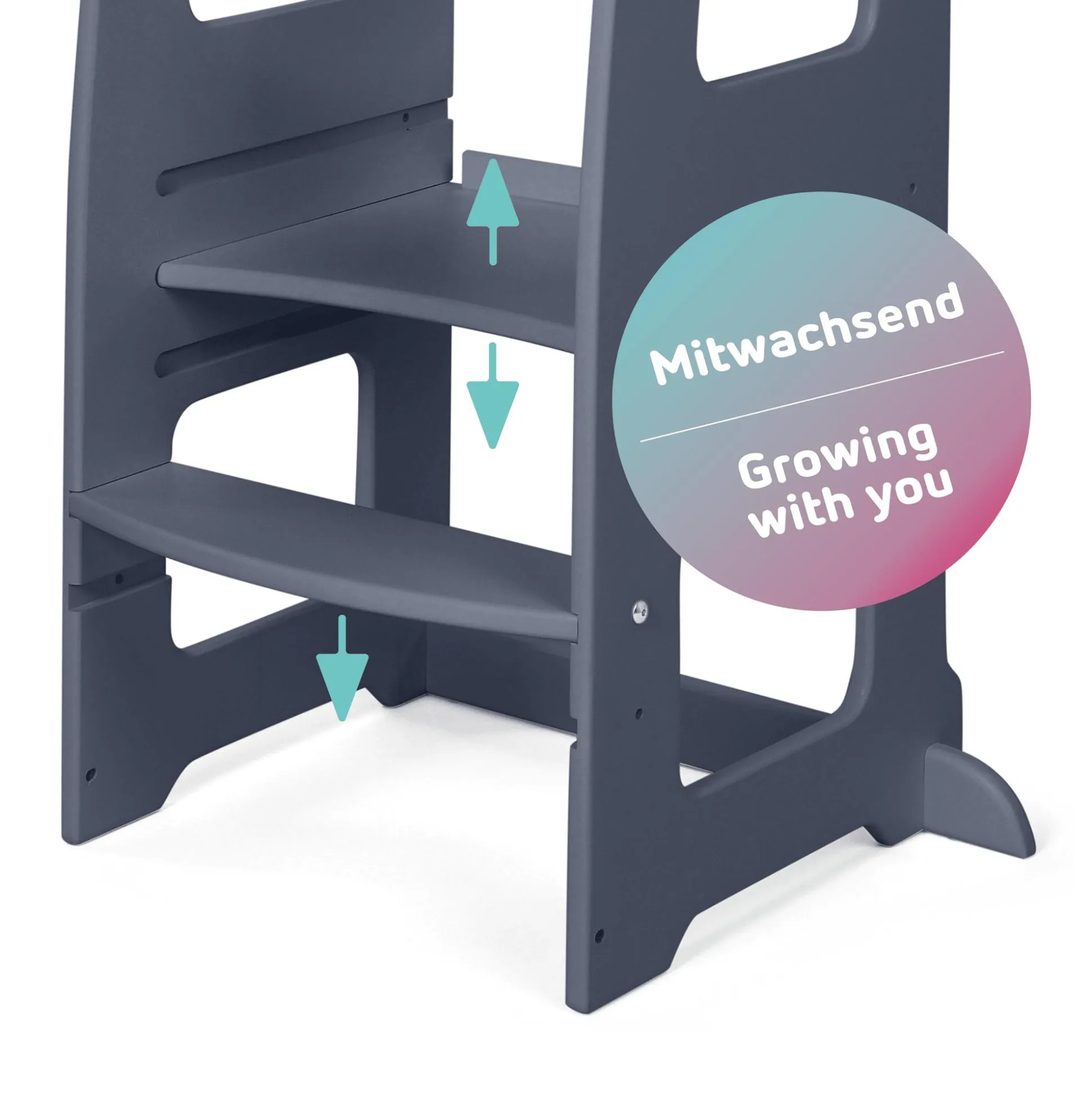 Und wenn wir schon beim Thema „Sicherheit“ sind: Die abgerundete Platte ermöglicht einen bequemen und sicheren Einstieg, fördert die Selbstständigkeit und lädt dein Kind ein, die Welt auf Augenhöhe zu erleben. Dabei sorgen die sanft abgerundeten Kanten für zusätzlichen Schutz, während eine spezielle Aussparung für Küchengriffe ein sicheres Lernen und Spielen ermöglicht.