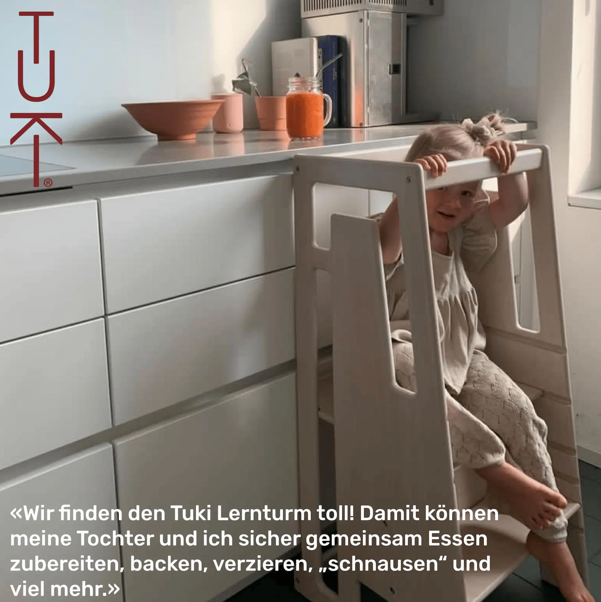 Mit dem ergonomischen Tuki® Lernturm im Design Greywash kannst du mit deinem kleinen Chefkoch gemeinsam und sicher das Essen zubereiten. Dein Liebling kann am Geschehen dabei sein und seinen Entdeckergeist sowie die Selbstständigkeit entwickeln. Dank der 3-fachen Höhenverstellbarkeit und der Belastbarkeit von bis zu ca. 100 kg kann der Lernturm bis zu einem Alter von ca. 8 Jahren genutzt werden.