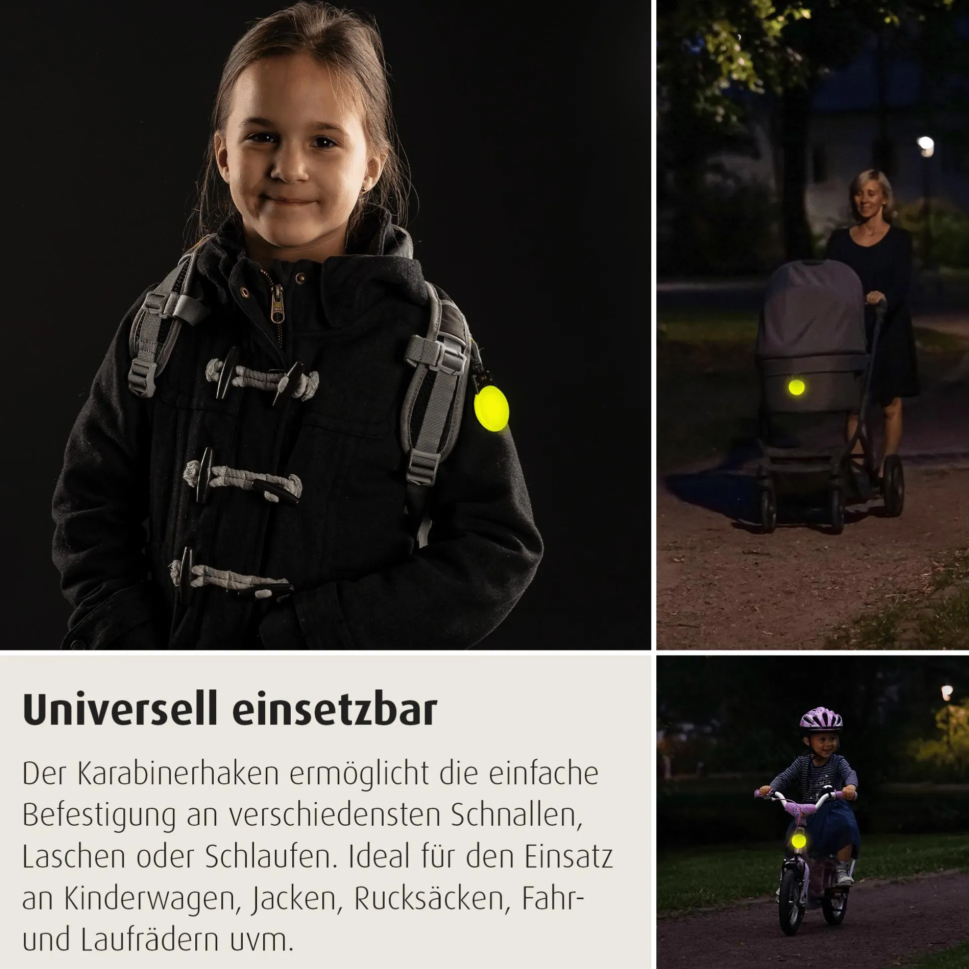 Das Light & Go Sicherheitslicht von reer macht dich und dein Kind auch bei schlechten Sichtverhältnissen für andere Verkehrsteilnehmer besser sichtbar.