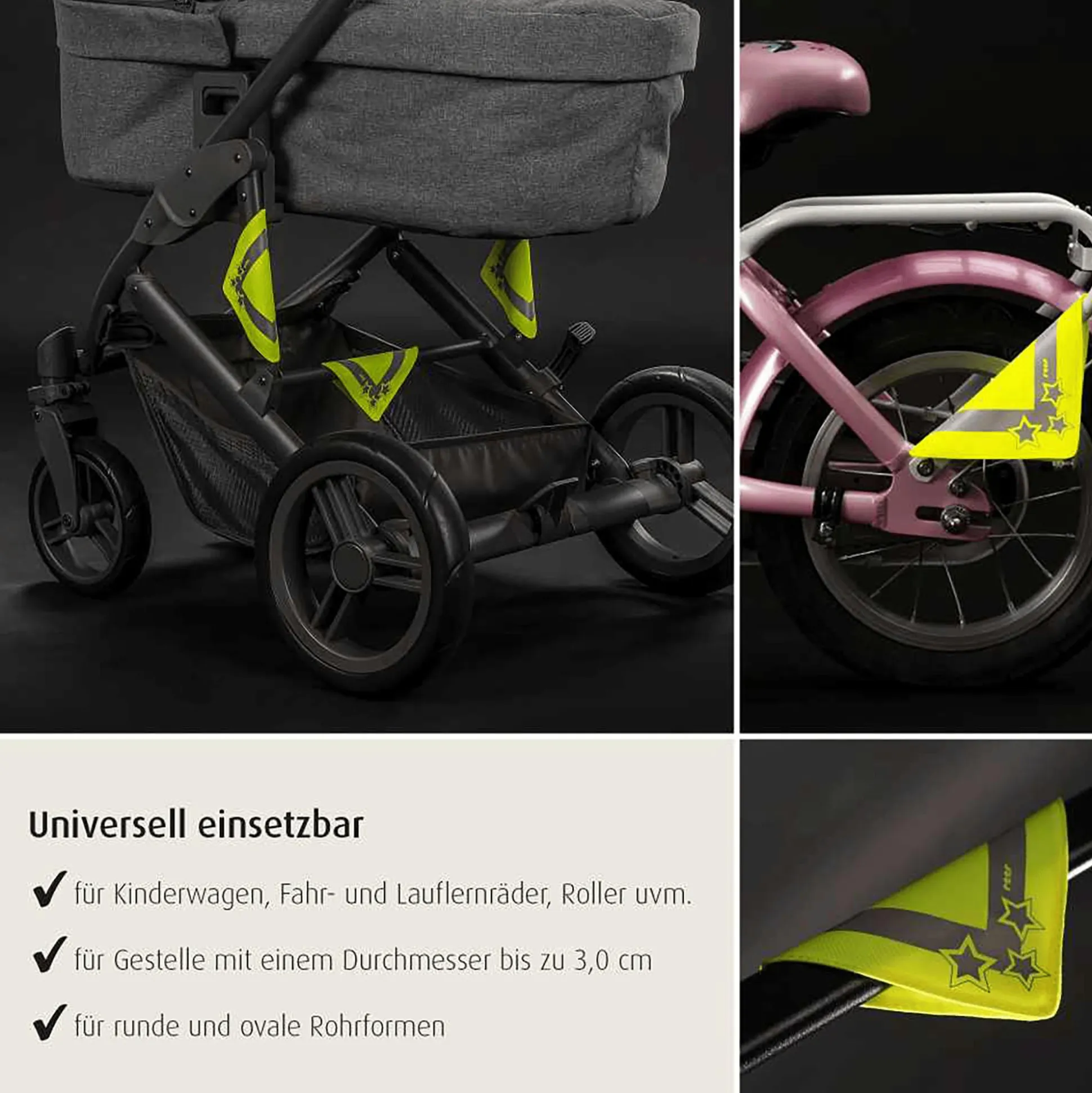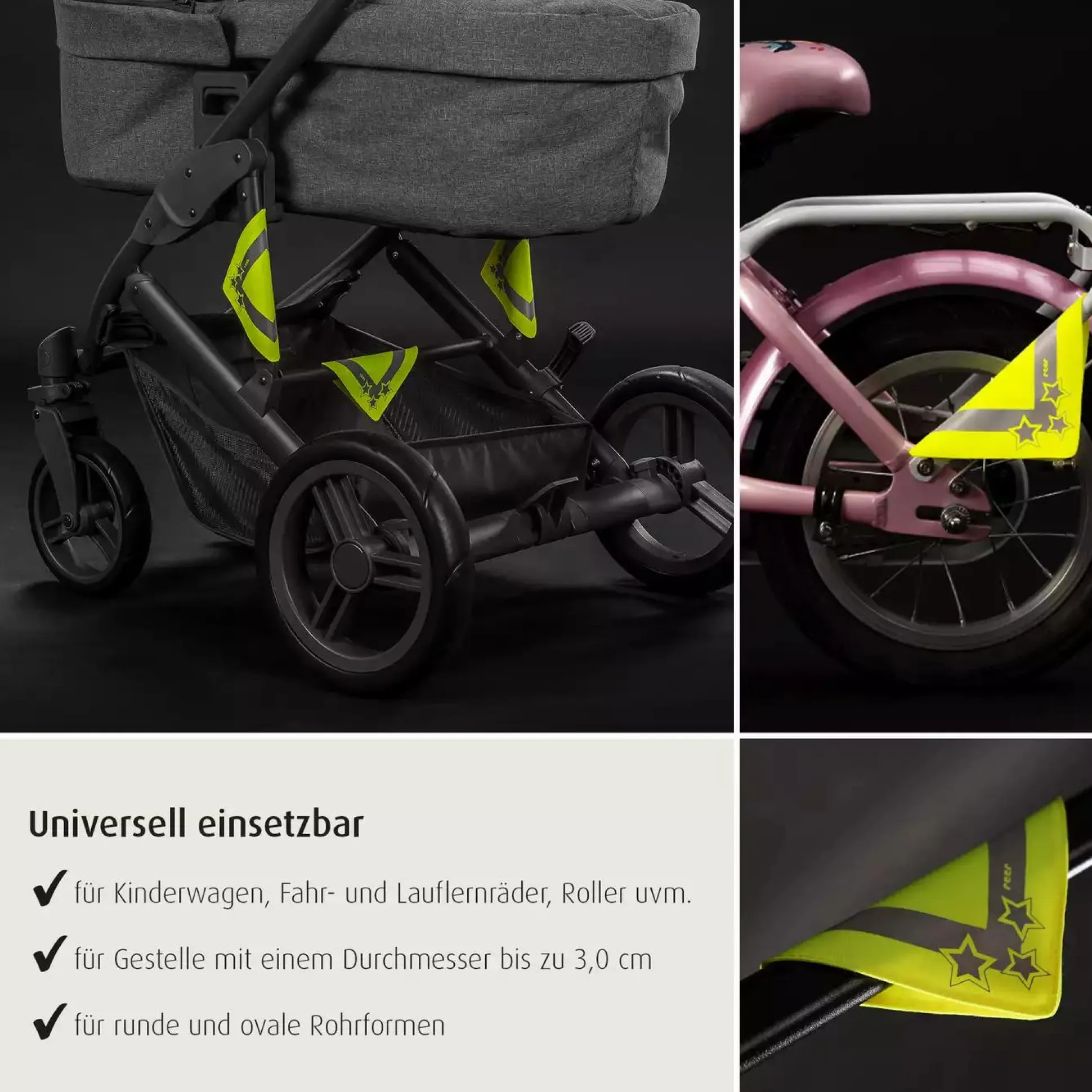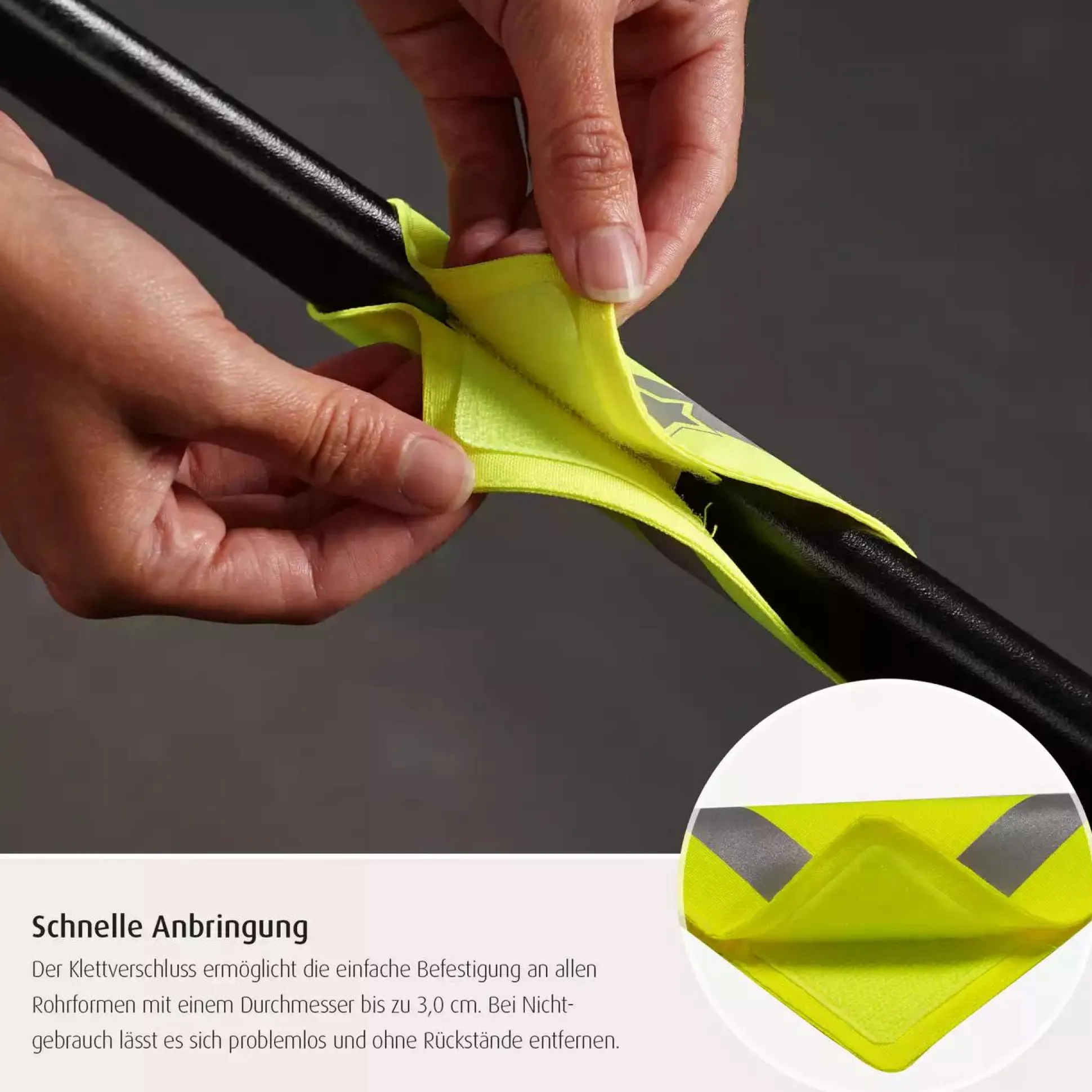 Die Reflektoren bestechen zudem durch ihre besonders leichte Anwendung – einfach um die gewünschte Stelle legen und beide Seiten des Klettverschlusses miteinander verbinden. Dies ermöglicht ihren Einsatz an verschiedenen Gestellen mit runden oder ovalen Rohrformen bis zu einem Durchmesser von bis zu 3 cm. Nach ihrem Einsatz lassen sie sich komplett ohne Rückstände entfernen und bei Bedarf immer wieder verwenden.