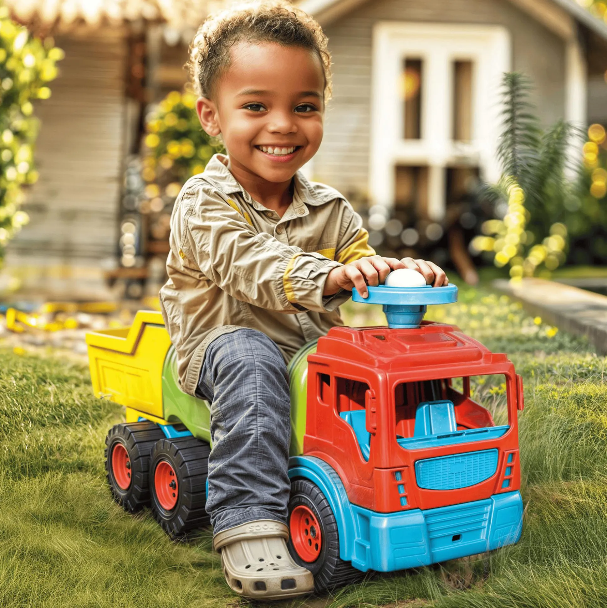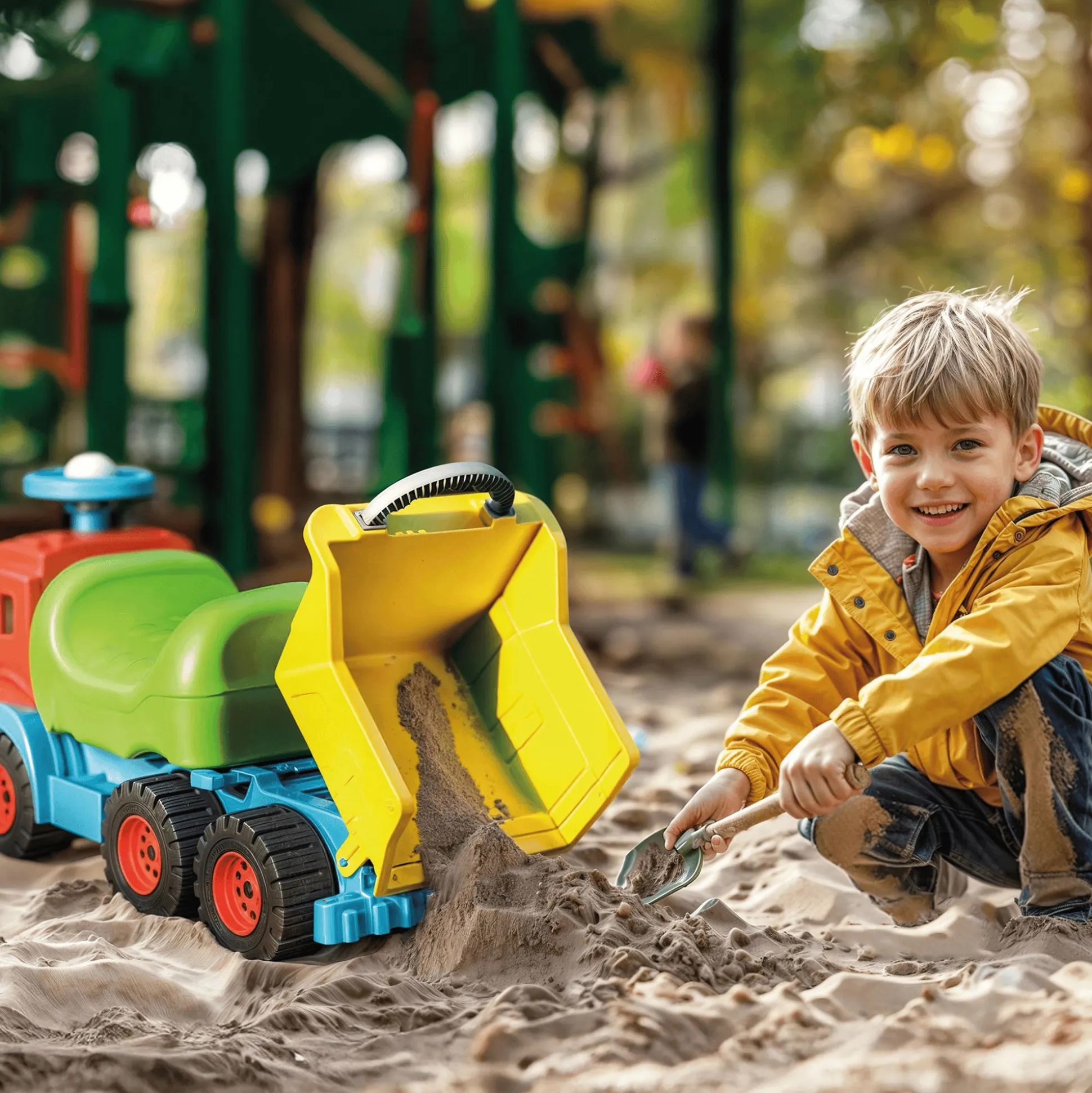 Dieser Spielzeug LKW mit Kipplade von Vedes hat immer etwas spannendes zu transportieren, wie z.B. dein Kind! Er sorgt für rasanten Fahrspaß und bringt die Baustelle direkt ins Kinderzimmer oder in den Sandkasten. Mit seinem bunten Design und robustem Kunststoff ist er der perfekte Begleiter für kleine Baumeister. Das drehbare Lenkrad mit Hupe sorgt für realistischen Fahrspaß, während die kippbare Ladefläche spielend leicht Sand, Bauklötze oder Spielzeug befördert. Dank des praktischen Griffs an der Kipplade lässt sich die Fracht kinderleicht abladen – genau wie bei den großen Baustellen-Profis!