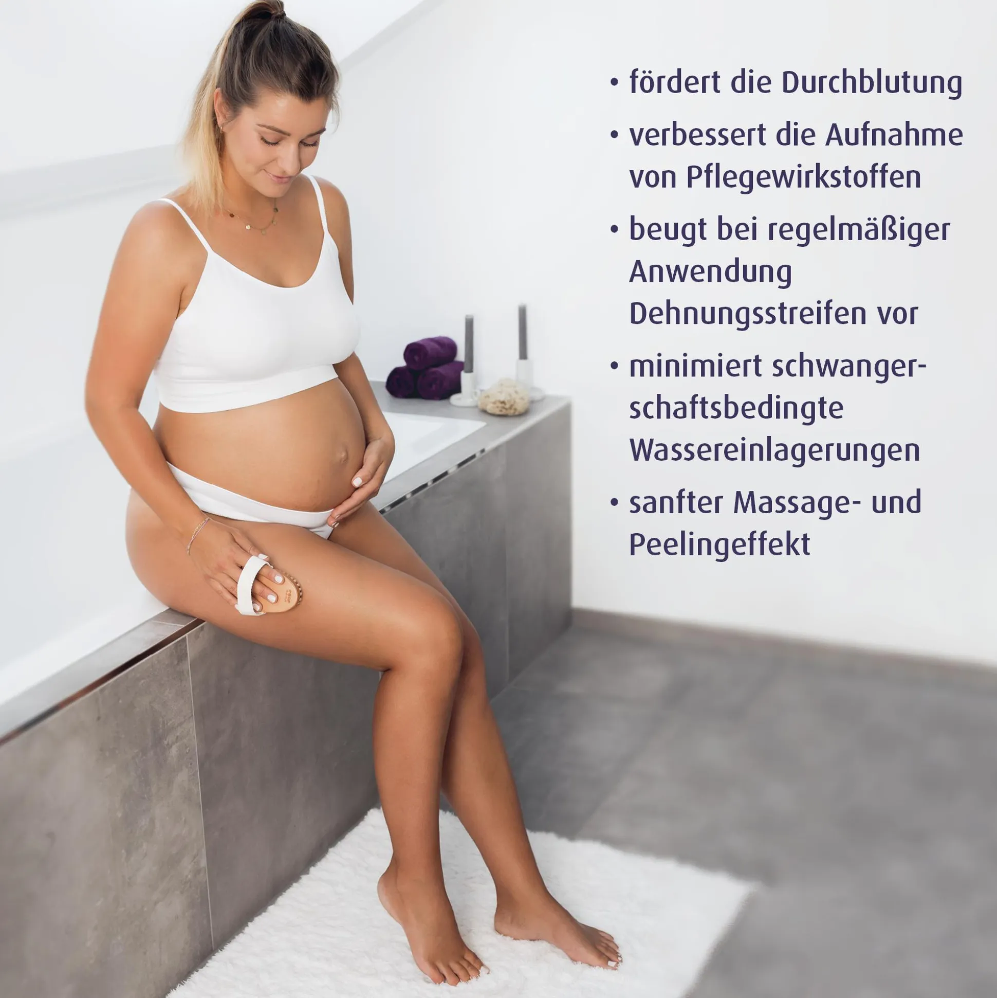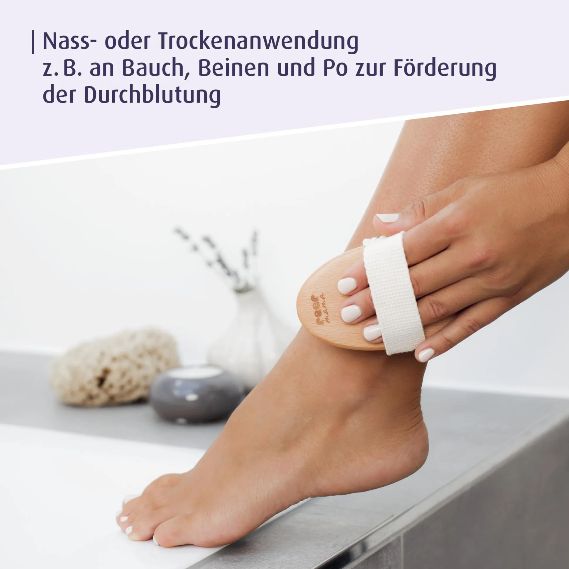 Mit der reer Mama Massagebürste kannst du für mehr Wohlbefinden sorgen, denn tägliche Massagen wirken entlastend bei Wassereinlagerungen und Schweregefühl.Die regelmäßige Pflege mit der Bürste regt zudem die Durchblutung an und kann einen Beitrag dazu leisten, schwangerschaftsbedingten Dehnungsstreifen vorzubeugen.