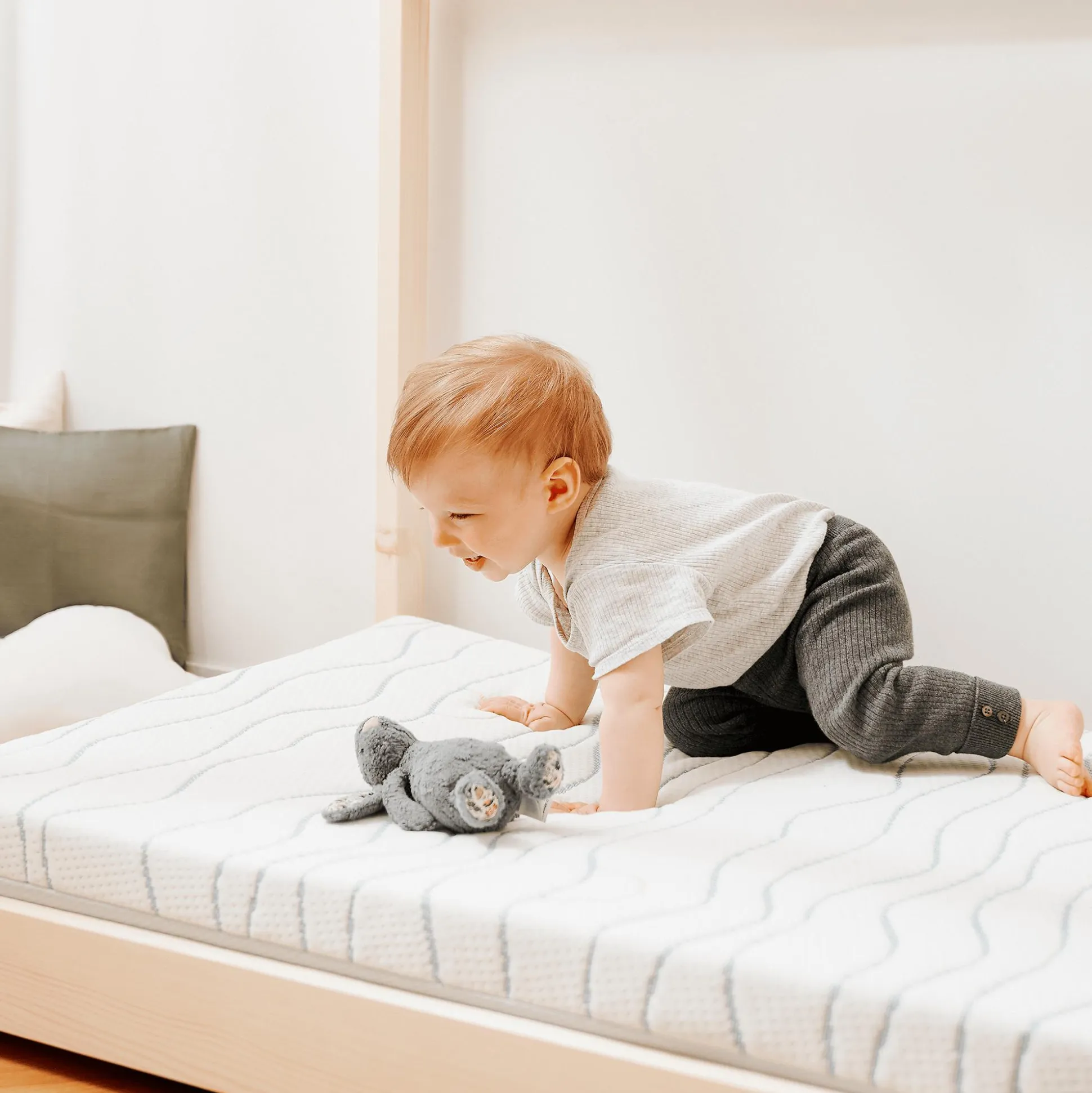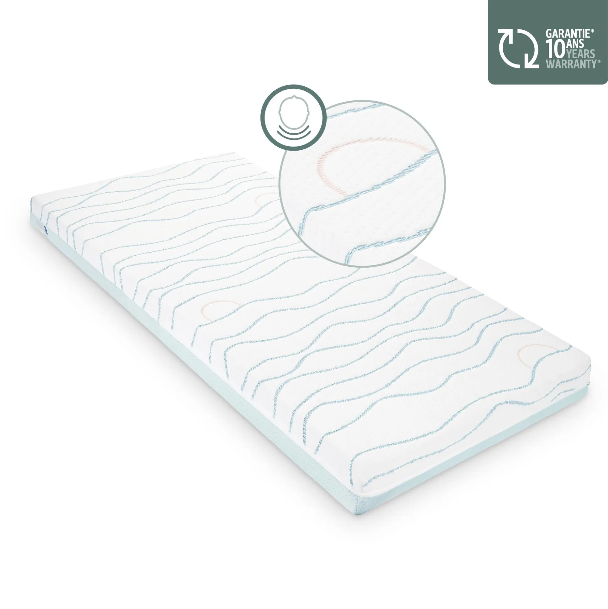 Auch die Matratze überzeugt durch ihre langlebigen und nachhaltigen Materialien: Der Bezug aus recyceltem NEWLIFE-Polyestergarn ist nicht nur umweltfreundlich, sondern auch Certipur-zertifiziert, was die Verwendung ungiftiger Stoffe garantiert. Mit einer festen Dichte von ca. 28 kg/m³ und einer Dicke von ca. 10 cm bietet sie die perfekte Balance zwischen Komfort und Sicherheit. Für eine einfache Pflege ist der Bezug abnehmbar und kann bei 30°C in der Maschine gewaschen werden.