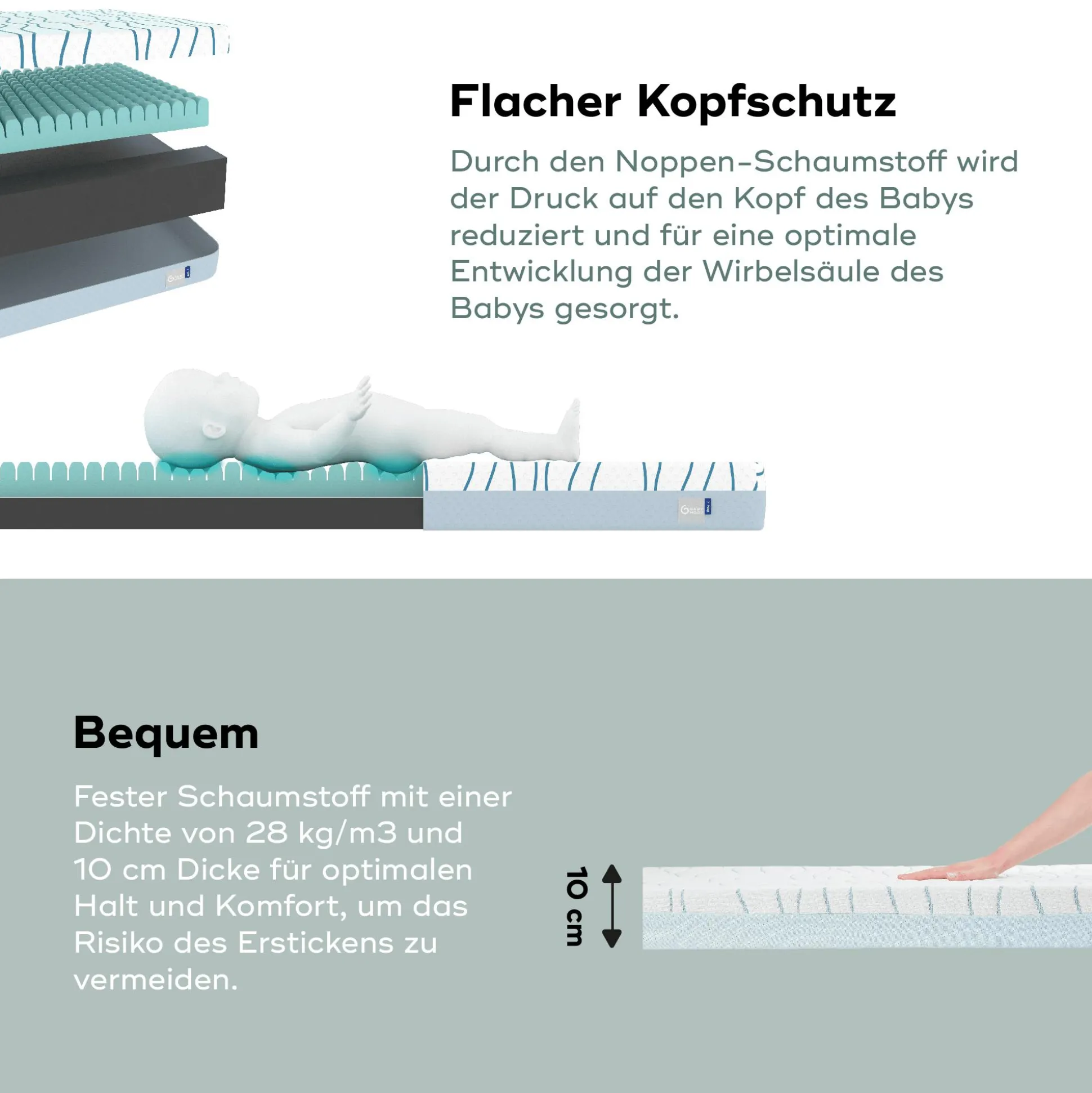 - Noppen-Schaumstoff, der den Druck auf den Kopf des Babys reduziert