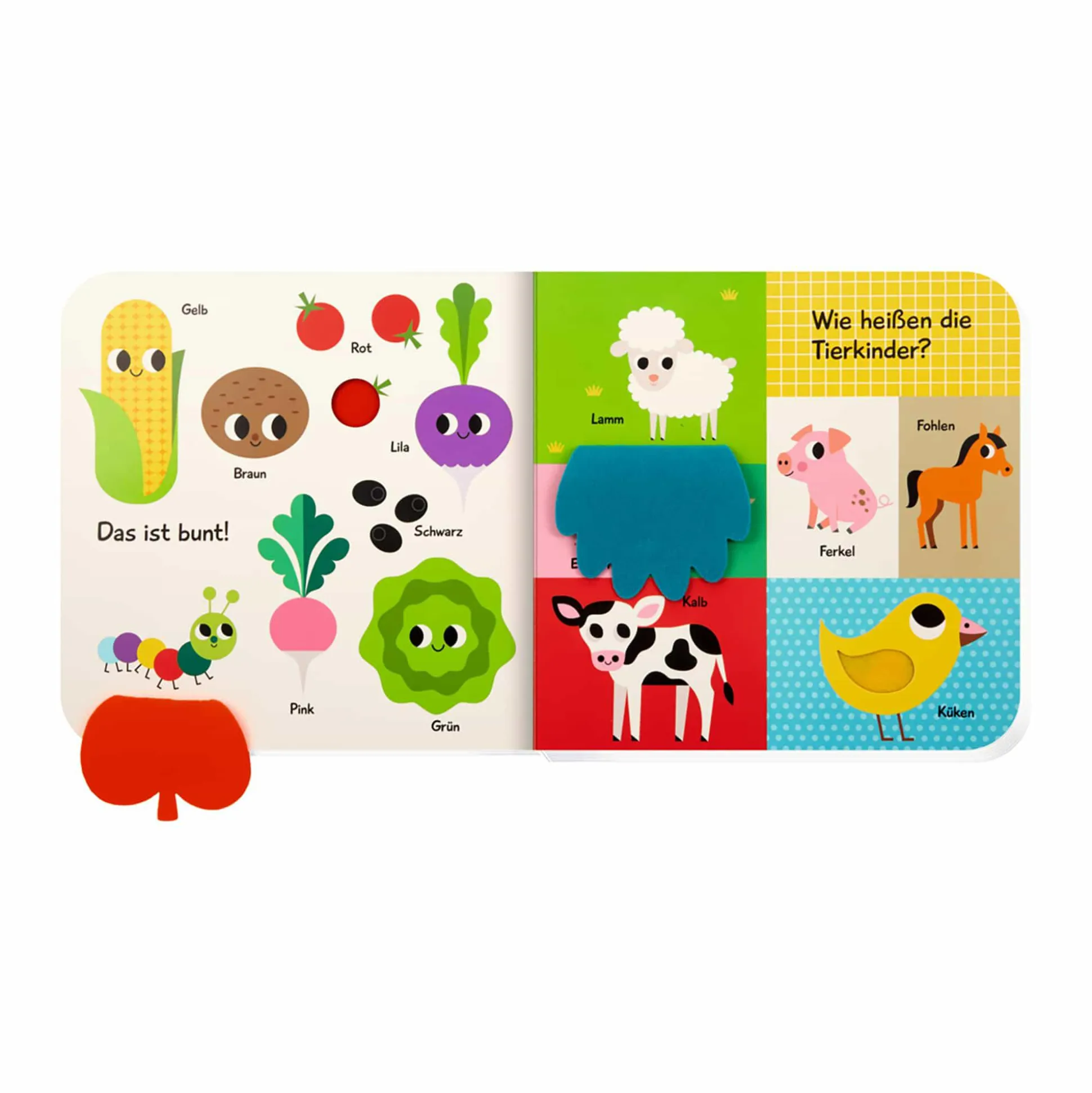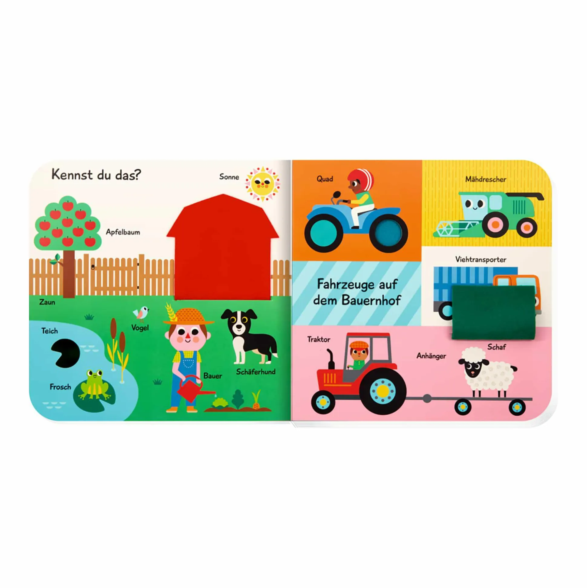 Auf dem Bauernhof gibt es so viel zu entdecken: Kuschelweiche Filzklappen und kunterbunte Bilder laden in diesem besonderen Pappbilderbuch zum Spielen, Entdecken, Lernen und Sprechen ein. Außerdem kann dein Schatz erste Wörter auf dem Bauernhof lernen: Tiere, Pflanzen, Werkzeuge, Formen und Farben. Mit 10 weichen Filzklappen und einem hochwertigen Spiegel.