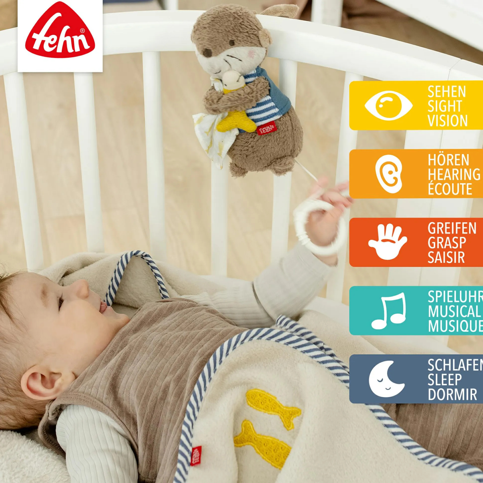 Getarnt als Mini-Spieluhr von fehn spielt der kleine Otter Theo deinem Baby das perfekte Schlummerlied vor. Während dein Liebling mit Theo kuschelt, kann gleichzeitig Brahms‘ Wiegenlied abgespielt werden. Schnell wird es zum Lieblingskuscheltier deines Kindes und soll am besten überall mit hingenommen werden. Und da der freundliche Otter das schon geahnt hat, kann er dank der praktischen Befestigungsbändchen ganz leicht am Babybett, am Kinderwagen oder an der Babyschale befestigt werden. Doch Theo hilft deinem Baby nicht nur beim Schlafen, sondern fördert auch seine sensorischen Fähigkeiten.