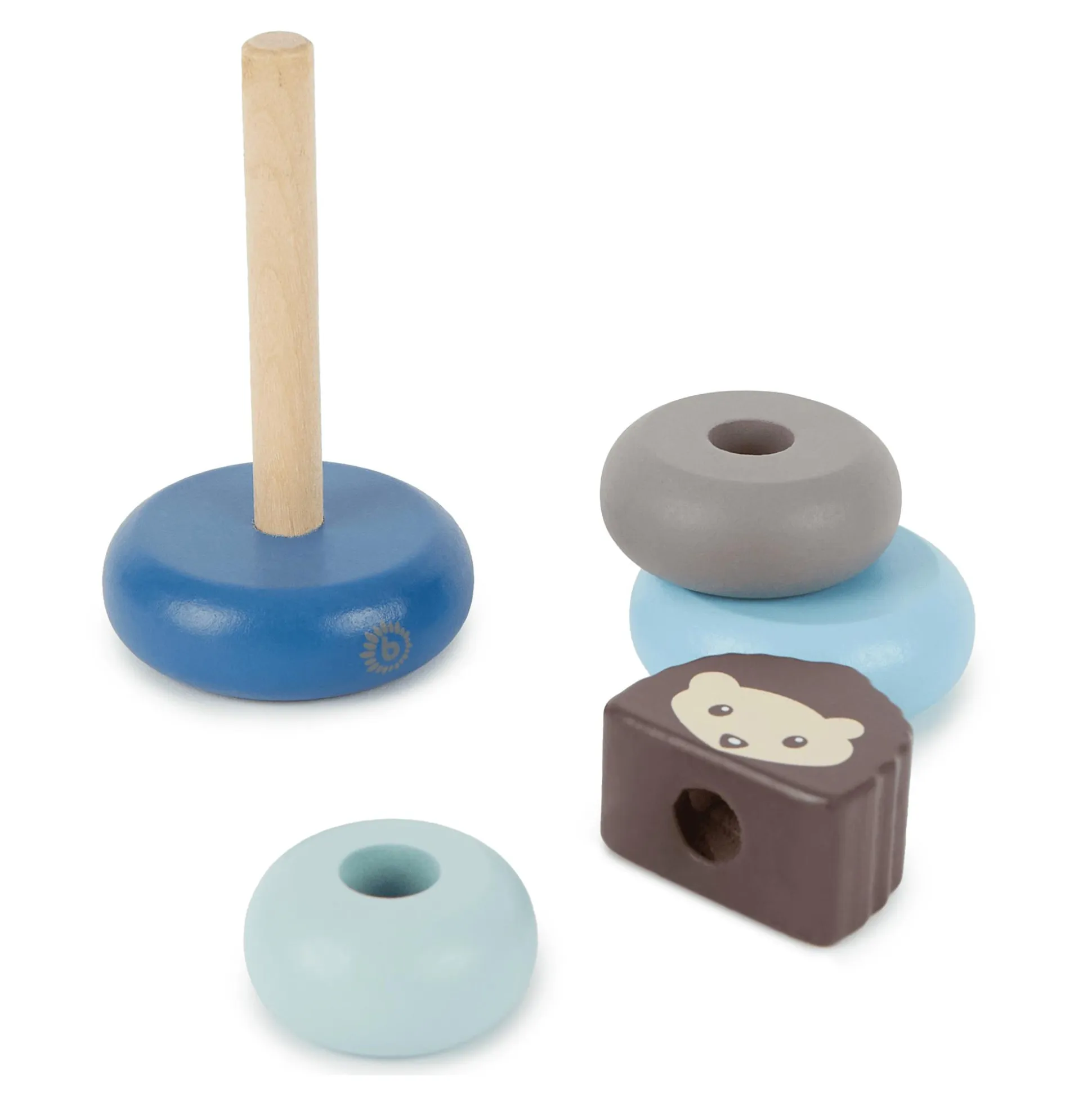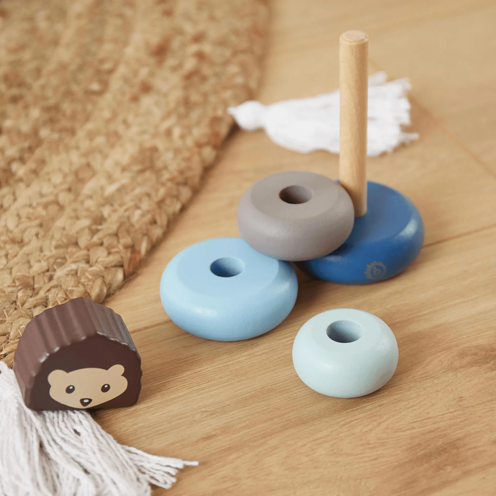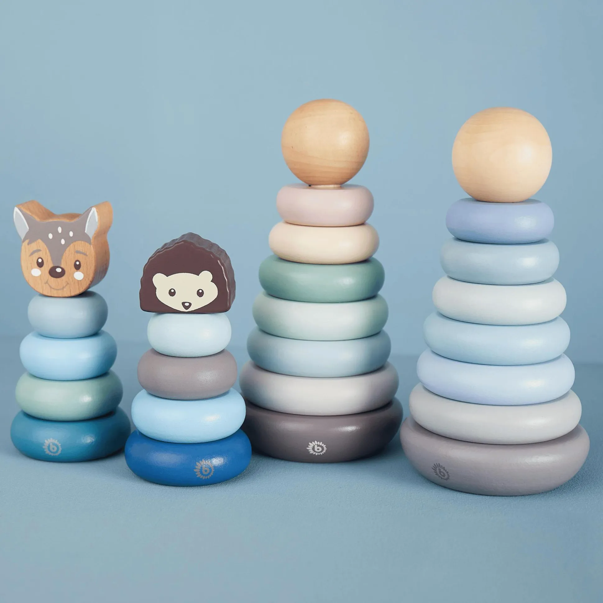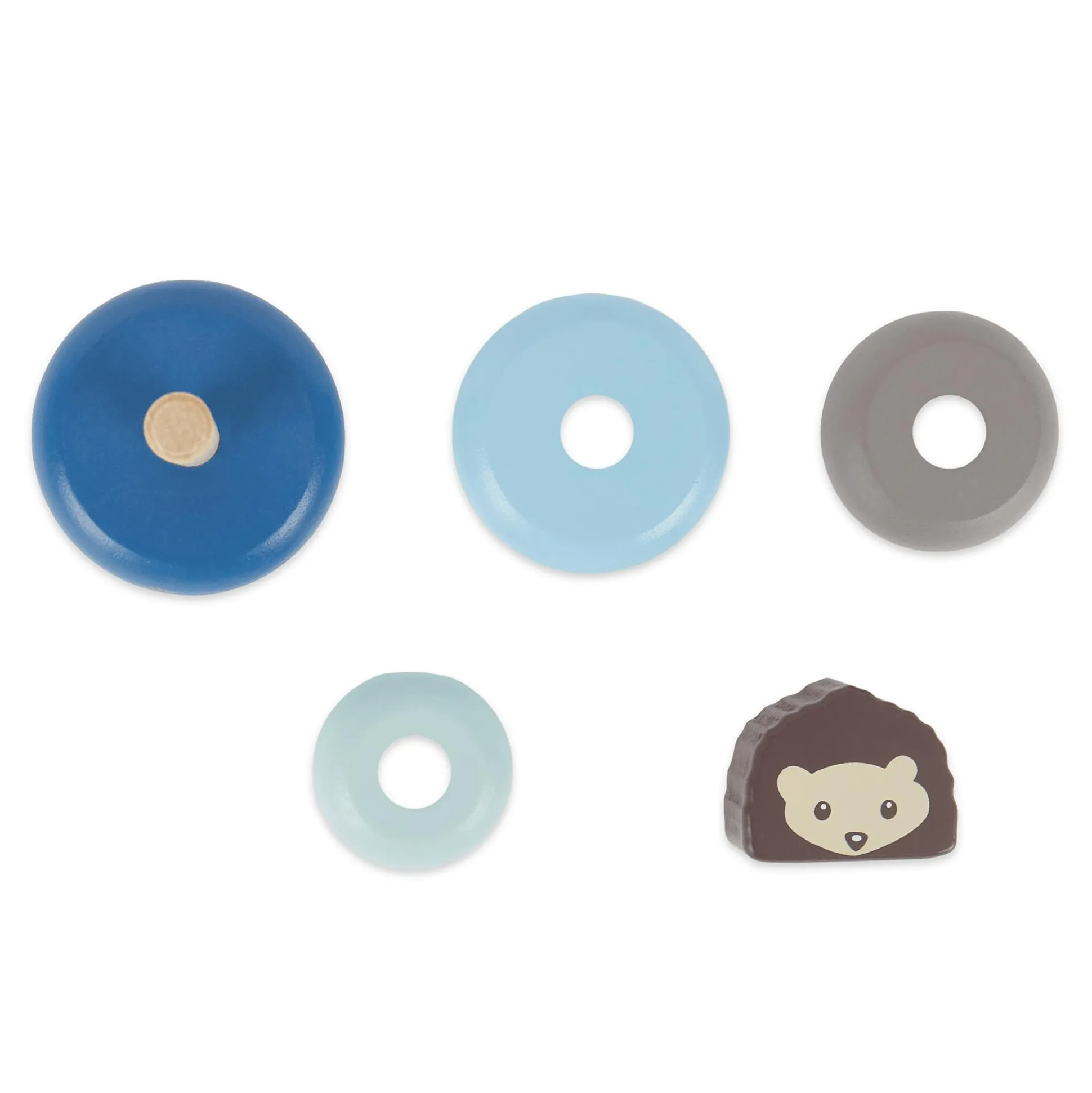 Die verschiedenen Holzringe haben Durchmesser von etwa 4 cm bis 5,5 cm und können nach Größe sortiert werden. Zum Abschluss kann der niedliche Igel-Holzbaustein auf die Spitze des Turms gesteckt werden und dank der fest verschraubten Holzstange steht alles sicher und stabil.Das dezente Classic-Blue-Mix-Farbdesign macht diesen Stapelturm zu einem echten Hingucker. Mit seinen kompakten Abmessungen ist er auch unterwegs leicht zu verstauen.
