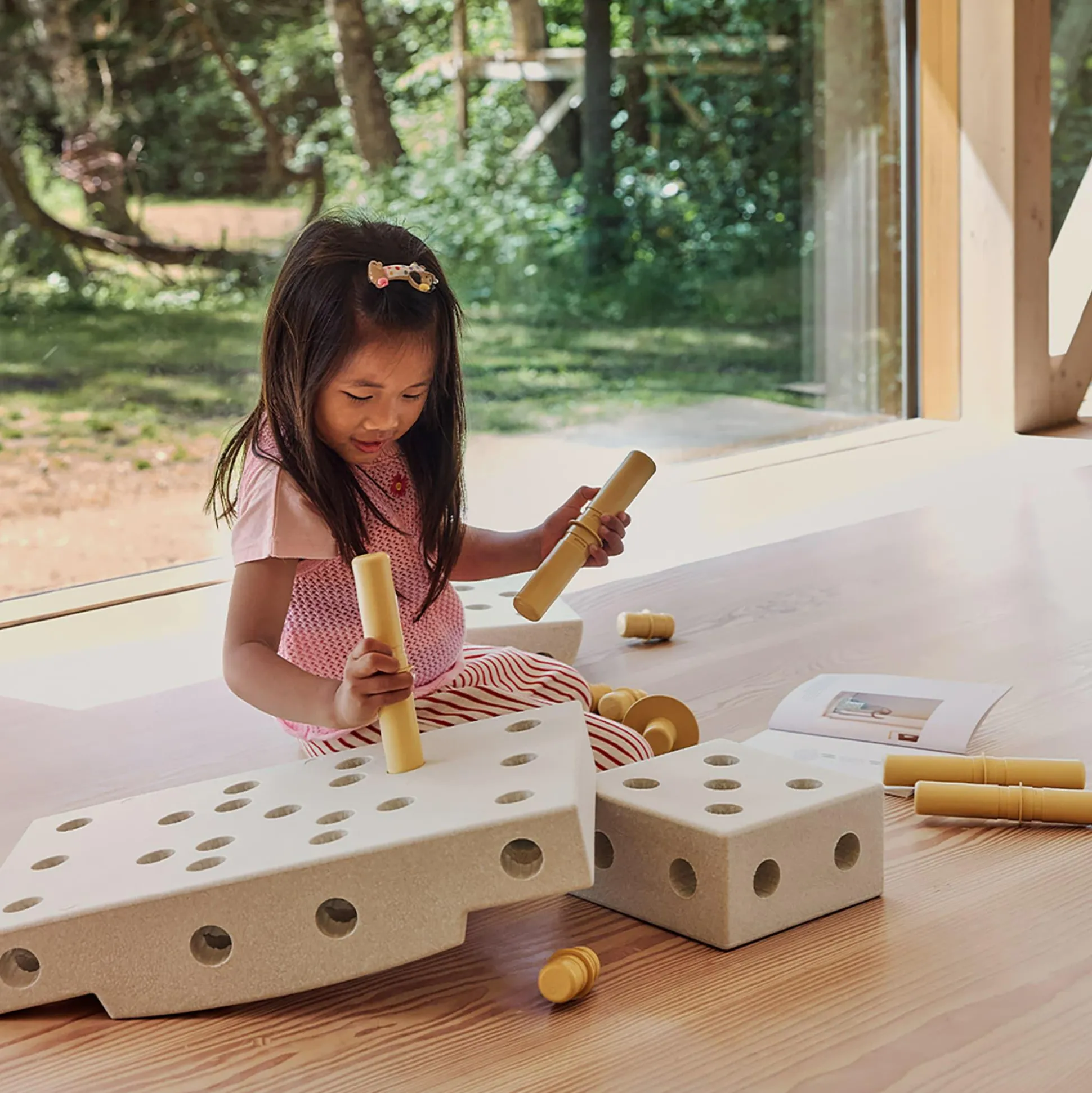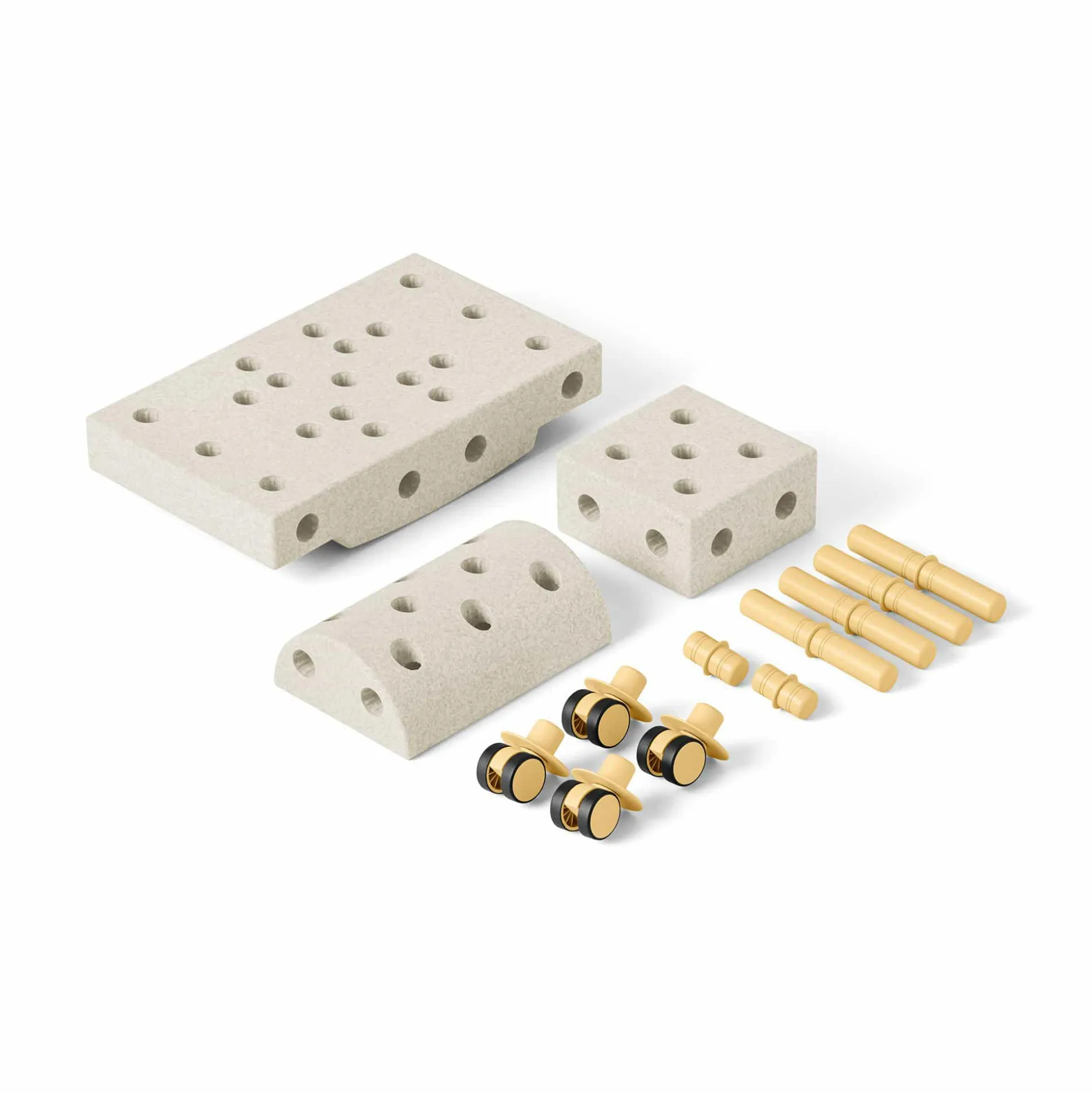 - 14 Elemente (3x Blöcke, 6x Verbinder, 4x Drehrollen, 1x Inspiration Booklet)