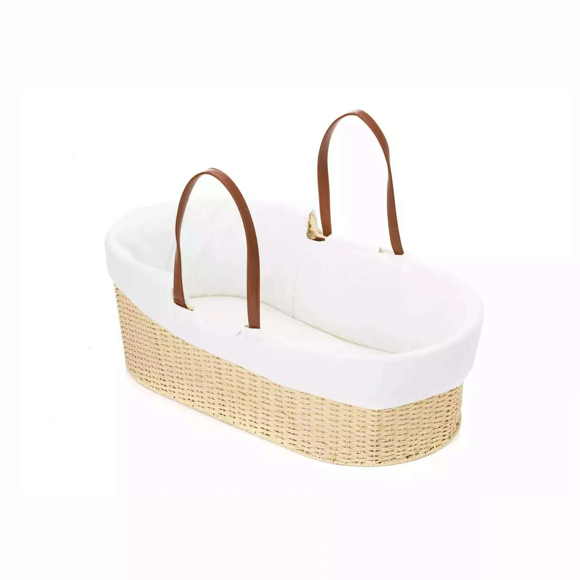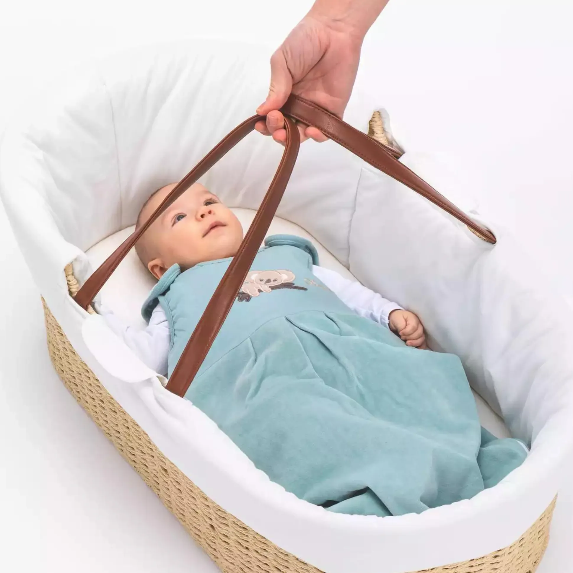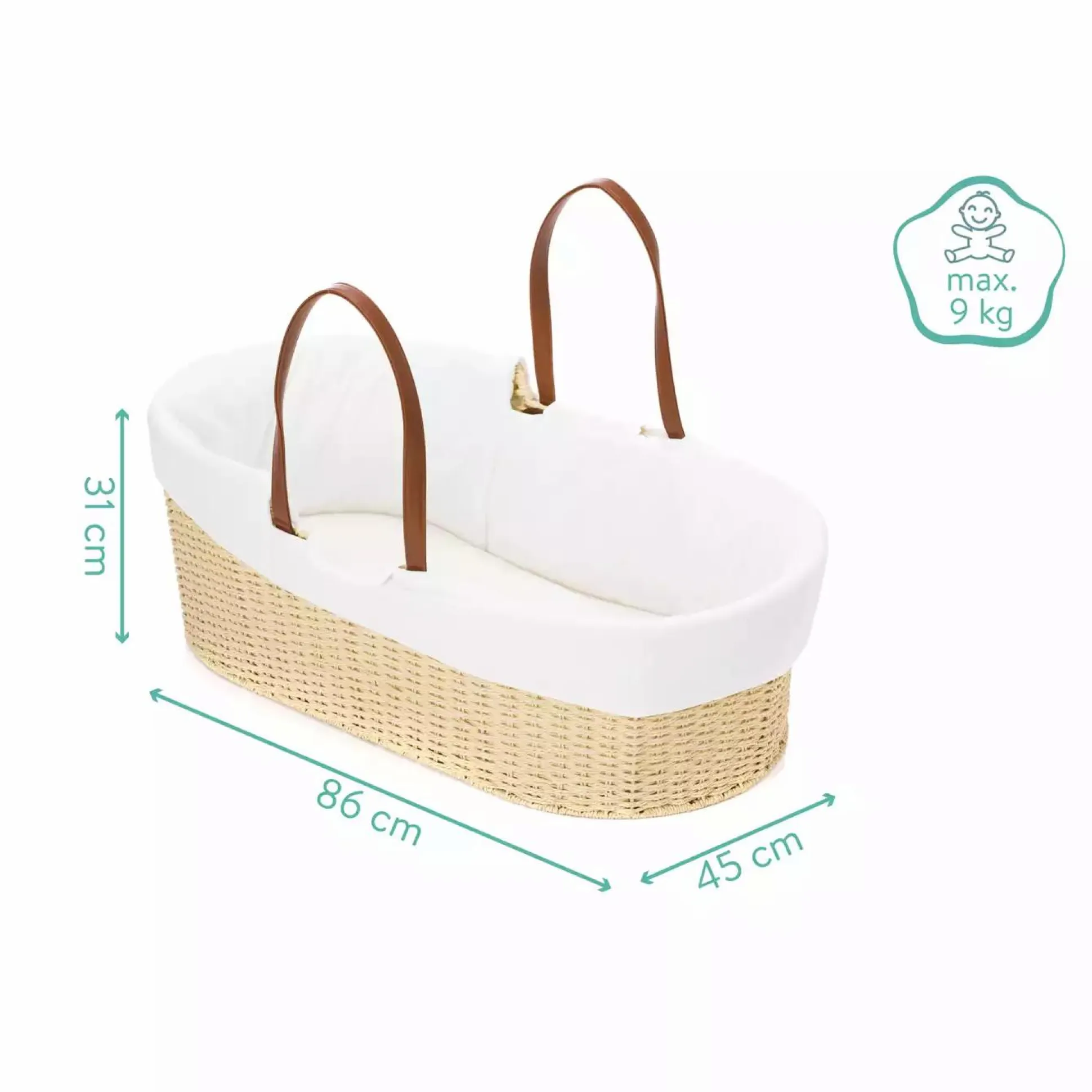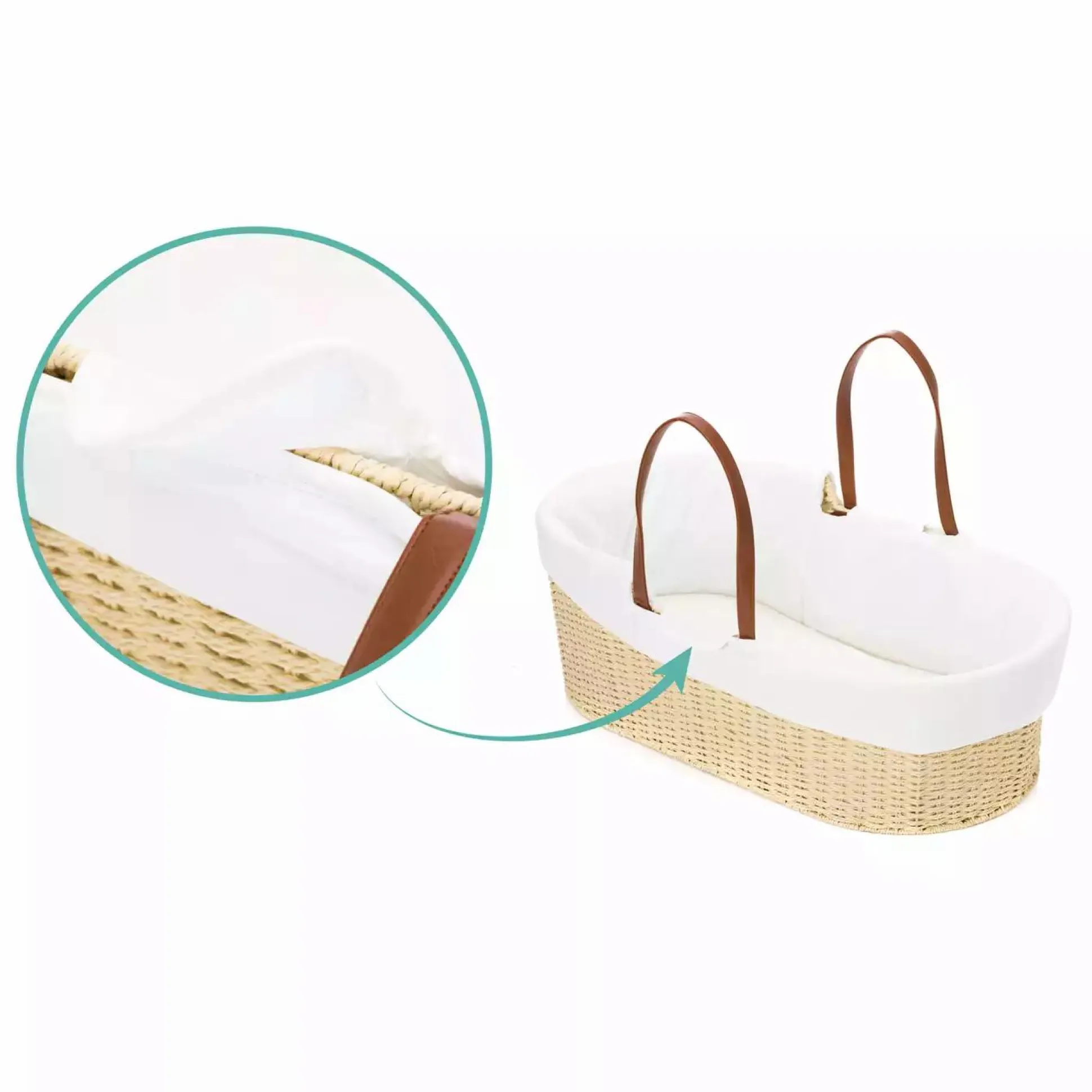 Natürlich spielen hier die verwendeten Materialien auch eine große Rolle. Deswegen wurden sowohl für den Korb als auch den Überzug ausschließlich natürliche Materialien verwendet. Der Korb wird in einer traditionellen Korbbauweise aus einem speziellen reißfesten Korbpapier auf ein Metallgestell geflochten. Der Bezug inklusive dem Matratzenbezug ist aus 100% reiner Baumwolle gefertigt und ist abnehmbar und waschbar. An den praktischen Tragegriffen aus veganem PU-Leder lässt sich der Moseskorb auch wunderbar tragen.