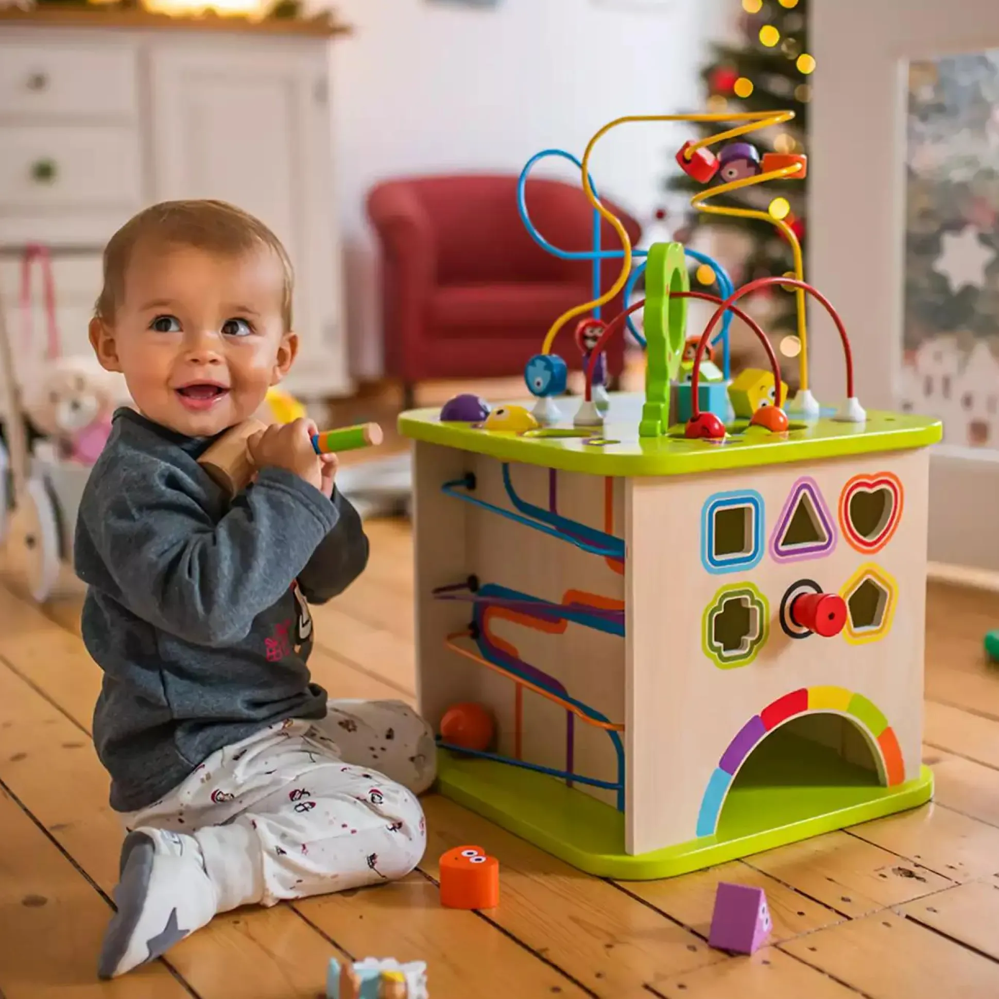 - Kinder können die bunten Kugeln durch das Labyrinth lenken, die Farben der Würfel benennen, Tiere zählen, Teile nach Form, Farbe und Größe sortieren, und Begriffe wie „auf, unter, drinnen und draußen“ kennenlernen