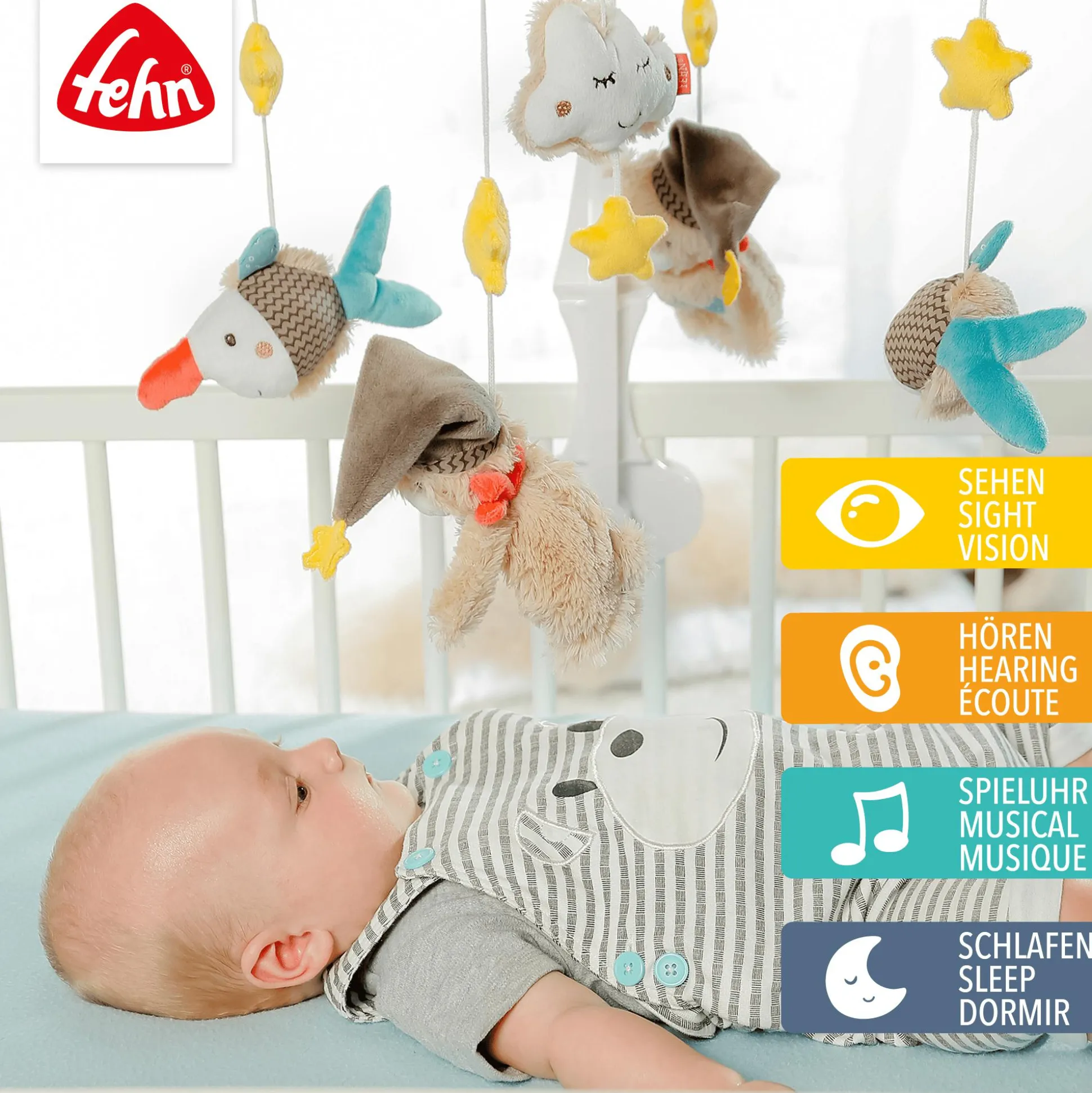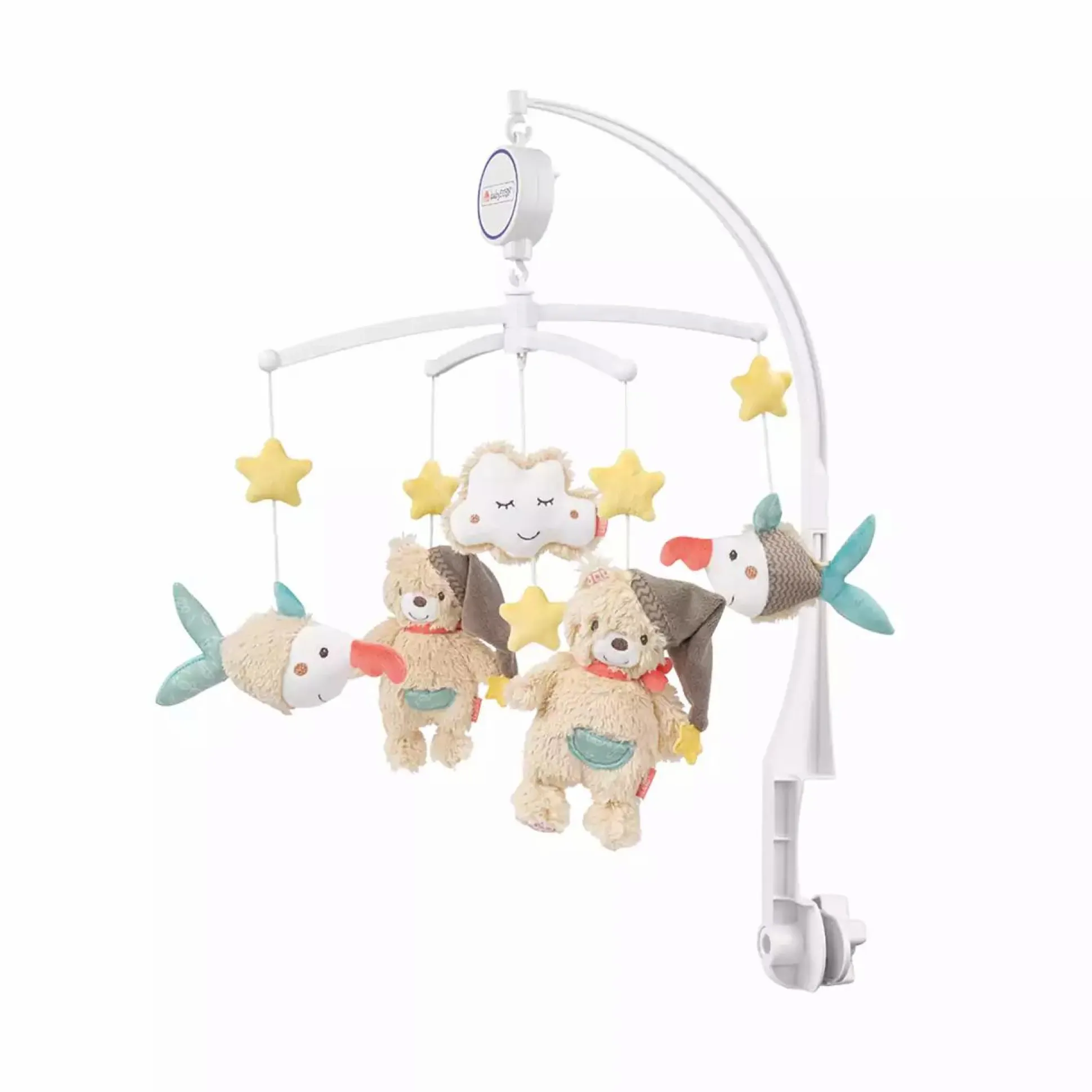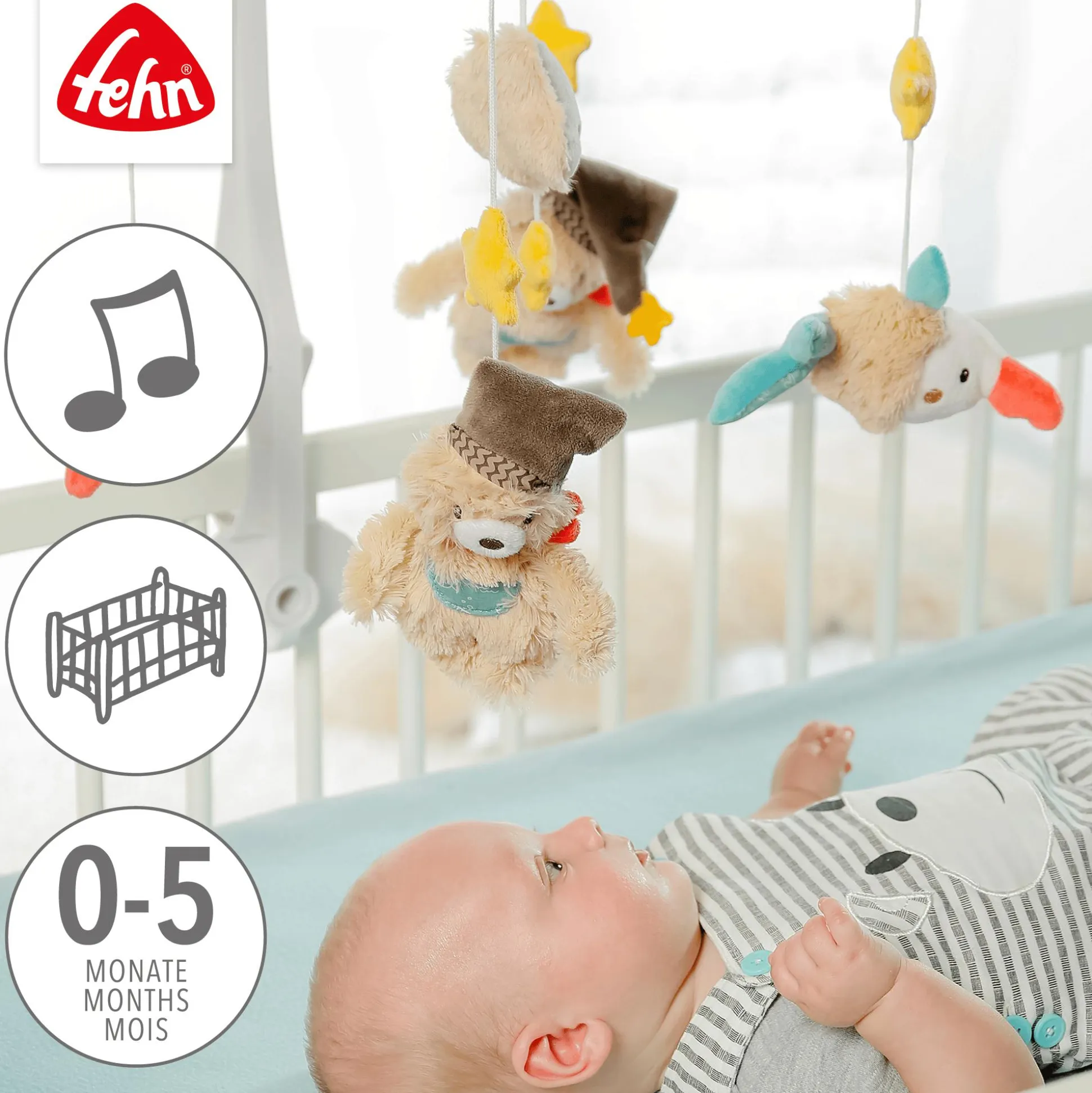 Bruno & Sammy sind gemeinsam ein unschlagbares Team und helfen Allerkleinsten in den Schlaf zu finden: Das fehn Musik-Mobile Bruno mit mechanischen Spielwerk gibt eine sanfte Melodie wieder. Das Liedchen beruhigt Babys und sie schlummern weiter. Bruno, der Bär und sein Freund Sammy, der Sägefisch nehmen die Allerkleinsten mit auf eine zauberhafte Reise. Die zwei Schmusetierchen regen Babys Neugier an, die entzückt Beobachten und ins Staunen gelangen. Bruno & Sammy kreisen zwischen Mond und Sternen durch die Galaxie und sehen in den zarten Pastelltönen an jedem Babybettchen einfach süß aus. Alle Figuren lassen sich abnehmen und bis 30 °C waschen. Die Halterung lässt sich leicht bedienen und am Kinderbett anbringen.