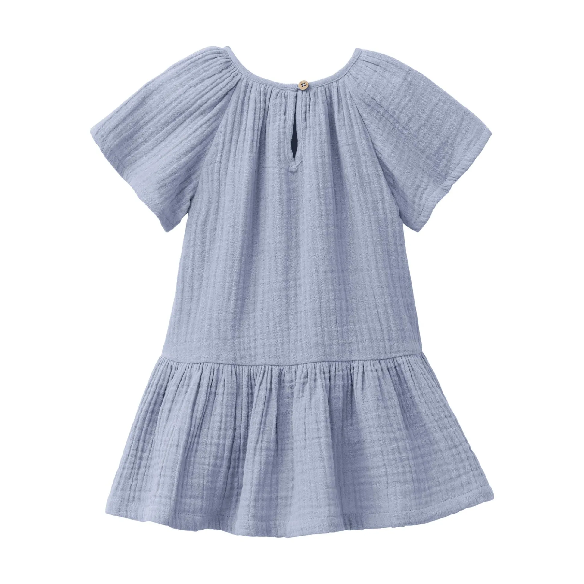 Das Musselin-Kleid von People Wear Organic ist ein sommerlich leichtes Kleid aus 100% Bio-Baumwolle – ideal für warme Tage. Der weiche, strukturierte Musselin-Stoff sorgt für ein luftiges Tragegefühl und ist besonders sanft zur empfindlichen Kinderhaut. Der lockere Schnitt mit angesetztem Volant und kleinen Falten an Halsausschnitt und Schulterpartie verleiht dem Kleid eine schöne, schwingende Silhouette.