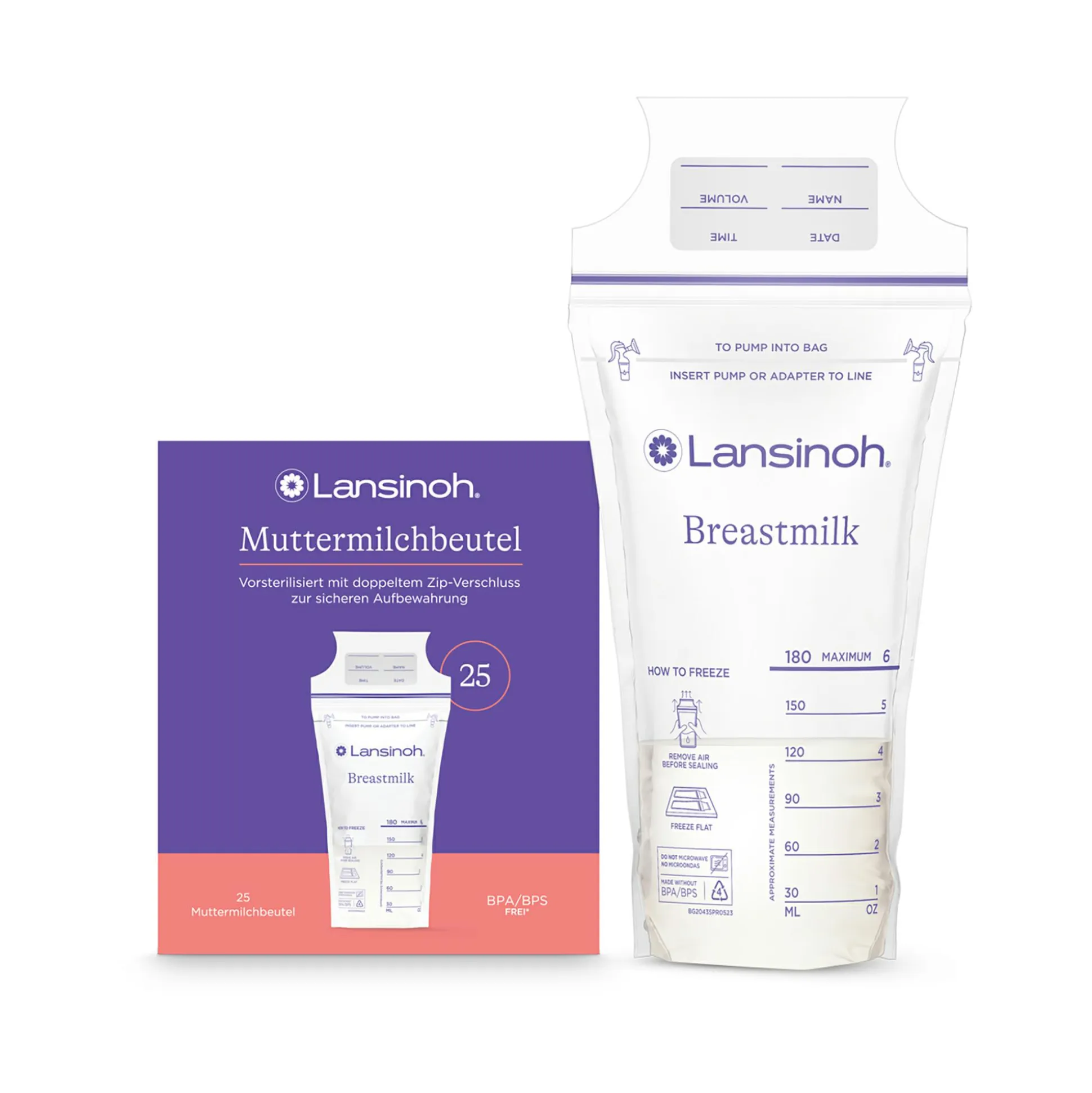Die Lansinoh® Muttermilchbeutel wurden speziell für die sichere und platzsparende Aufbewahrung von Muttermilch im Kühlschrank und Gefrierfach entwickelt. Die strapazierfähigen Beutel bestehen aus lebensmittelechtem Polyethylen, sind vorsterilisiert und hygienisch verschlossen. Der doppelte Zip-Verschluss und die stabilen Nähte schützen die Muttermilch. Durch den Klickverschluss kann man genau spüren und hören, dass der Beutel sicher verschließt. So können die Beutel platzsparend liegend eingefroren und schneller aufgetaut werden. Jeder Lansinoh® Muttermilchbeutel kann mit bis ca. 180 ml Muttermilch befüllt werden. Mithilfe der aufgedruckten Skala kann die Füllmenge bestimmt werden. Das praktische Beschriftungsfeld befindet sich außerhalb der Befüllzone, damit nicht versehentlich durch spitze Stifte Löcher im Beutel entstehen. Mütter können ganz bequem und zeitsparend mit allen Lansinoh® Milchpumpen direkt in den Lansinoh® Muttermilchbeutel abpumpen – so geht kein wertvoller Tropfen Muttermilch verloren (Pump into bag). Adapter für weitere Pumpen können separat erworben werden. Die praktische Spenderpackung mit 25 vorsterilisierten Beuteln macht die komfortable Entnahme einzelner Muttermilchbeutel möglich.