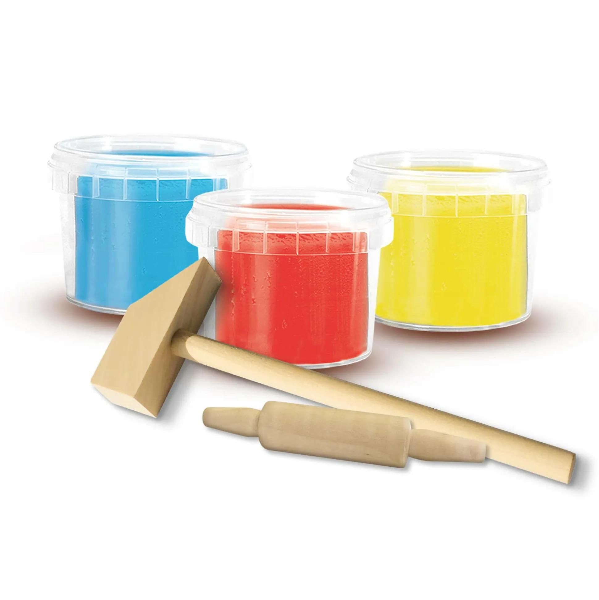 Mit den drei großzügigen Knetdosen in den leuchtenden Farben Rot, Gelb und Blau (jeweils ca. 90 g) kann dein Schatz nach Herzenslust modellieren, während der kleine Holzhammer und die Knetrolle aus Holz für echtes Werkstatt-Feeling im Kinderzimmer sorgen.