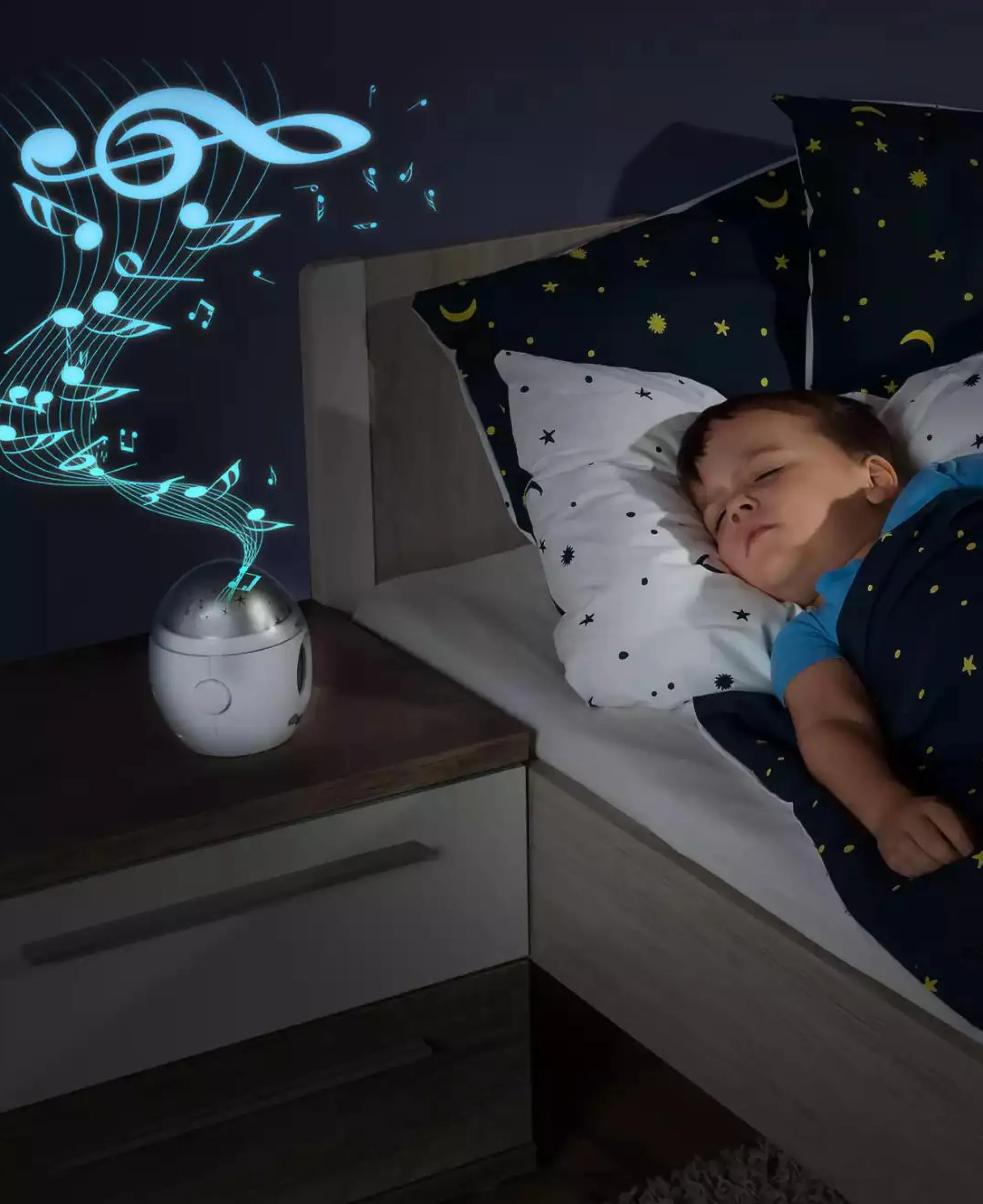 - es wird gerade so viel Licht projiziert, dass es nicht vollkommenen dunkel ist, der Schlaf des Kindes aber nicht gestört wird