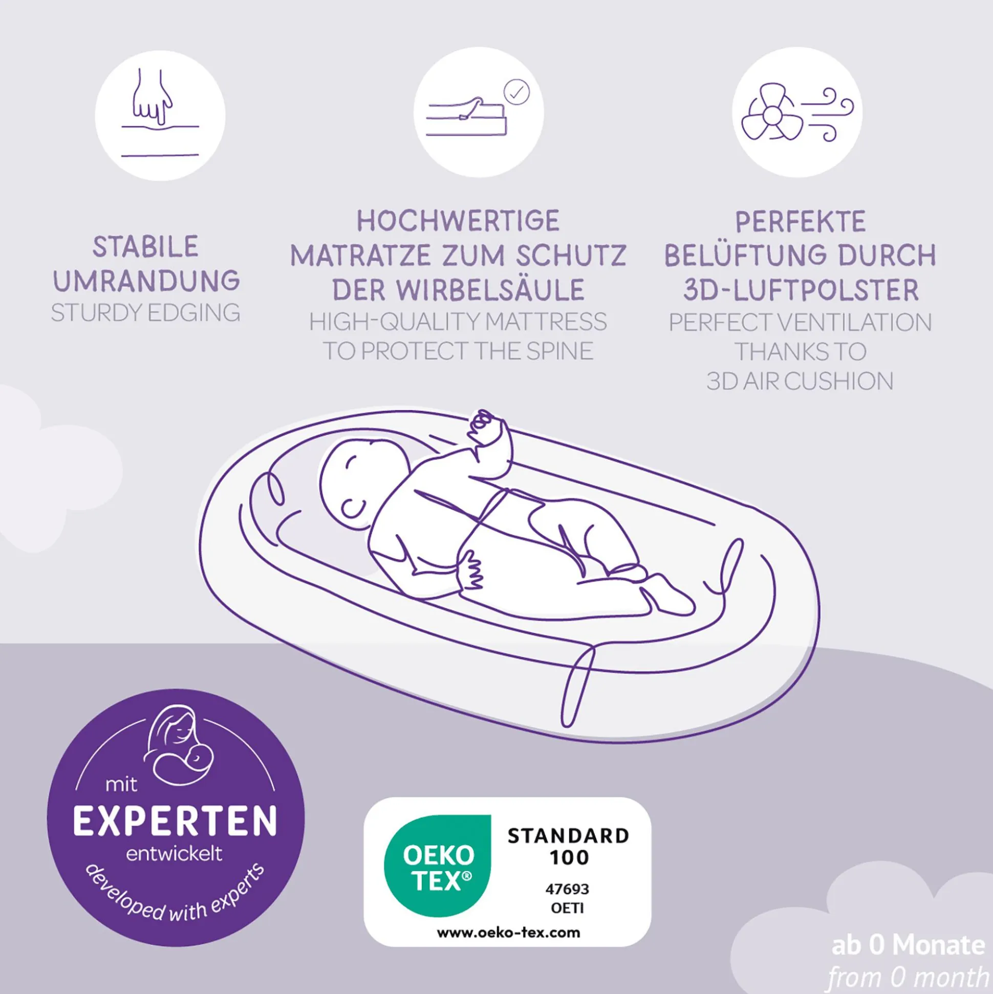 Das Nest Home Air von Träumeland ist ein sicherer, kuscheliger Rückzugsort, wo dein kleiner Schatz behütet schlummern und von seinen ersten großen Flügen träumen kann. Dank der Oberseite aus 100% Baumwoll-Jersey und einem 3D-Luftpolster, der Unterseite aus 100% Polyester und der Füllung aus Softschaum bleibt es immer angenehm frisch, denn Schwitzen gehört ab jetzt der Vergangenheit an.Dabei stützt das Nestchen sanft die Wirbelsäule und sorgt für süße Träume mit maximalem Komfort. Die stabile Umrandung ist wie eine schützende Umarmung und gibt extra Sicherheit.