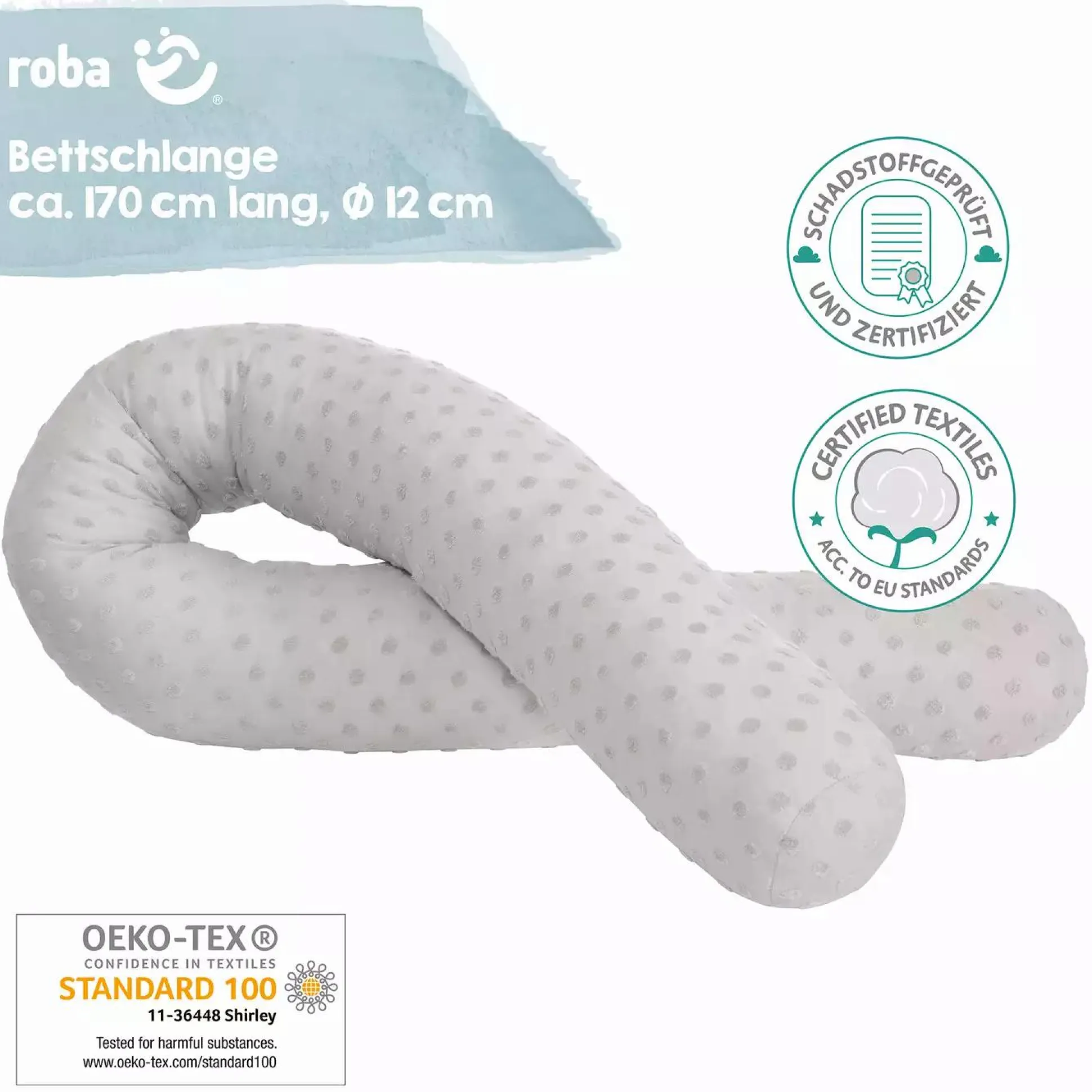 In einem Gitterbett schlafen Babys zwar sicher, können sich aber leicht das noch empfindliche Köpfchen stoßen. Diese zusätzliche Nestchenschlange Terry Dot von Roba sorgt dafür, dass das Baby sich nicht an den harten Stäben stoßen kann. Die flexible Schlange ist weich, schützt zudem vor Zugluft und sorgt für eine Schlafumgebung, in der sich das Baby wohl fühlt. Die ca. 170 cm lange Bettschlange wird ganz einfach entlang des Gitters in das Bettchen gelegt.