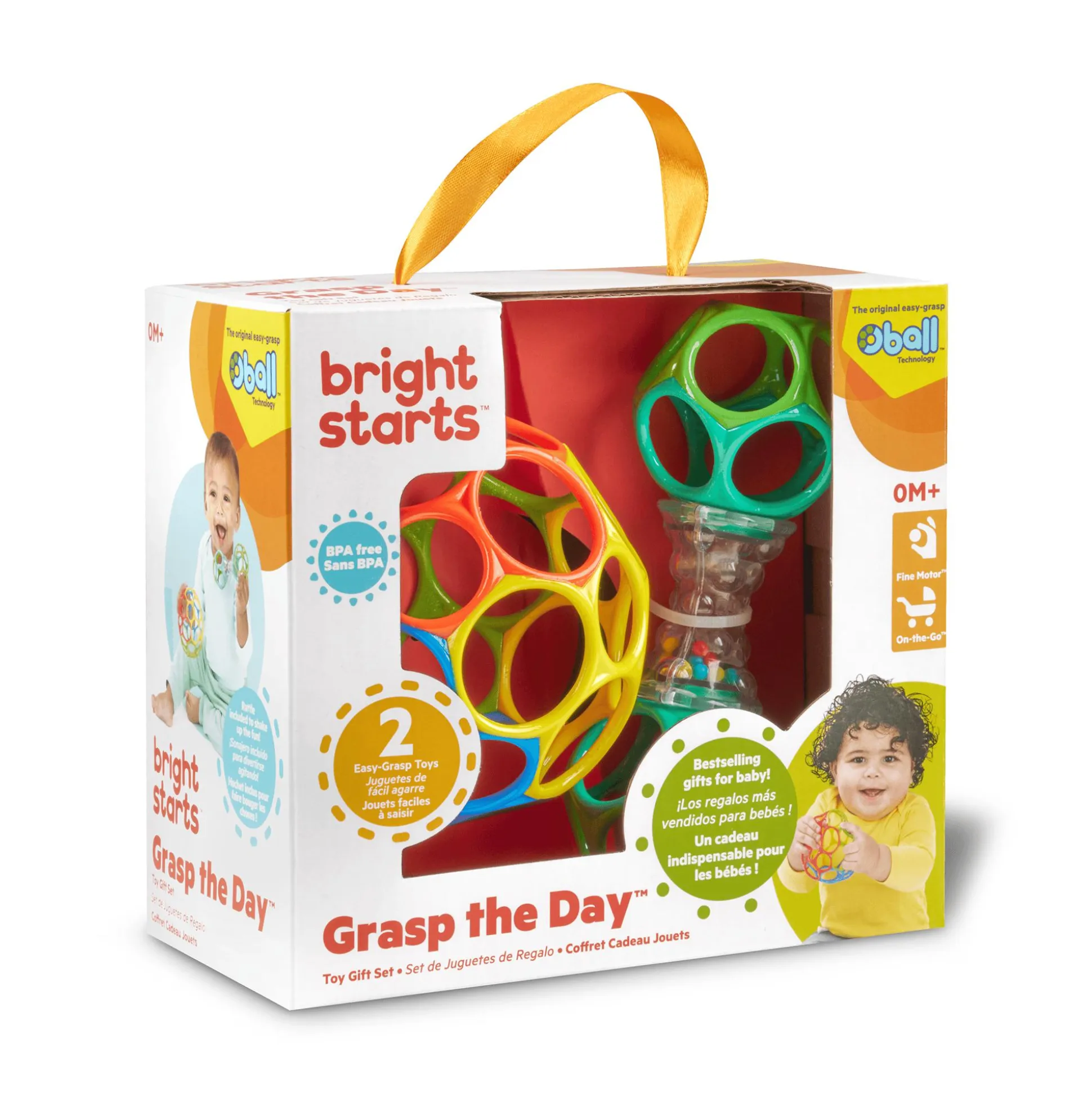 Das Geschenkset „Grasp the Day“ von Bright Starts enthält zwei der beliebtesten Oball-Spielzeuge, die deinem Kind bereits ab der Geburt Freude bereiten. Die Spielzeuge sind mit ihren leicht greifbaren Details und Grifflöchern perfekt für kleine Hände und fördern die Feinmotorik spielerisch. Der Oball Shaker beeindruckt mit einem durchsichtigen, strukturierten Griff und bunten Perlen, die faszinierende Geräusche machen, die flexiblen Enden bestehen aus dem bewährten Oball-Material. Der Oball Classic begeistert mit 32 großen Grifflöchern und einem weichen, stabilen Design, ideal zum Greifen, Schütteln und Rollen.