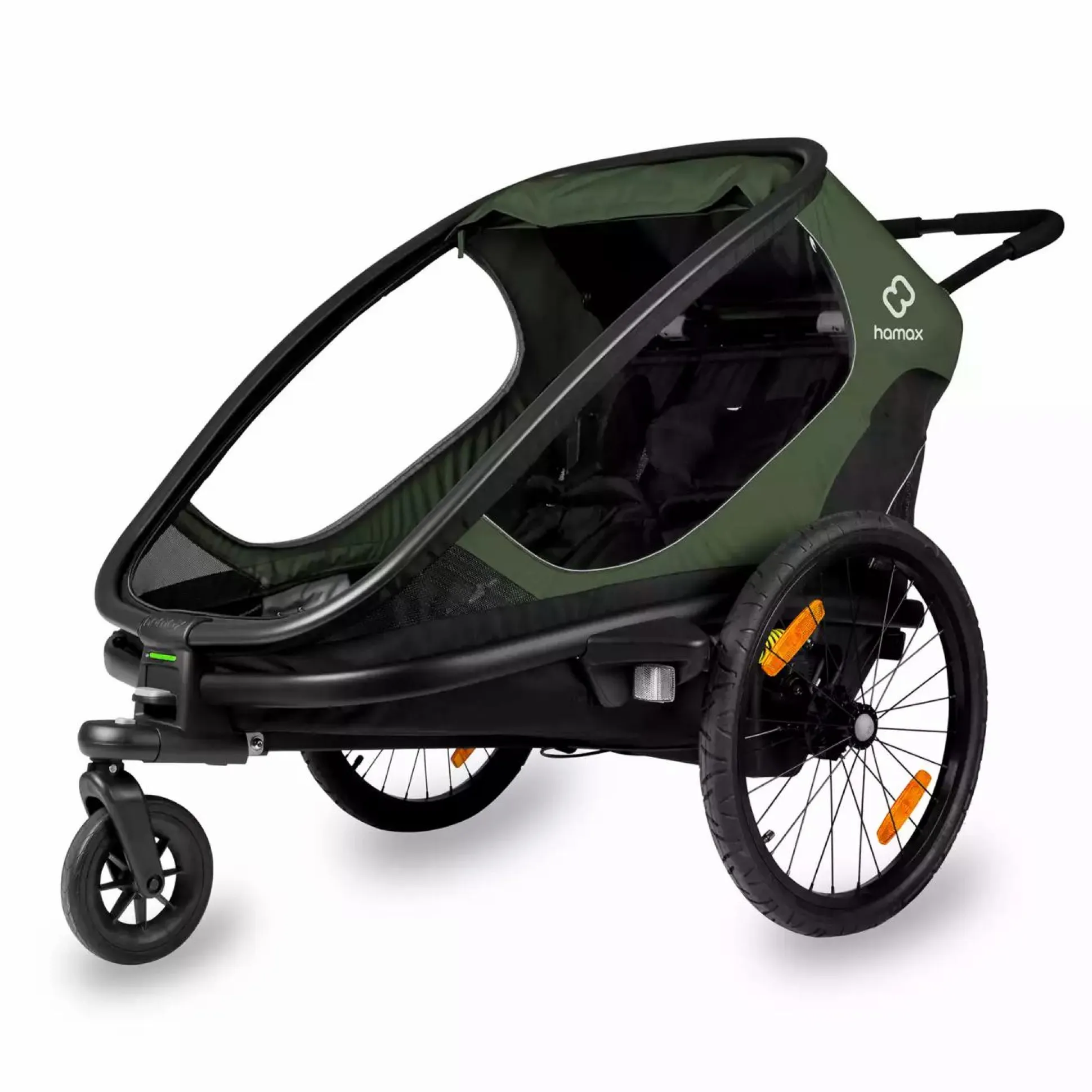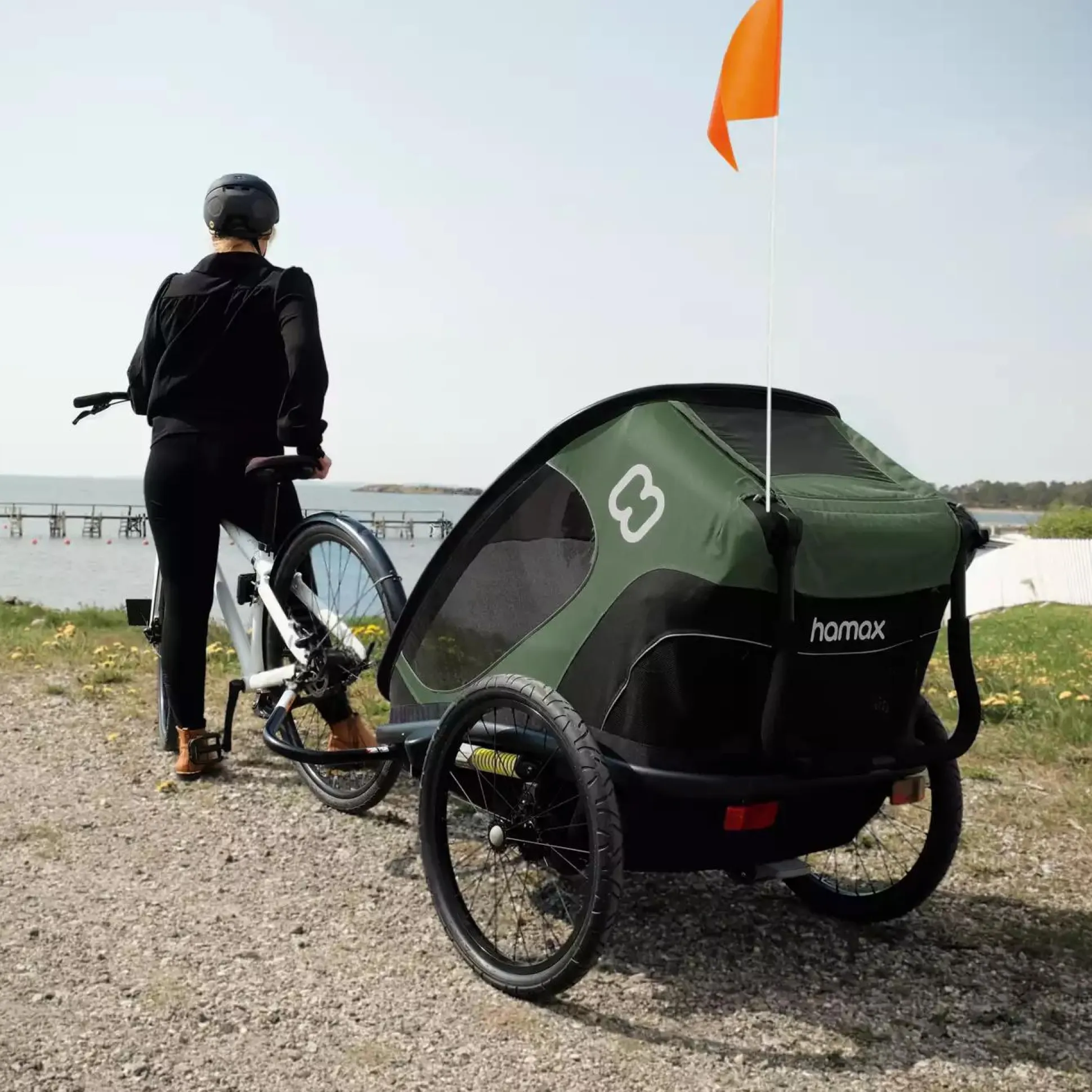Der Outback Fahrradanhänger von Hamax verfügt über einen soliden Aluminiumrahmen der optimalen Schutz für die Kinder und ein großzügiges Platzangebot im Cockpit bietet.