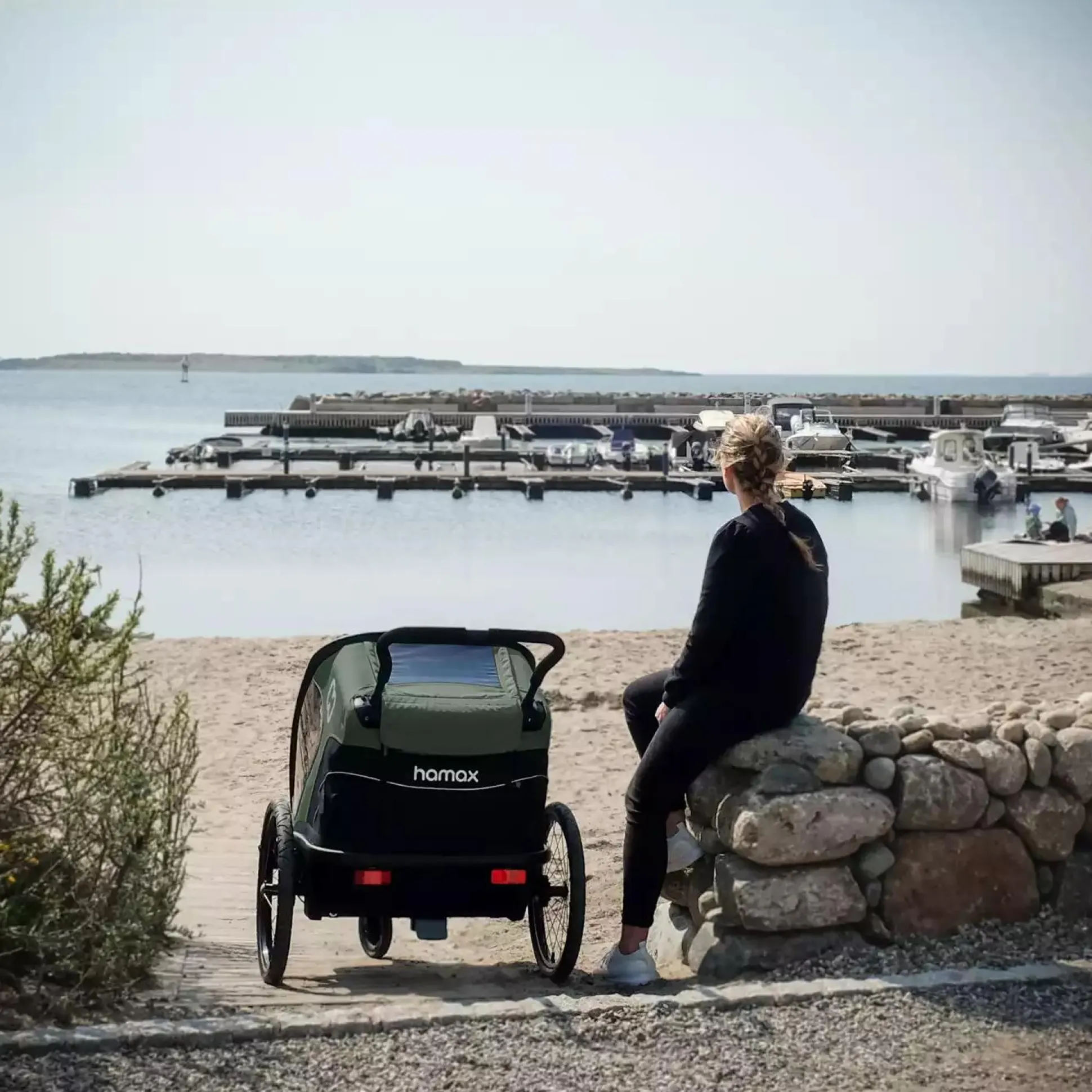 Der Fahrradanhänger Hamax Outback verfügt über einen komfortablen Innenraum und große Fenster, die deinem Kind eine gute Sicht ermöglichen. Der Anhänger lässt sich problemlos zusammenfalten und transportieren und eignet sich für verschiedenste Einsatzmöglichkeiten in unterschiedlichstem Gelände. Die einstellbare Radaufhängung verschafft deinem Kind eine ruhige und gleichmäßige Fahrt. Der Fahrradanhänger hat einen niedrigen Schwerpunkt, und ist damit sehr stabil, deswegen eignet er sich auch perfekt hinter einem E-Bike.