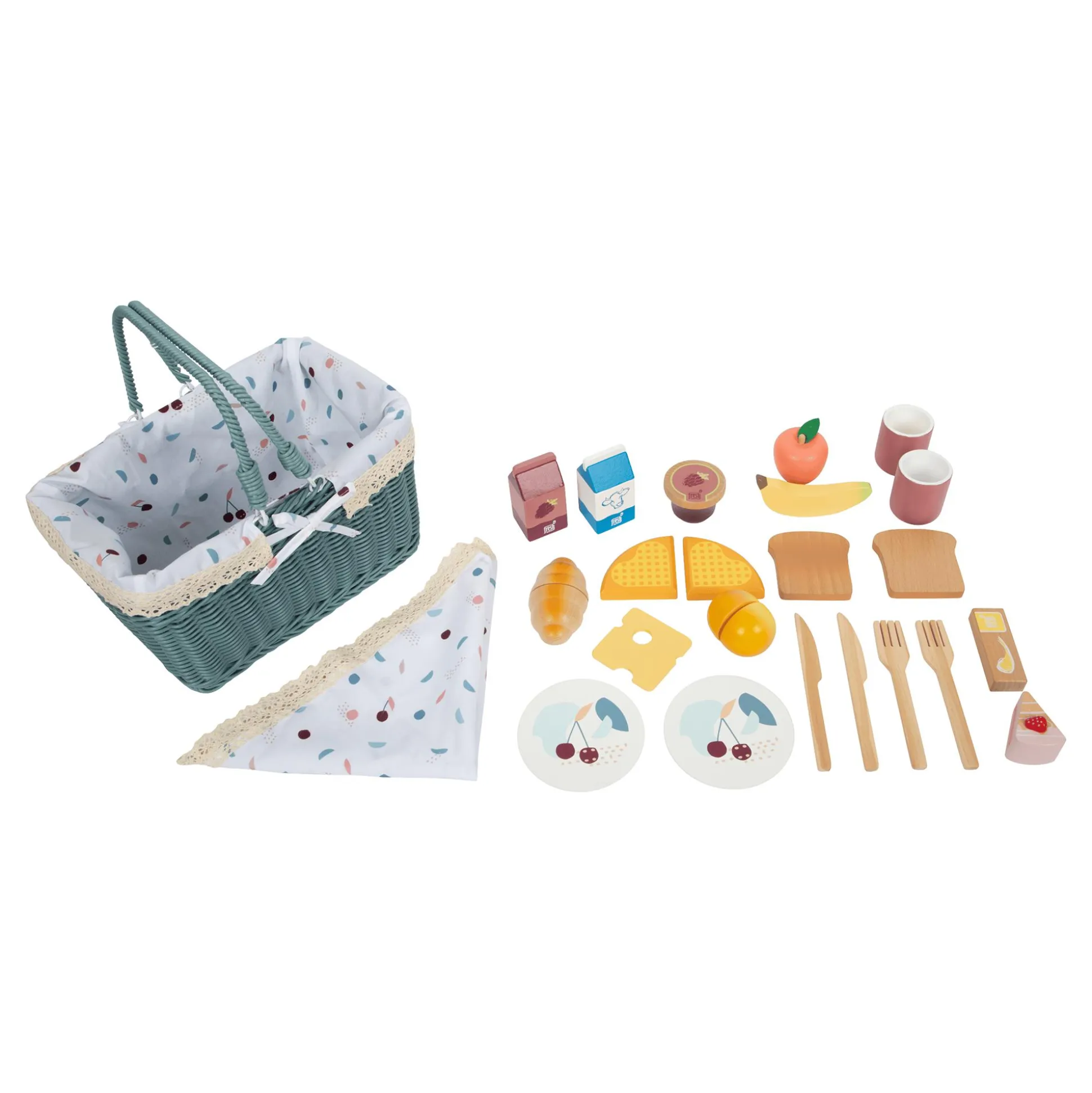- 1 Picknickkorb, 1 Picknickdecke, 1 Orange, 1 Croissant, 2 Teller, 2 Messer, 2 Gabeln, 2 Becher, 1 Apfel, 1 Stück Kuchen, 1 Banane, 2 Scheiben Brot, 1 Scheibe Käse, 1 Stück Butter, 1 Packung Saft, 1 Packung Milch, 1 Becher Marmelade, 2 Waffeln