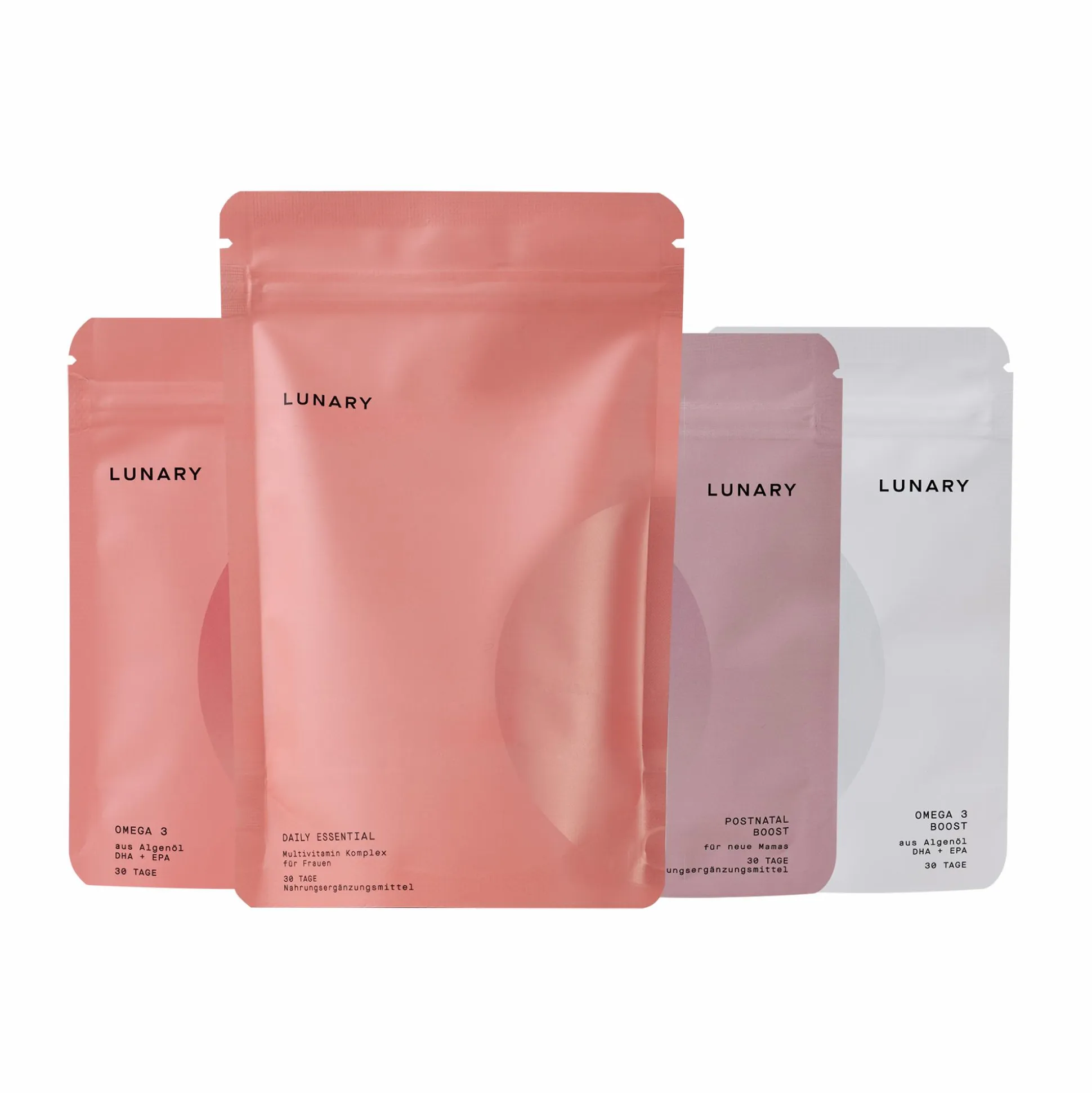 Das Postnatal Set Daily Essential plus Postnatal Boost von Lunary wurde speziell für Frauen in der sensiblen Zeit nach der Geburt entwickelt. Denn gerade jetzt brauchst du Unterstützung – für dich und dein Baby. Dieses klug kombinierte Nährstoffpaket begleitet dich 30 Tage lang mit allem, was dein Körper in der Stillzeit braucht, um Energie zu tanken, das Immunsystem zu stärken und dich von innen heraus zu versorgen.