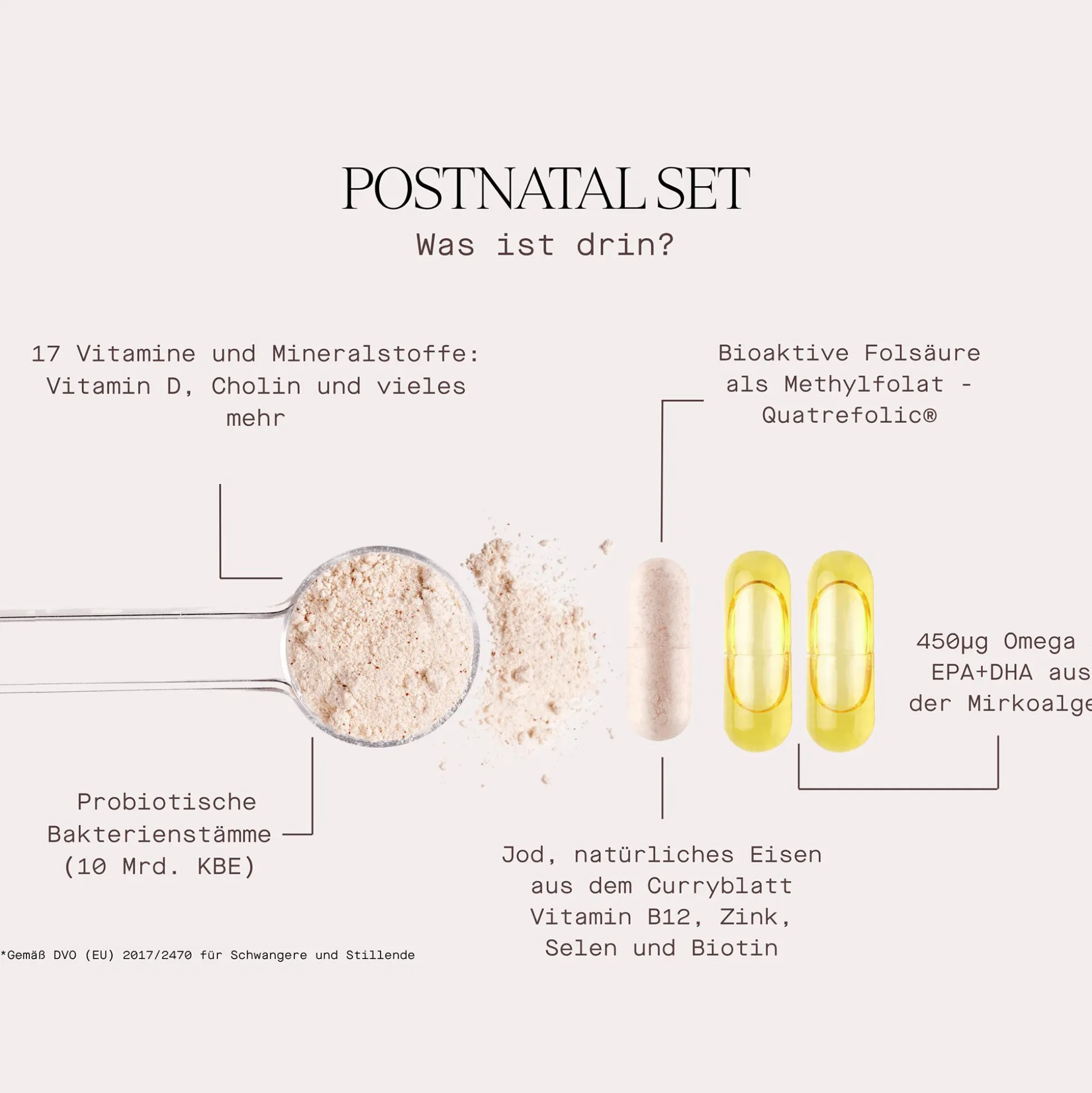 - Lieferumfang: 1x Postnatal Boost,2x Omega 3-Kapseln, 1 x Daily Essential Pulver