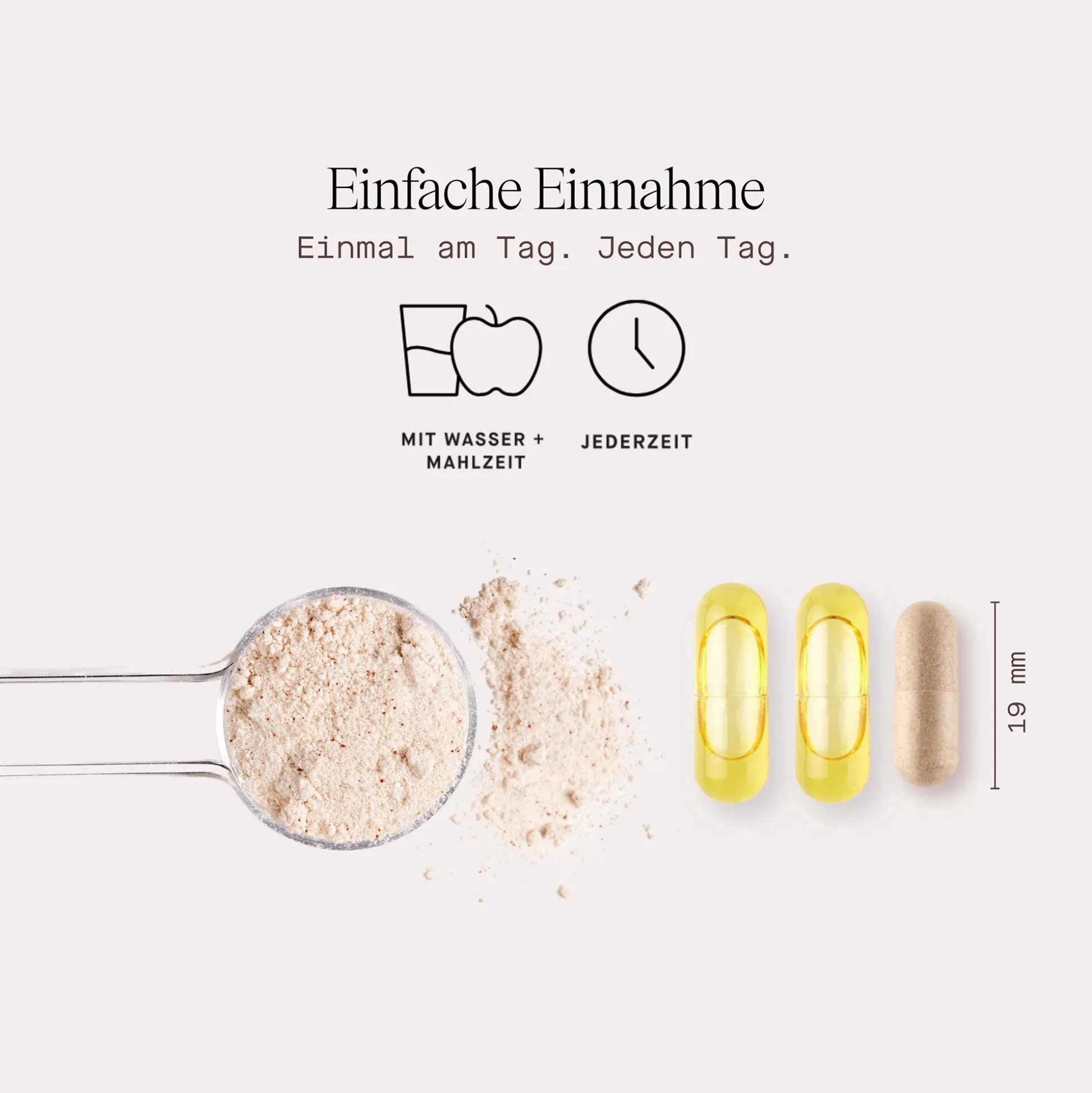 Einnehmen lässt sich das Set ganz unkompliziert: 1 Esslöffel Pulver (Daily Essential), 1 Postnatal BOOST-Kapsel und 2 Omega-3 Kapseln – idealerweise morgens oder vormittags zusammen mit einer leicht fetthaltigen Mahlzeit. So wird die Aufnahme der fettlöslichen Vitamine und Omega-3-Fettsäuren perfekt unterstützt. Vegan, laktosefrei und ohne unnötige Zusatzstoffe – genau das, was dein Körper jetzt verdient.
