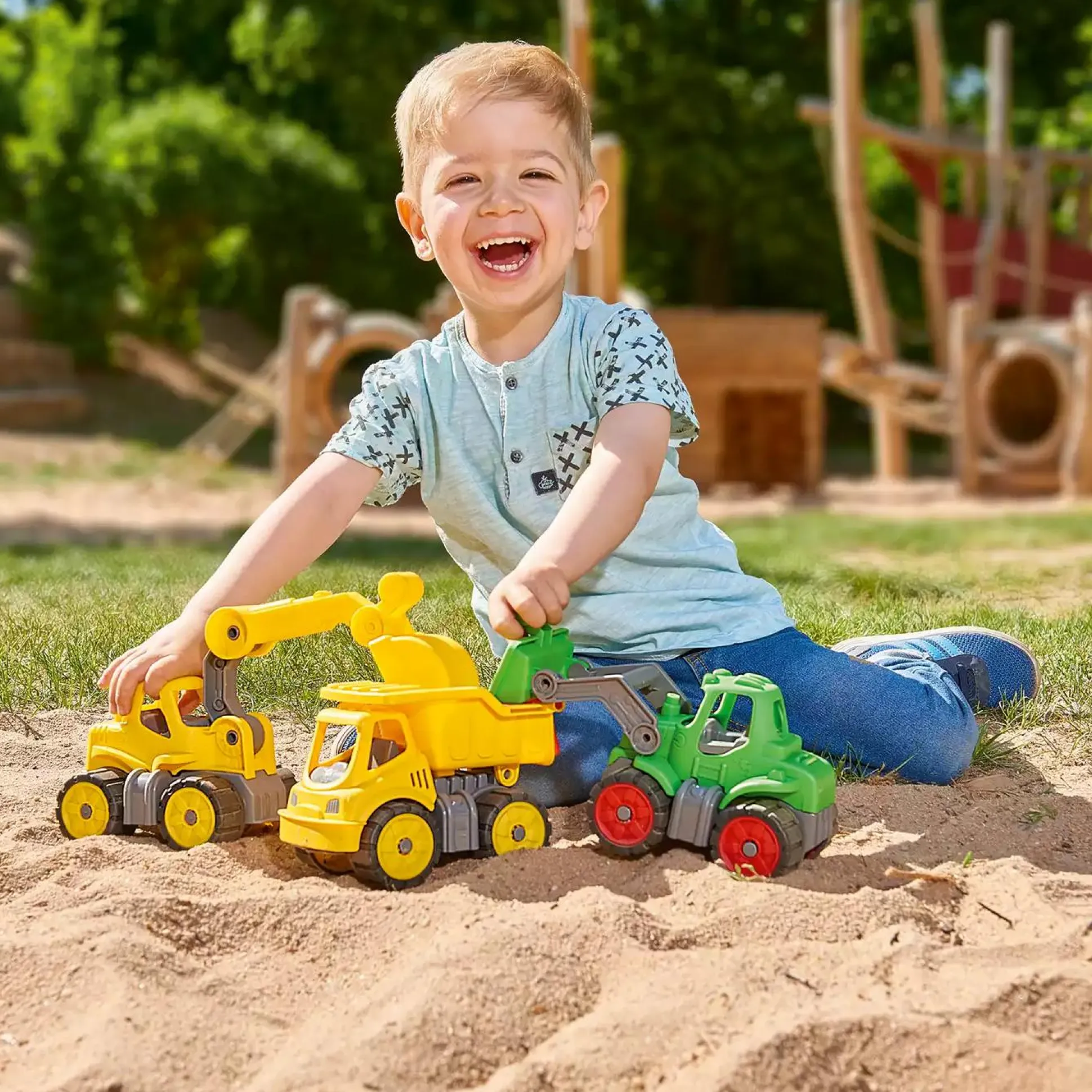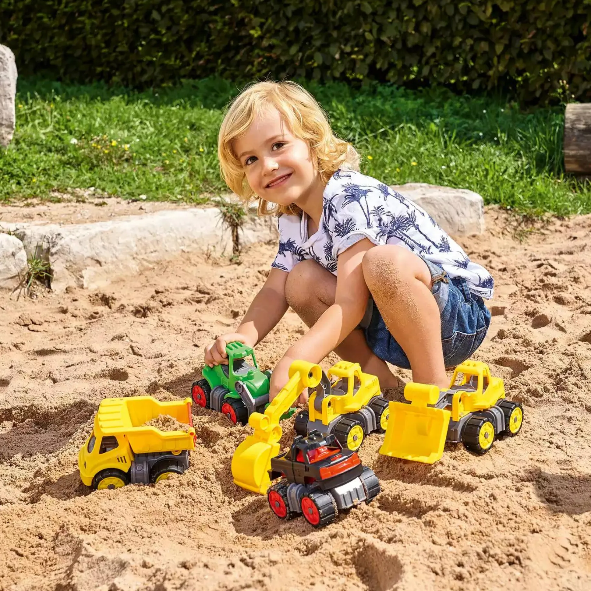 Das Design ist speziell auf die Ergonomie kleiner Kinderhände abgestimmt, so dass diese das Fahrzeug leicht schieben, transportieren oder die Ladefläche leeren können. Die widerstandsfähigen Räder aus weicherem Kunststoff sind ein besonderes Extra, denn sie lassen sich leicht reinigen, hinterlassen keine Streifen und sind dadurch ideal zum Spielen im Kinderzimmer und im Freien geeignet.