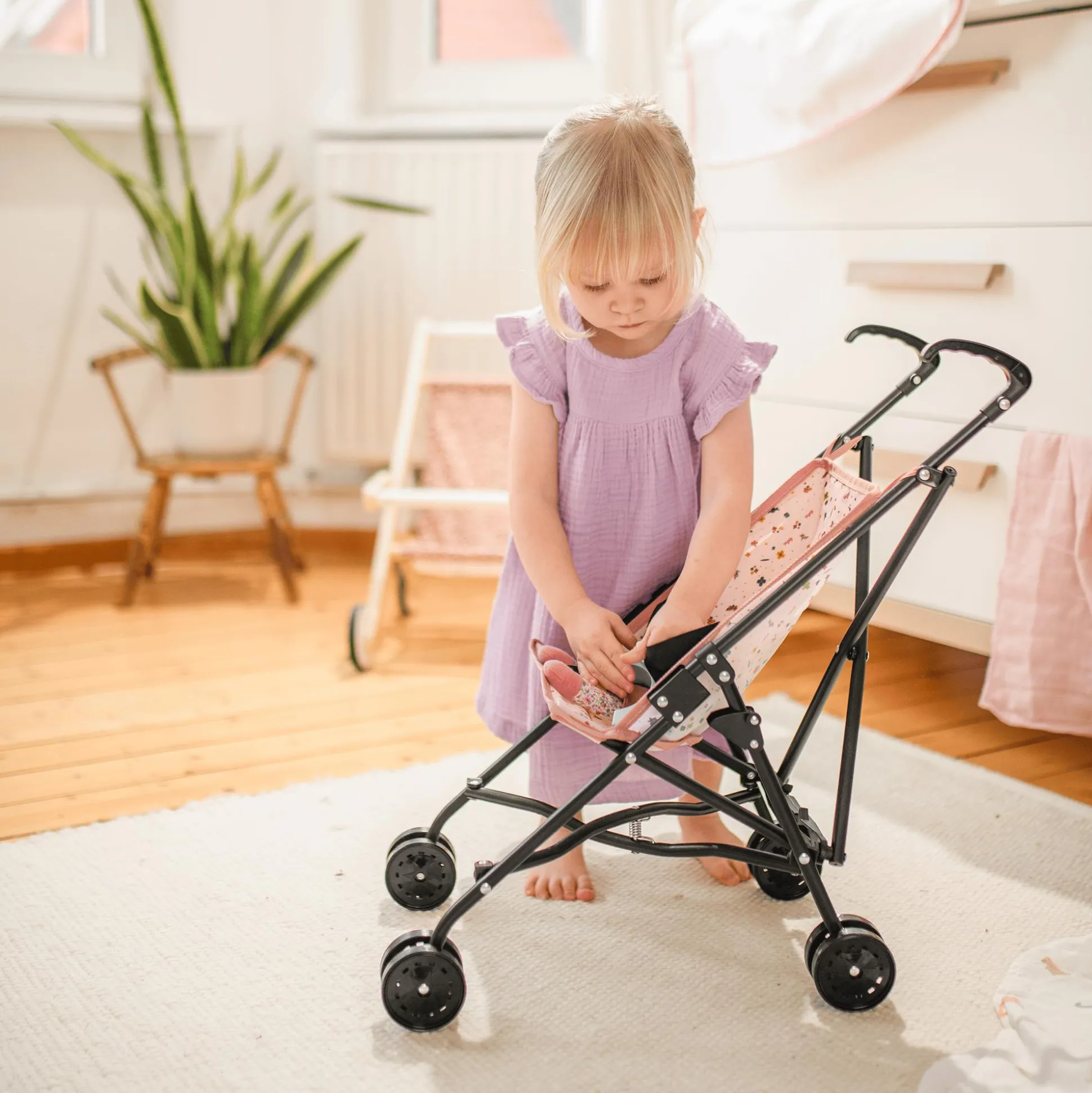 Dank der Doppelrollen lässt sich der rosa Buggy mühelos schieben, sodass sogar die jüngsten Puppenmamas und -papas ihre Puppe spielend leicht durch die Gegend manövrieren können. Die Sicherheit der Puppe ist dabei stets gewährleistet, denn der Buggy ist mit einem Anschnallgurt ausgestattet, der dafür sorgt, dass sie während der Fahrt sicher an ihrem Platz bleibt.