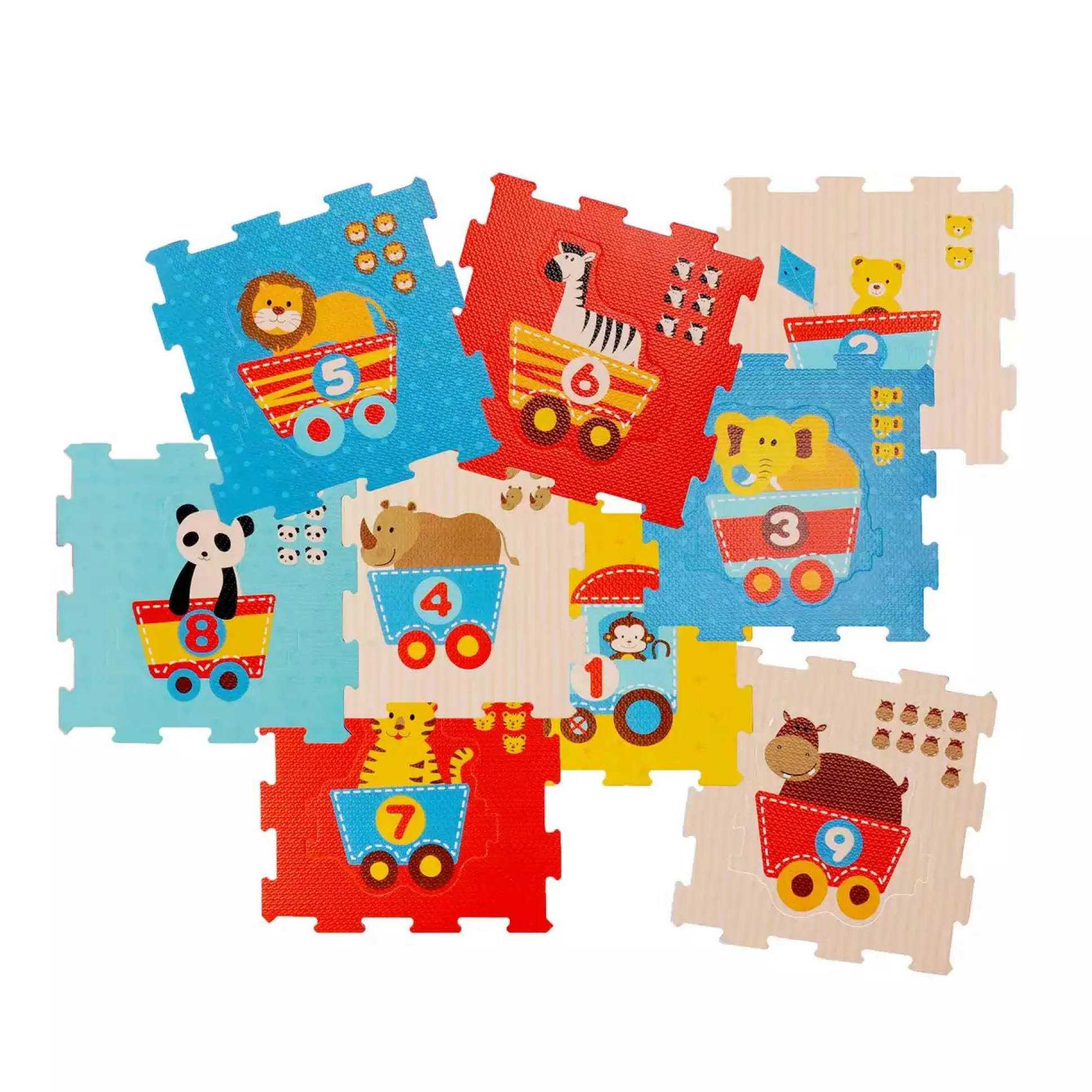 Diese bunte Baby Puzzlematte von Bieco besteht aus 9 Puzzleteilen und 19 Einzelteilen die mit niedlichen Tierbildern bedruckt sind. Sie regt beim Zusammensetzen und Auseinandernehmen das Denkvermögen an und trainiert die Geschicklichkeit der Kleinen. Die ist aus weichem Schaumstoff und schadstofffrei. Ein Zusammensetzen der Platten als Würfel ist ebenso möglich. Außerdem können die Tiere aus der Mitte herausgetrennt und so einzeln zum Spielen verwendet und zusammengesetzt werden, ohne Puzzlestück. Die Tiere ergeben so einen lustigen Tier-Zoo-Zug.