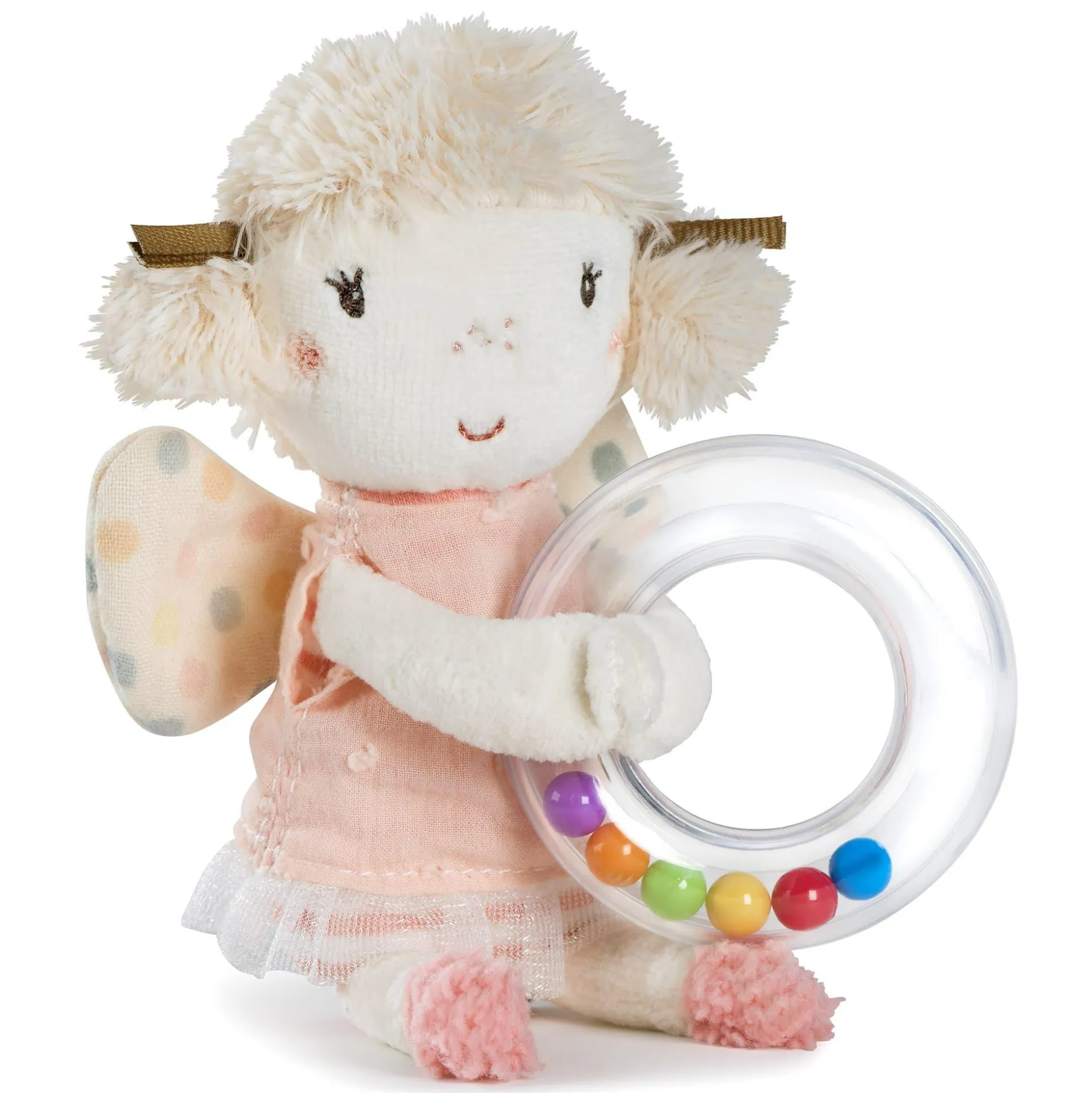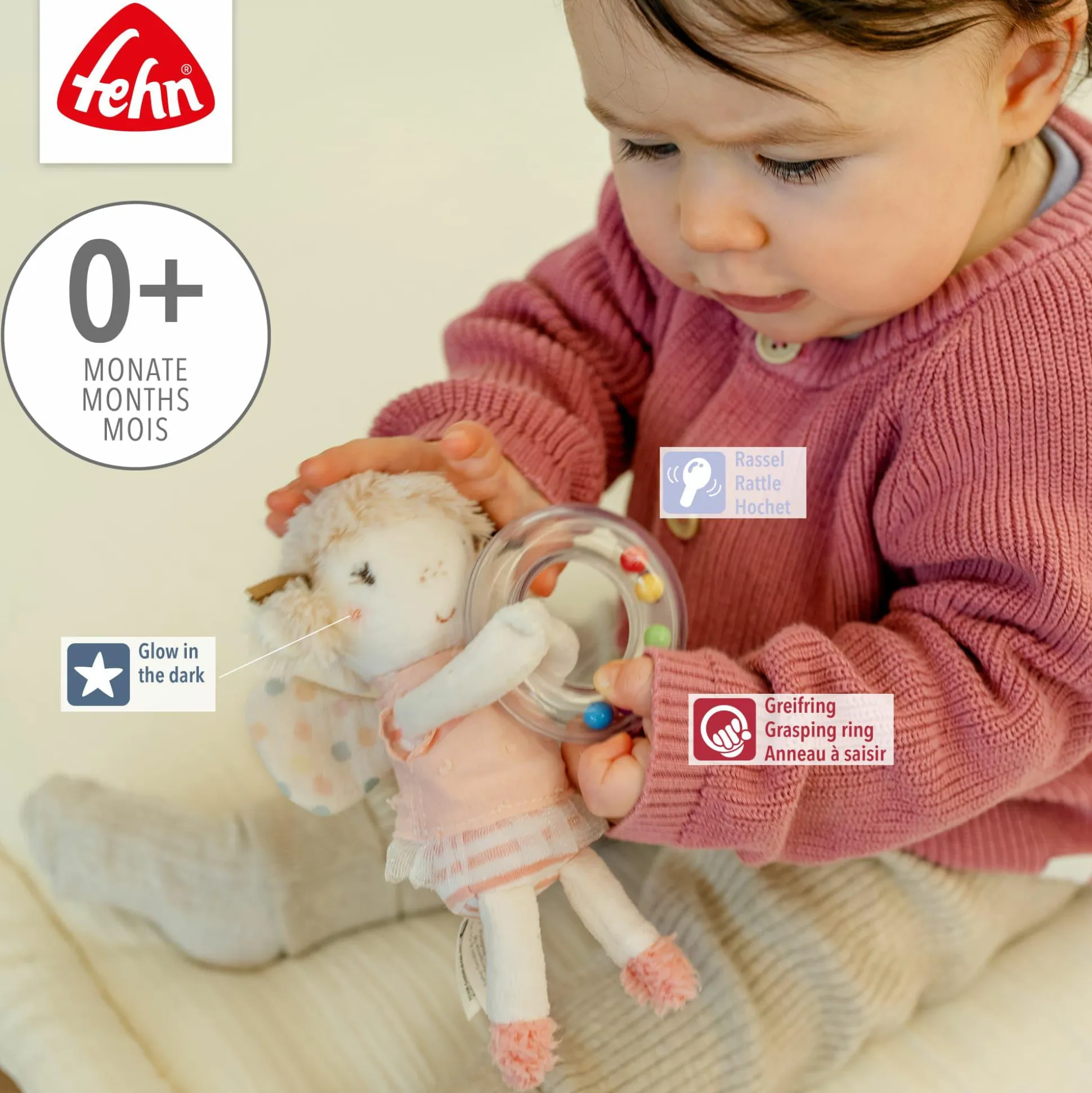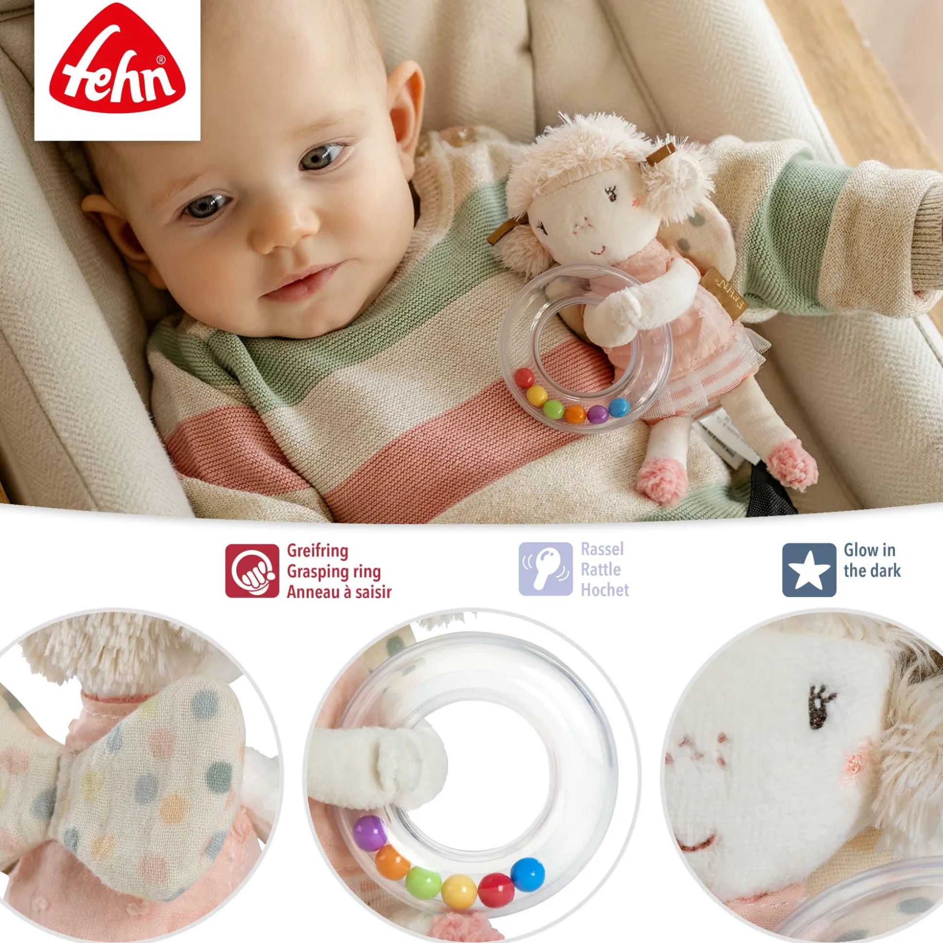 Der Rasselring Fee von fehn ist ein liebevoll gestalteter Greifling für Babys und Kleinkinder. Mit einer süßen Fee, „Glow-in-the-dark“-Bestickung und Perlen im Griff fördert das Spielzeug den Hör-, Greif- und Tastsinn sowie die Feinmotorik. Er ist leicht zu greifen, animiert zum Schütteln und Spielen und ist ideal für zu Hause oder unterwegs.