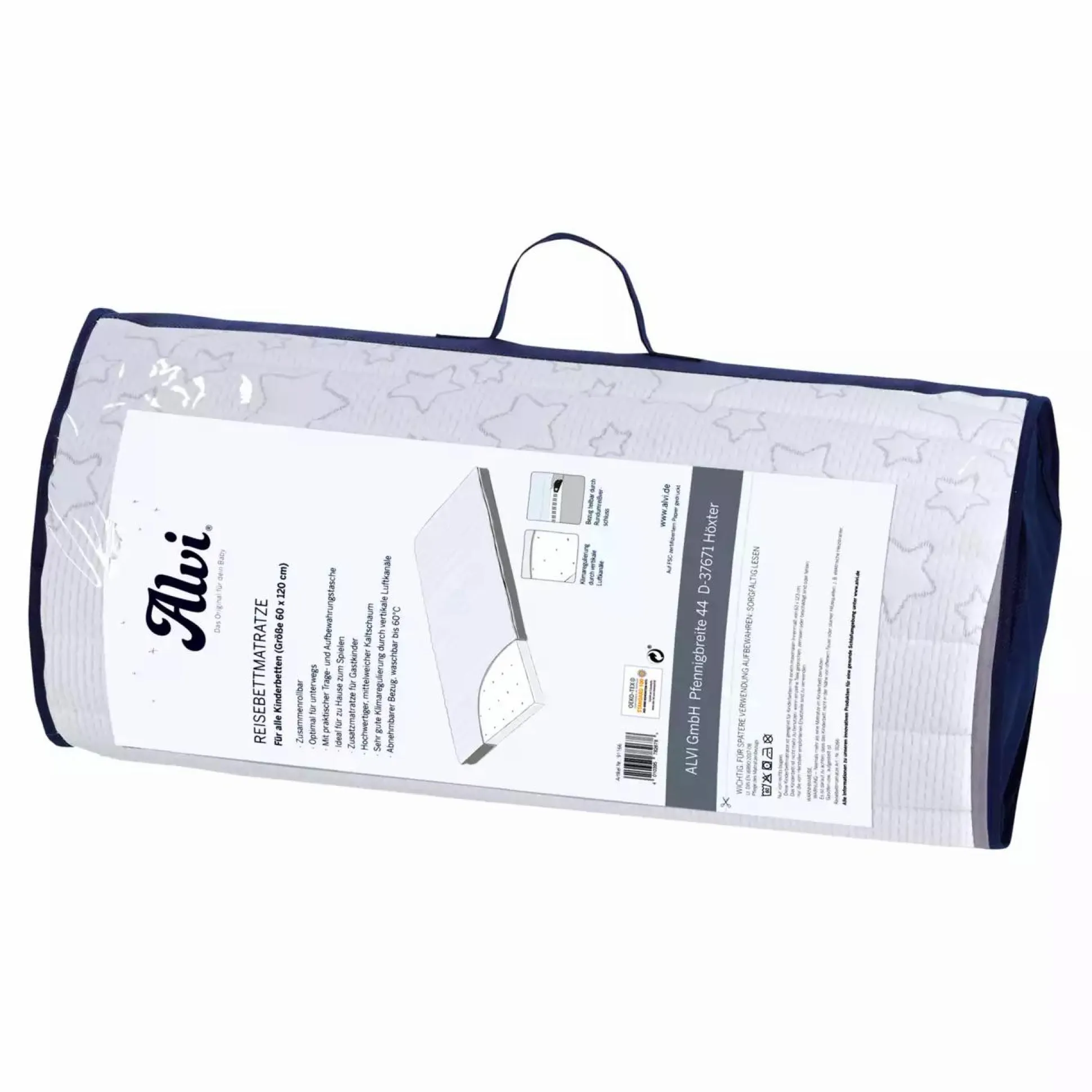 Die Alvi Reisebettmatratze ist für alle Kinderbetten mit einem maximalen Innenmaß von 63 x 123 cm geeignet und zusammenrollbar – so kann sie bei Nichtgebrauch einfach in der mitgelieferten Tragetasche aufbewahrt werden.