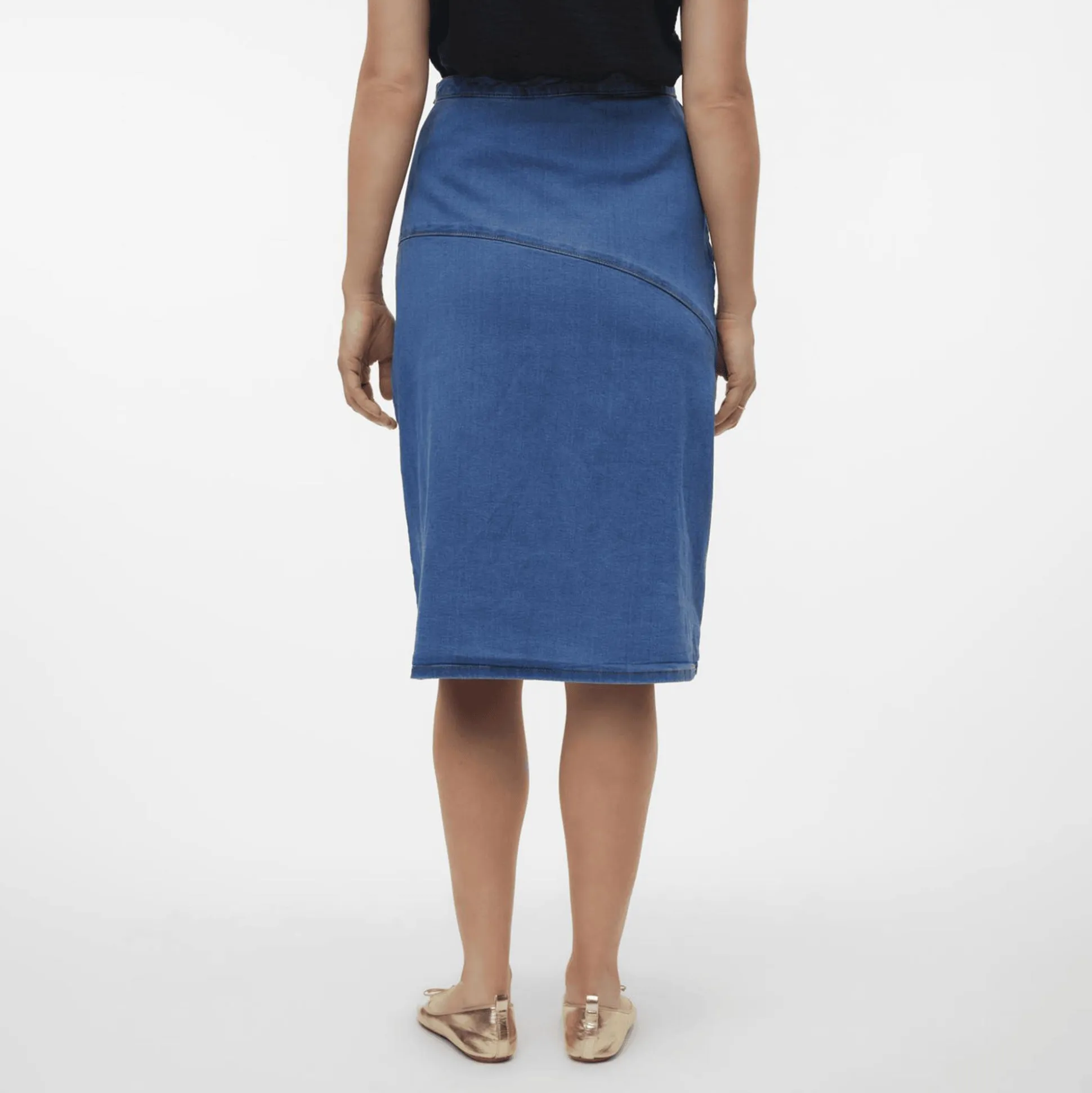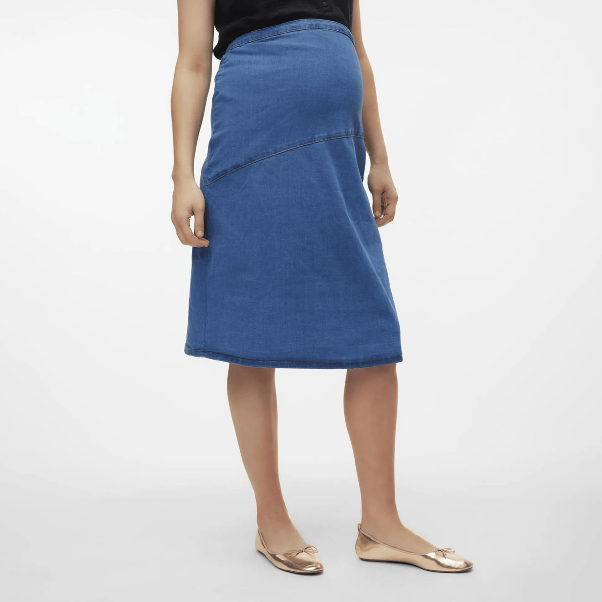 Kombiniere deine Lieblingsoberteile und Blusen mit diesem coolen Mamalicious Jeansrock Medium Blue Denim. Der knielange Umstands-Rock im sanft gewaschenen dunklen Denim-Look schmiegt sich perfekt an deinen wachsenden Bauch an und kreiert einen bequemen sowie luftigen Look, der immer passt. Der seitliche Reißverschluss erleichtert dir zudem das An- und Ausziehen und das Bauchband, das deinen Babybauch bedeckt, bietet zusätzlichen Komfort und Halt.